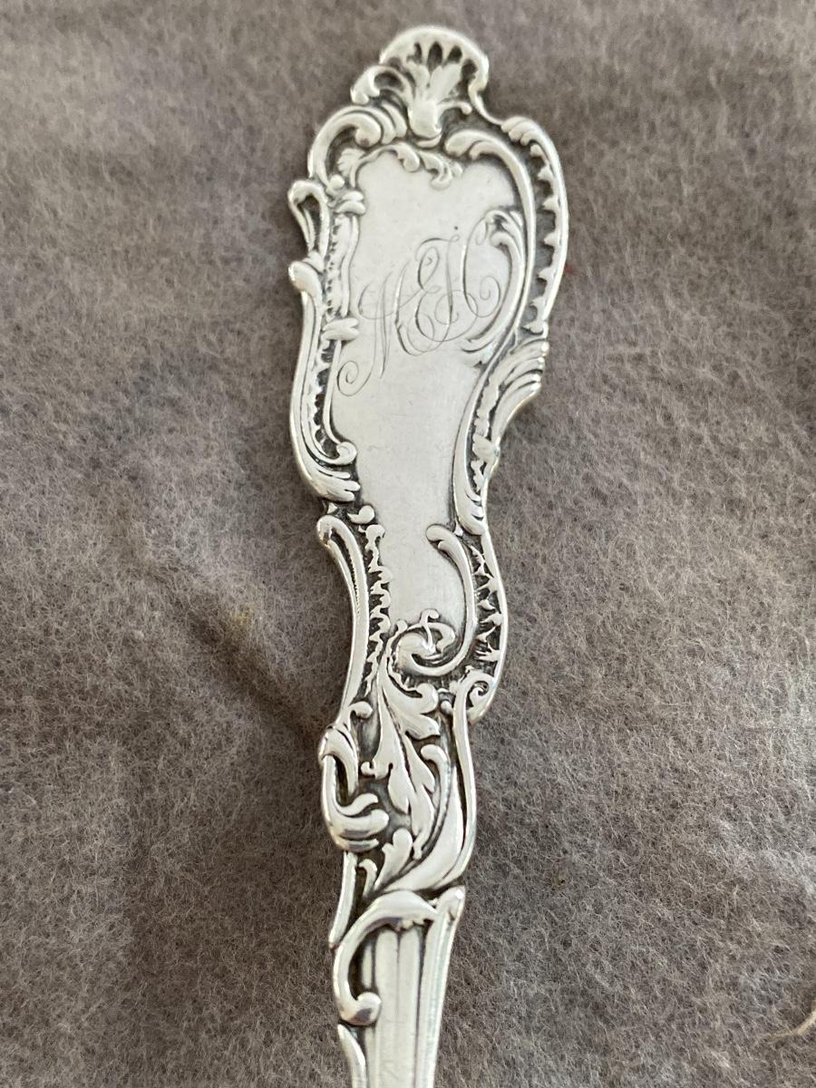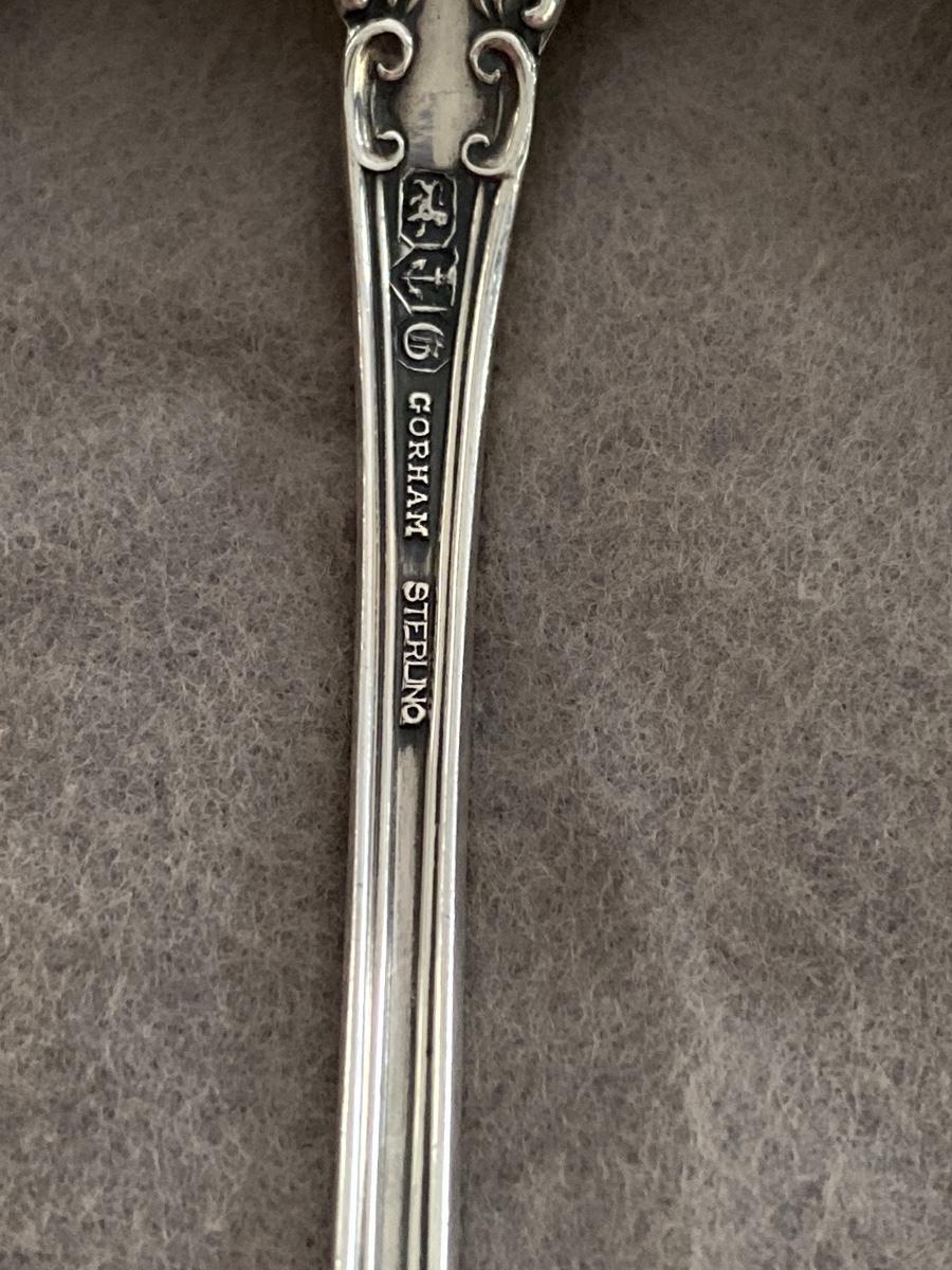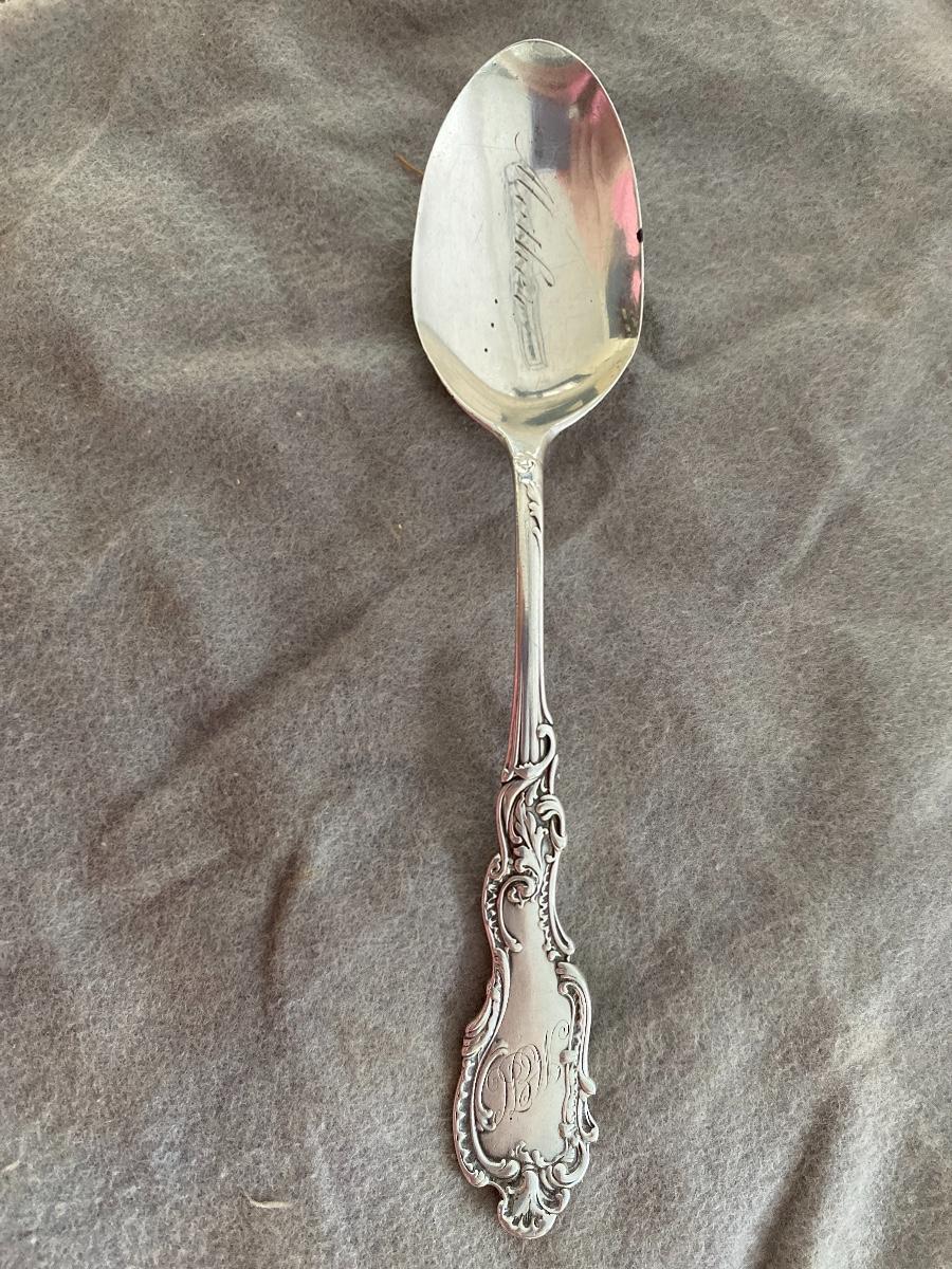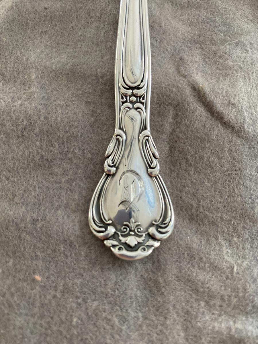 A monogrammed sterling silver long spoon stamped Sterling. It measures 8 inches long and weighs 44.9 grams and 28.8 dwt.