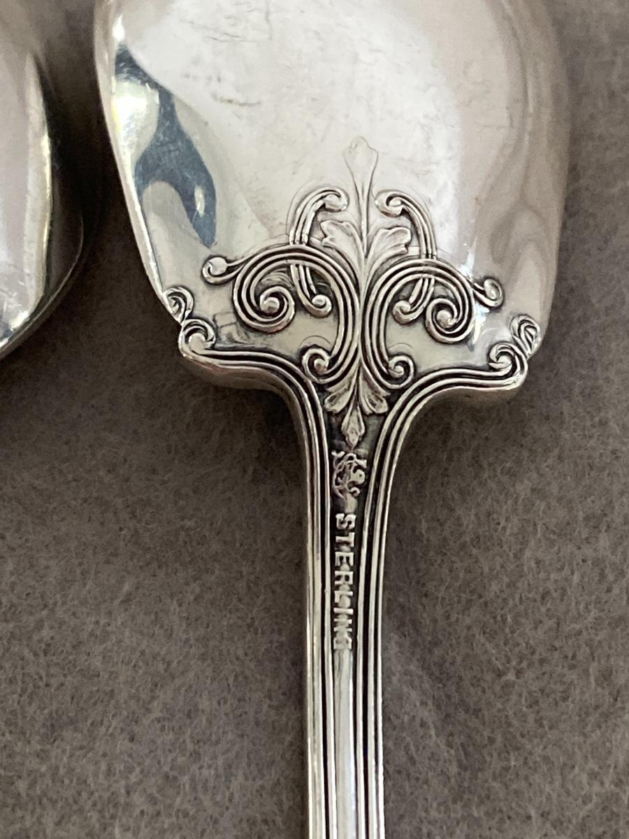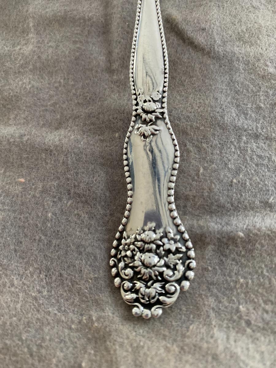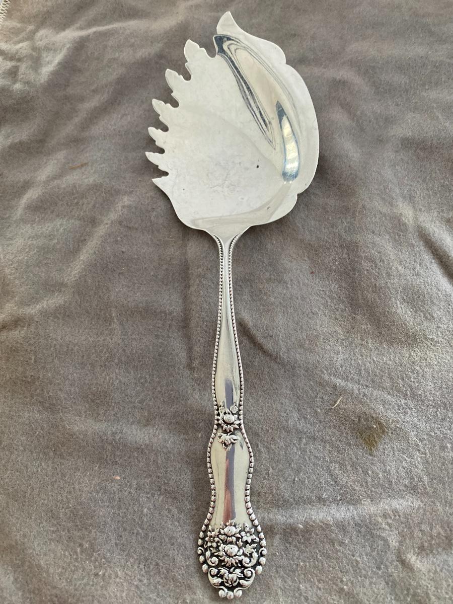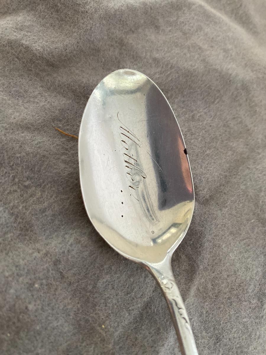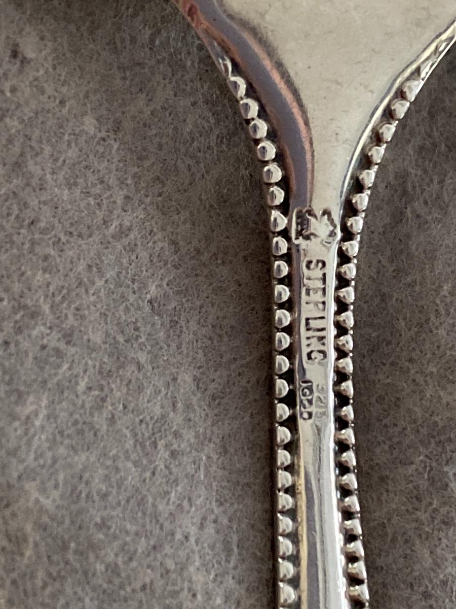 A monogrammed sterling silver long spoon stamped Sterling. It measures 8 inches long and weighs 44.9 grams and 28.8 dwt.