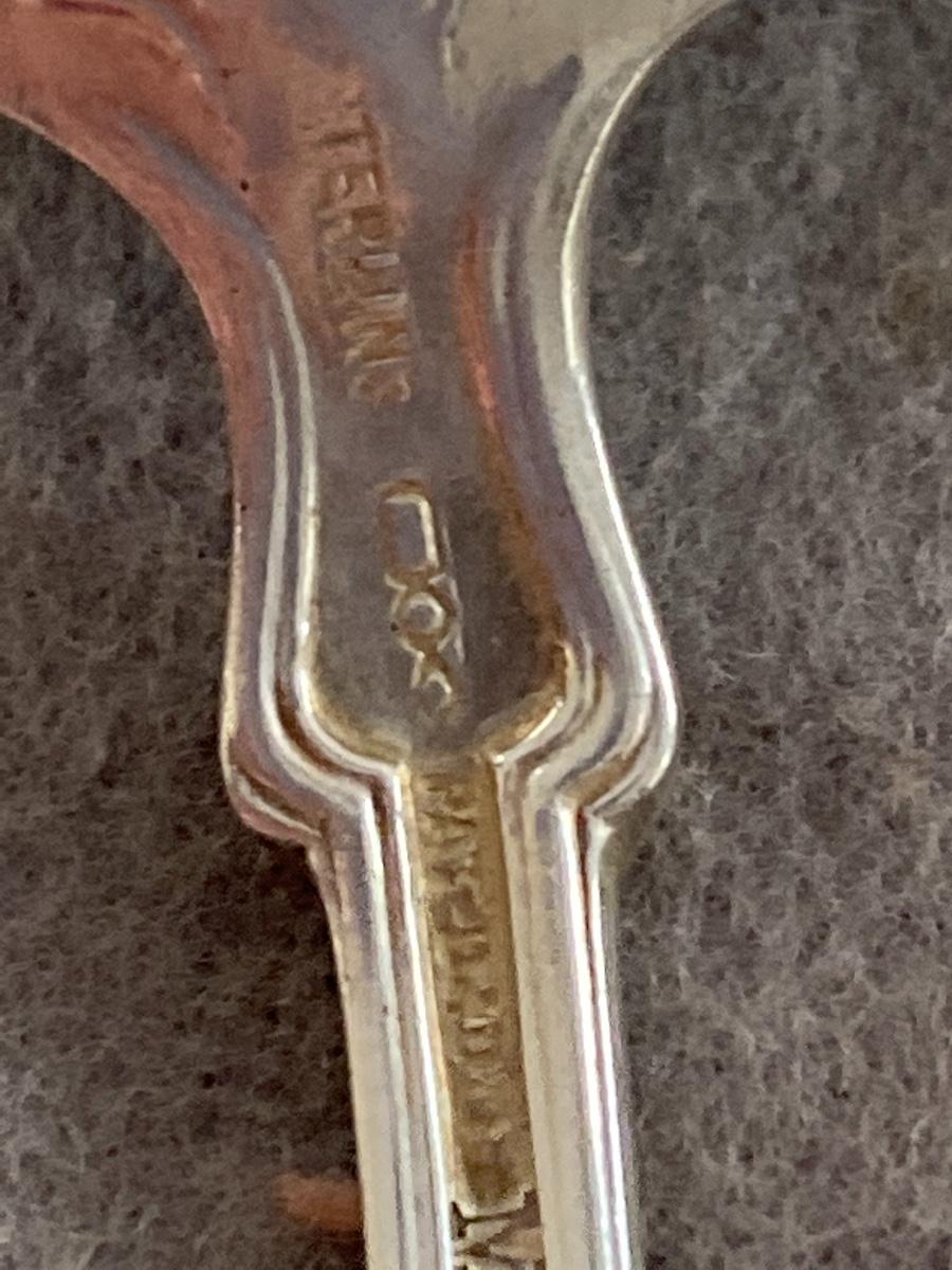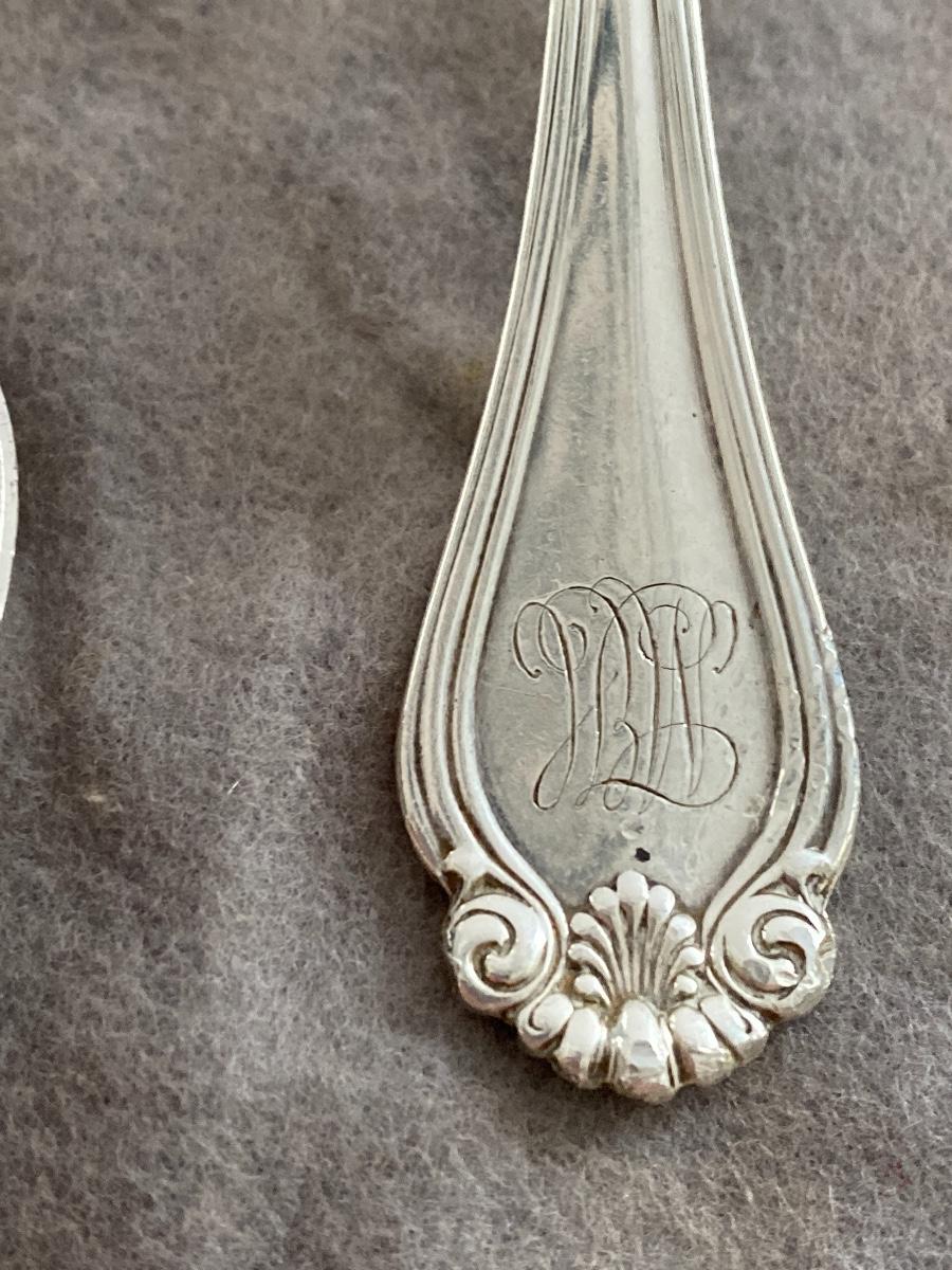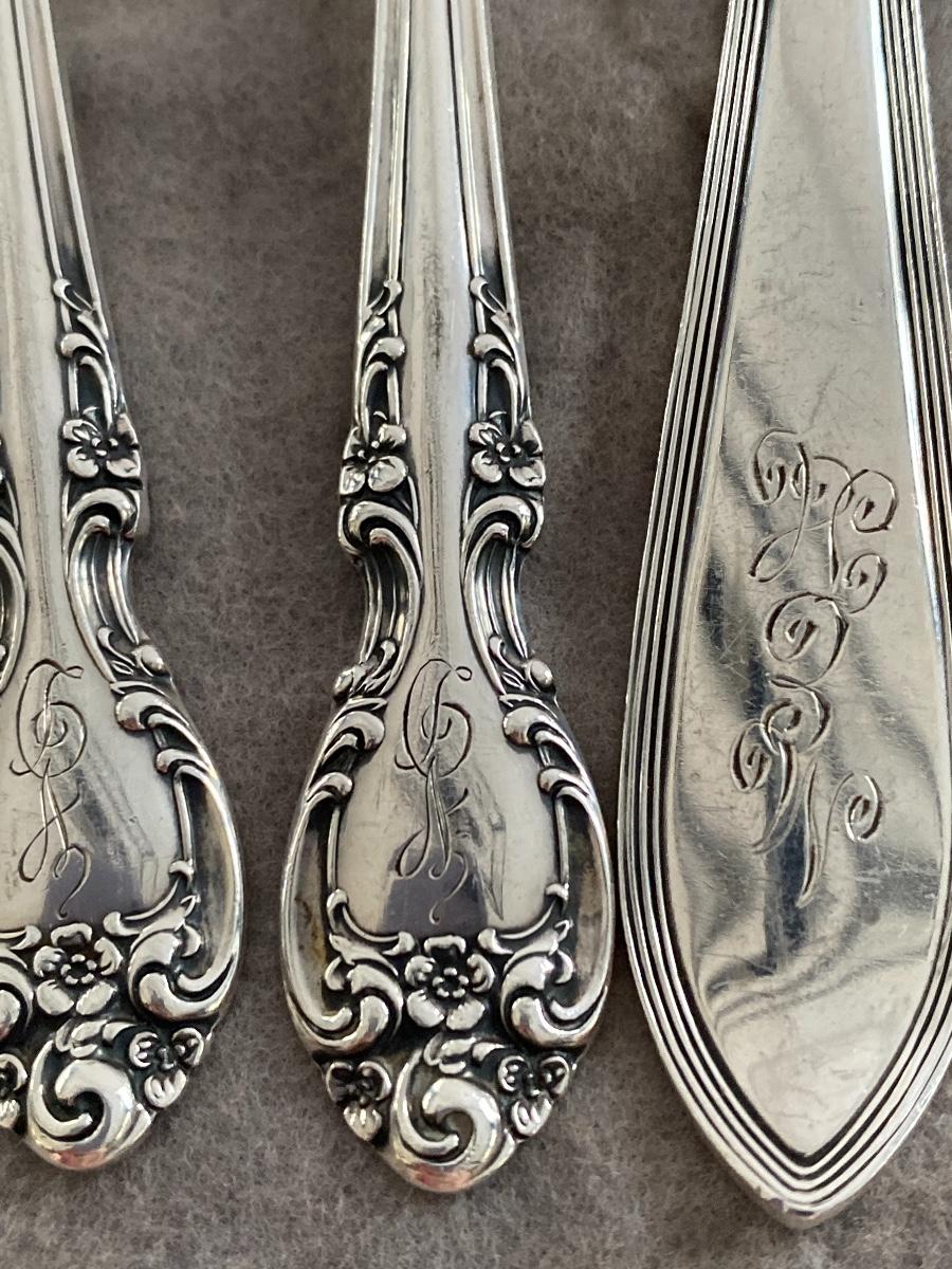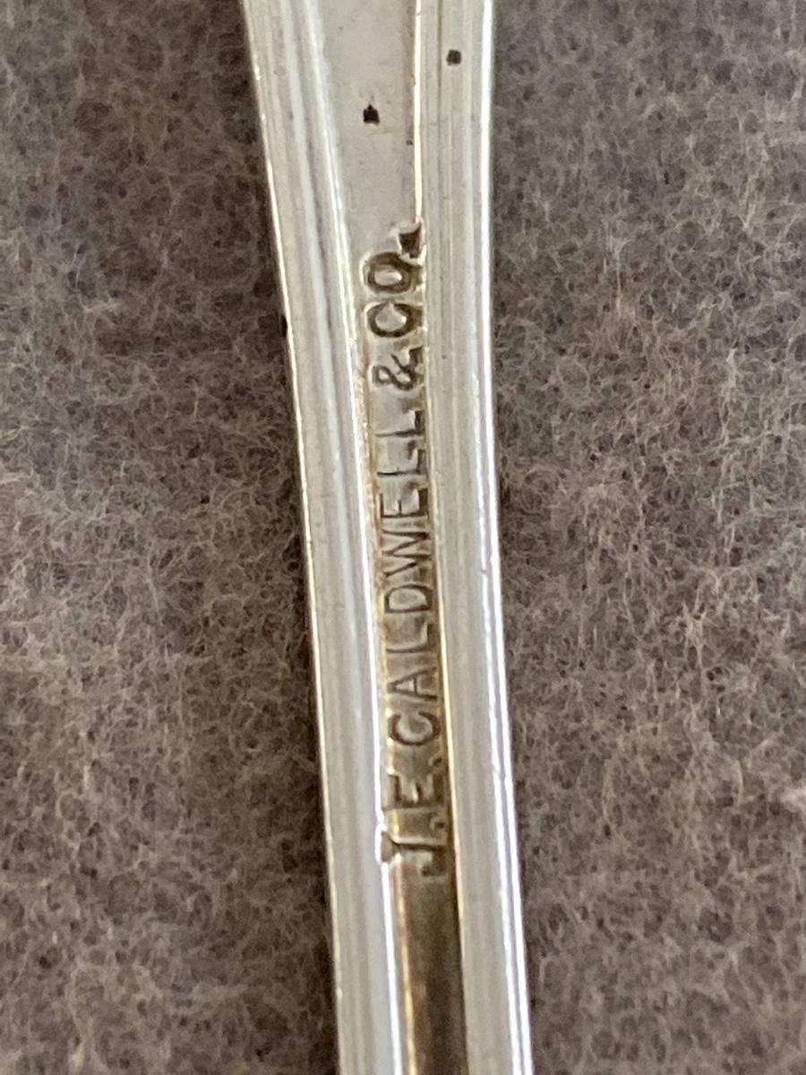 A group of misc. sterling silver flatware including: a pair of monogrammed sterling silver teaspoons stamped JE CALDWWELL & CO STERLING. Each spoon measures 6 inches long and the total weight of both spoons is 59.6 grams and 38.3 dwt. There is damage to the two spoons.