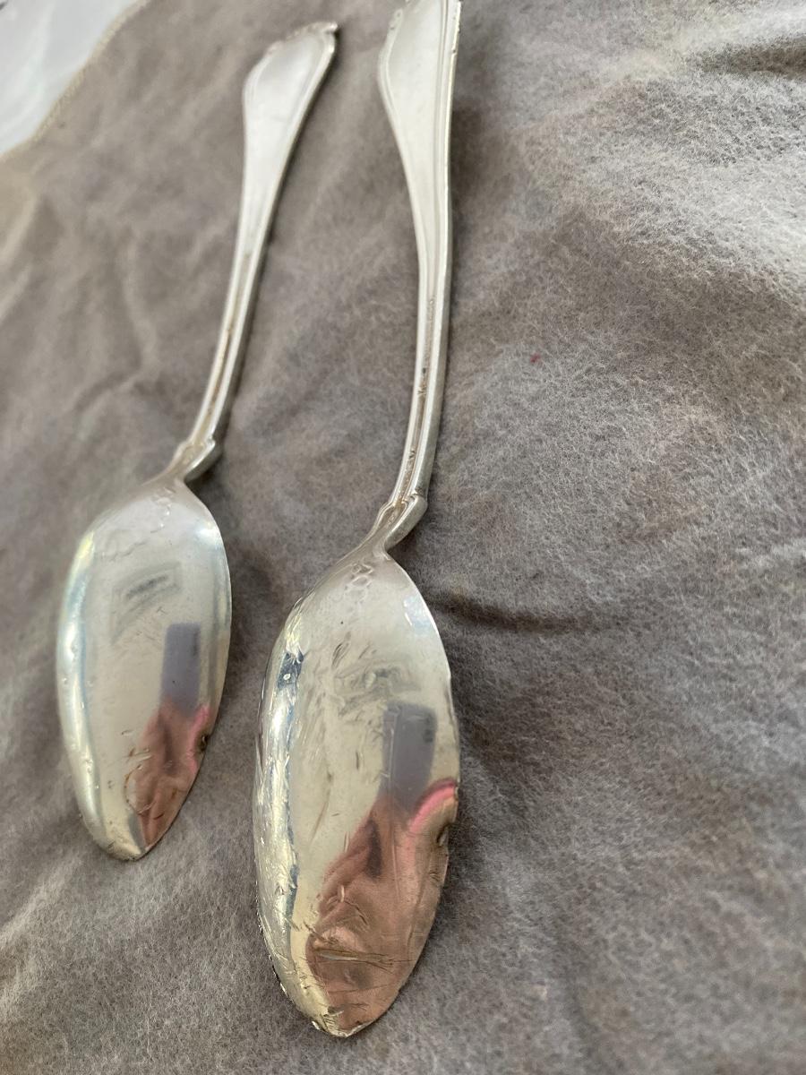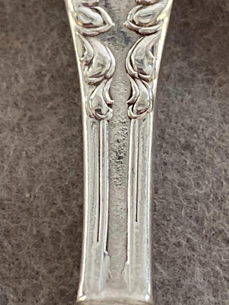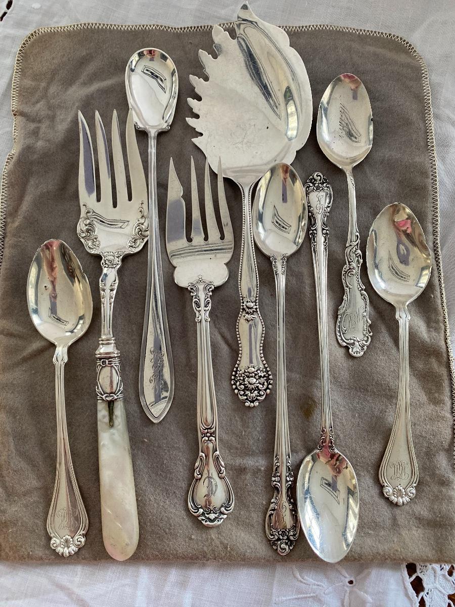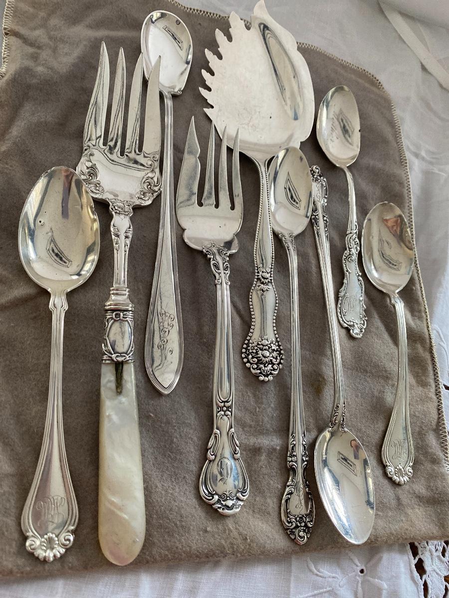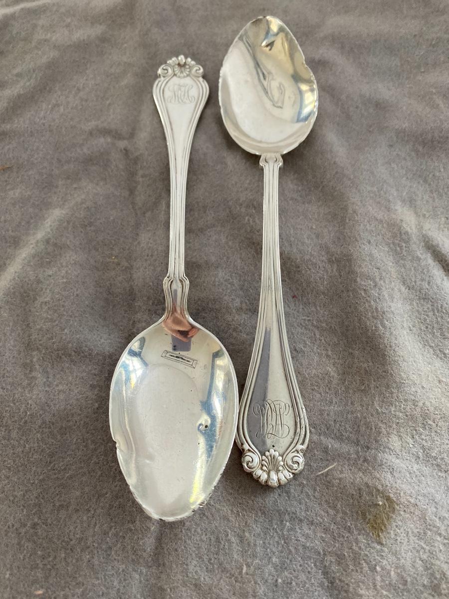 A group of misc. sterling silver flatware including: a pair of monogrammed sterling silver teaspoons stamped JE CALDWWELL & CO STERLING. Each spoon measures 6 inches long and the total weight of both spoons is 59.6 grams and 38.3 dwt. There is damage to the two spoons.