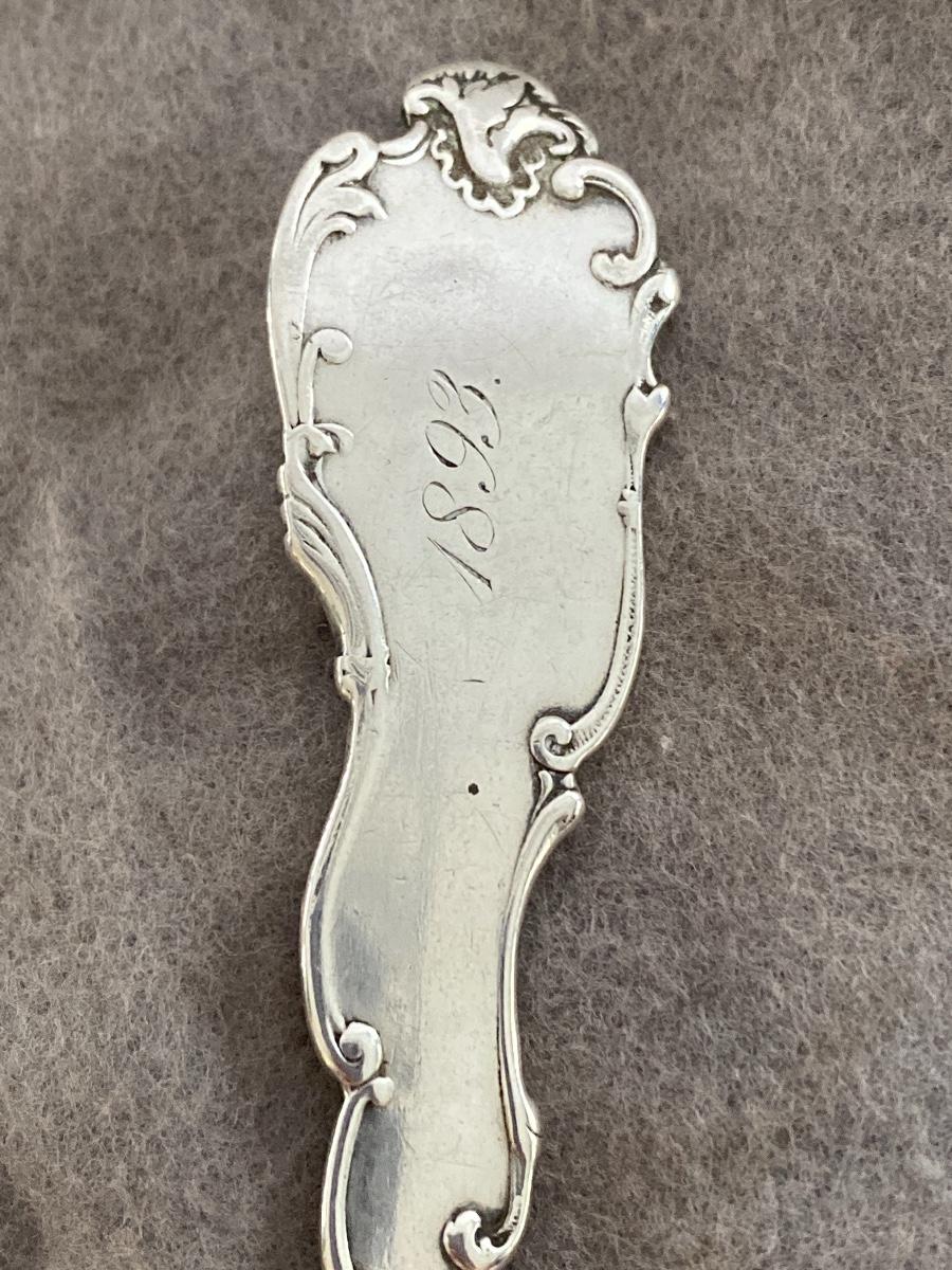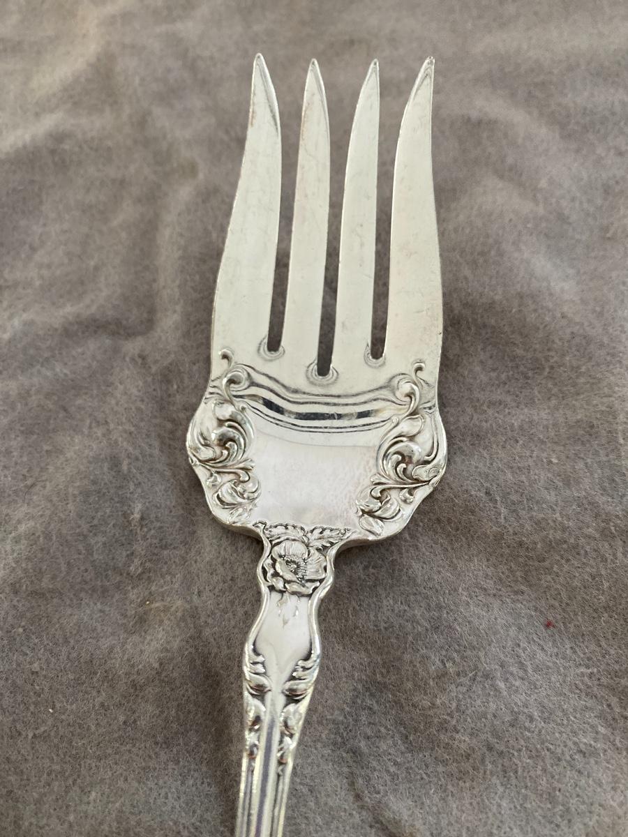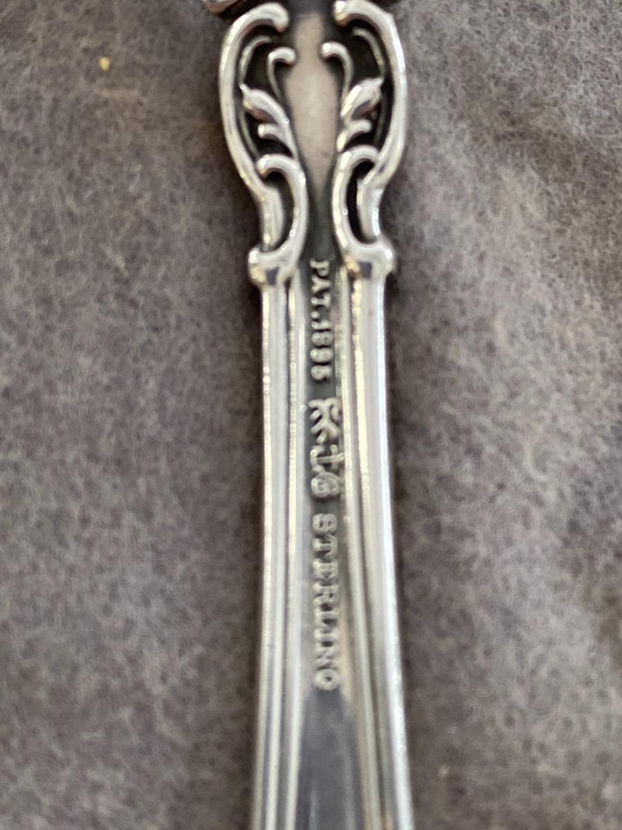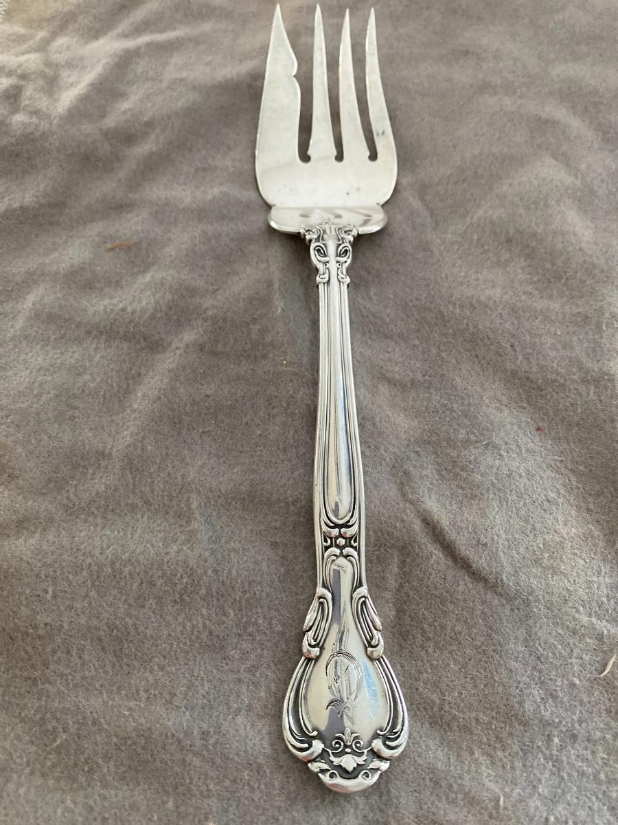 A monogrammed serving fork stamped PAT 1895 STERLING with Gotham hallmarks. It measures 7 inches long and weighs 47.3 grams and 30.4 dwt.