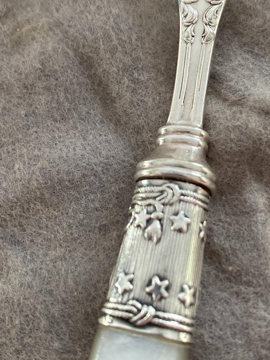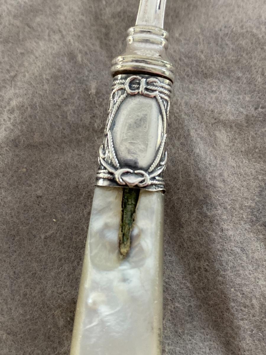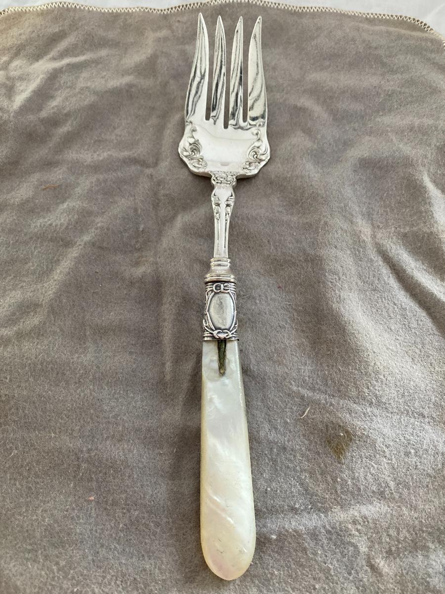 A serving fork with a damaged mother of pearl handle. It is not stamped and Might not be sterling. It is 8 inches long and weighs 67.3 grams and 43.3 dwt.