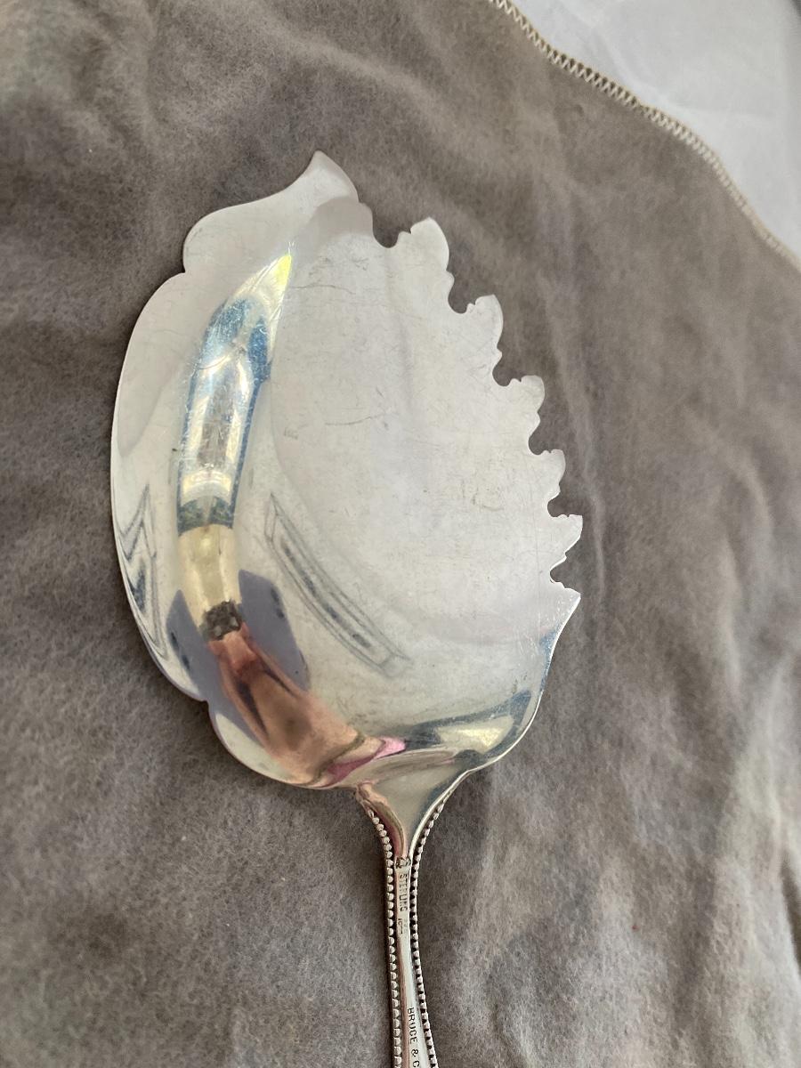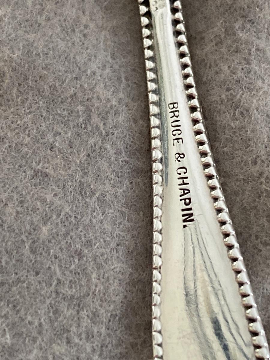 A sterling silver fish server stamped STERLING BRUCE & CHAPIN. It measures 8 1/2 inches long and weighs 46.1 grams and 29.6 dwt.