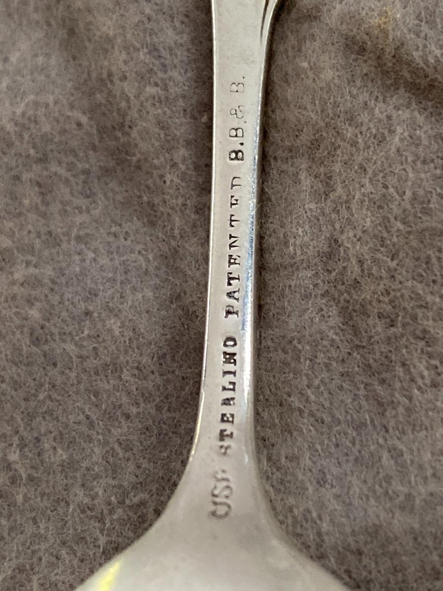 A monogrammed sterling silver tea spoon engraved with the word Mother. Stamped STERLING PATENT ED B B & B. It measures 5 1/2 inches long and weighs 23.5 grams and 15.1 dwt.