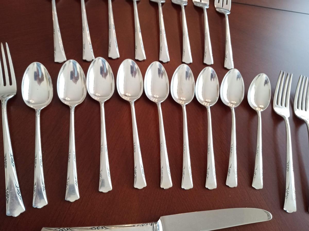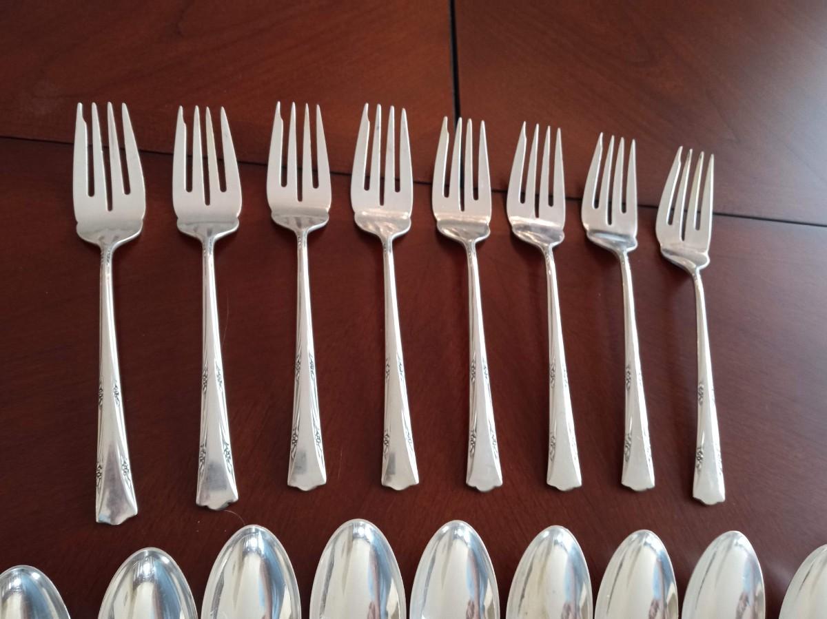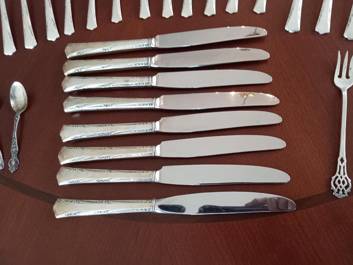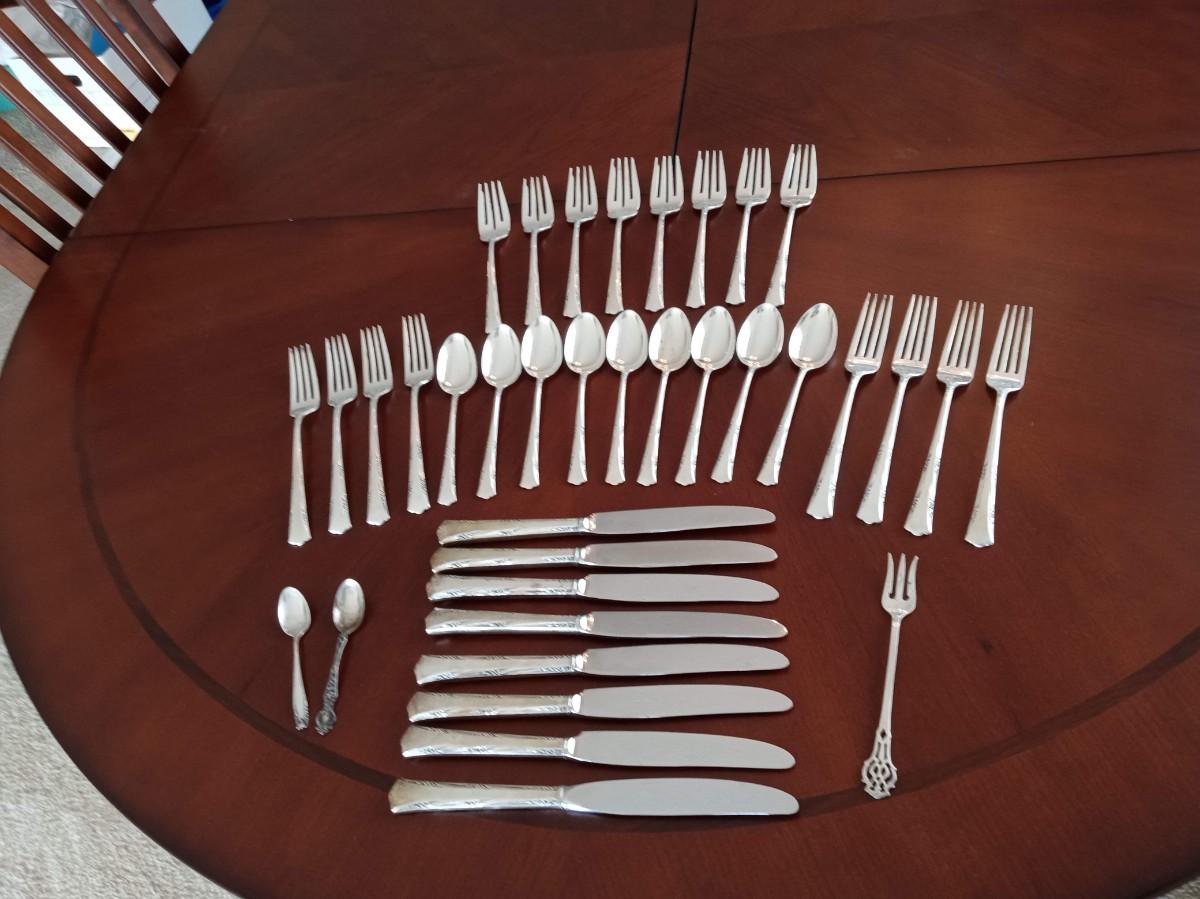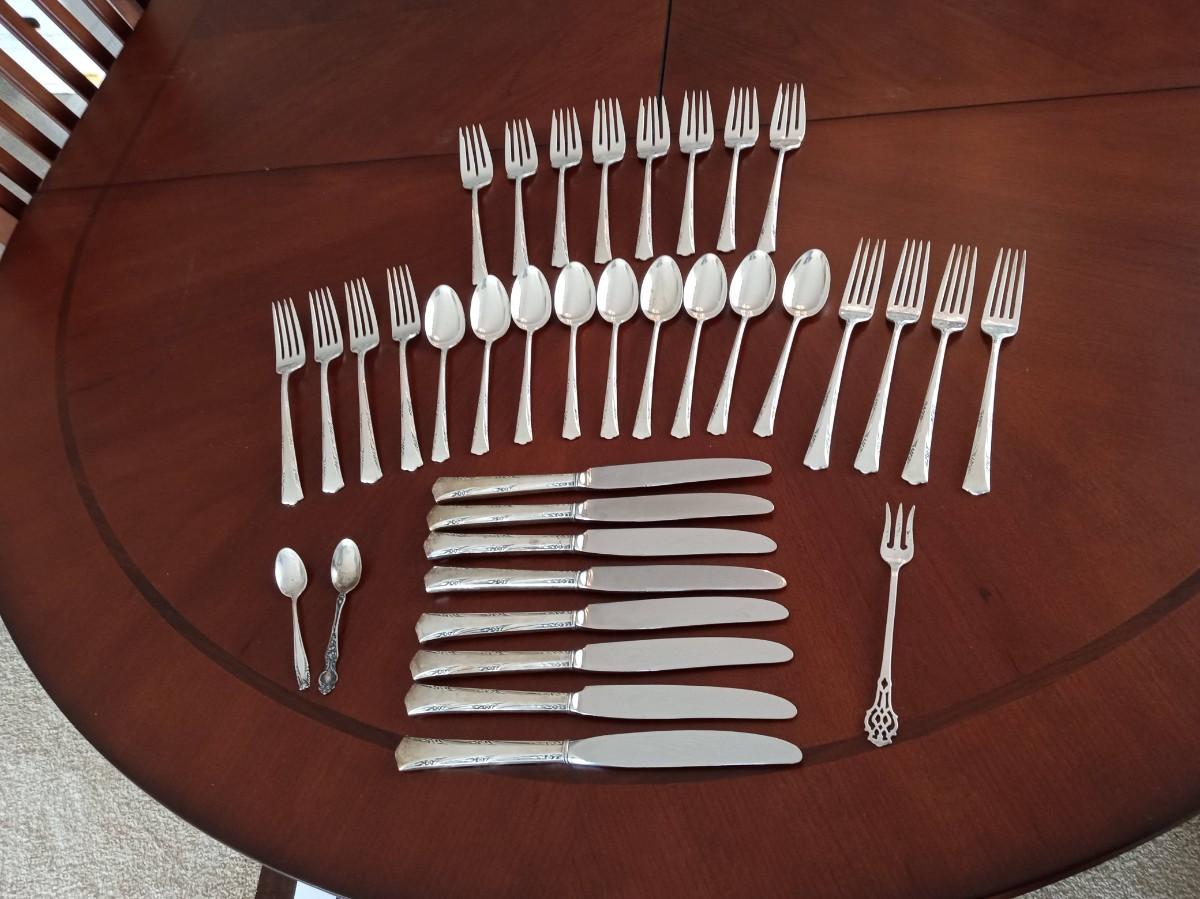 8 SALAD AND 8 DINNER FORKS, 8 KNIVES, 9 TEASPOONS, NO TABLESPOONS, 3 EXTRA STERLING PIECES