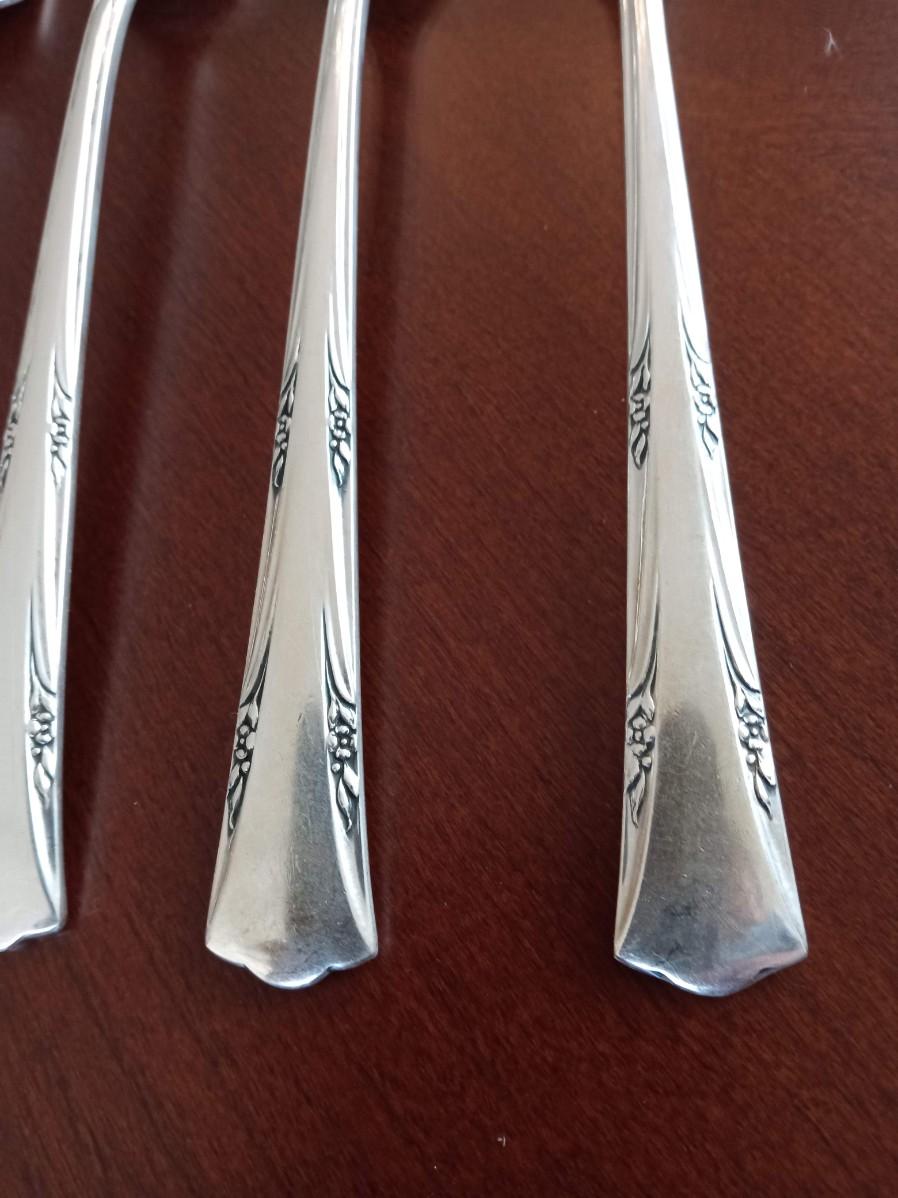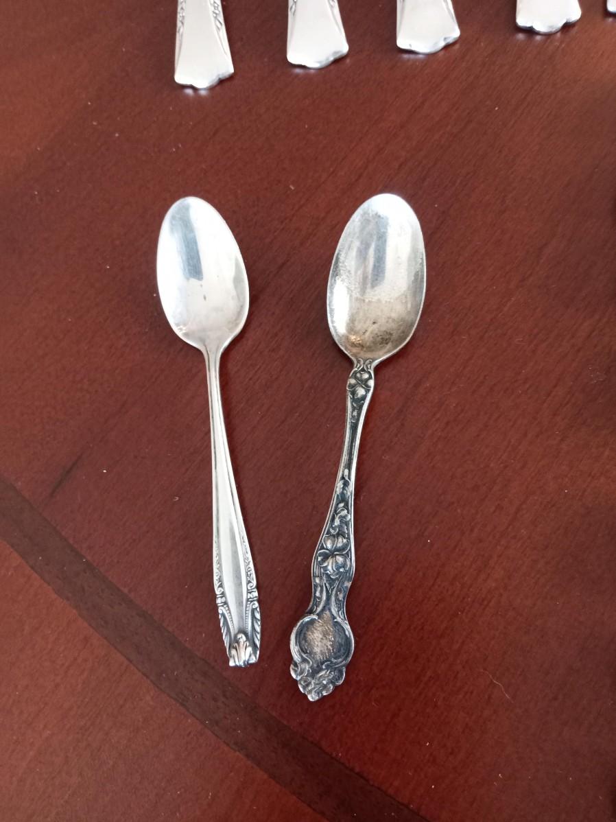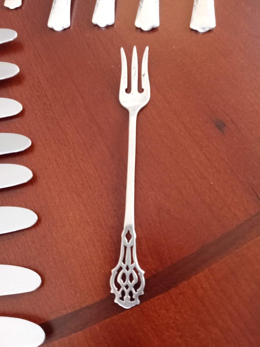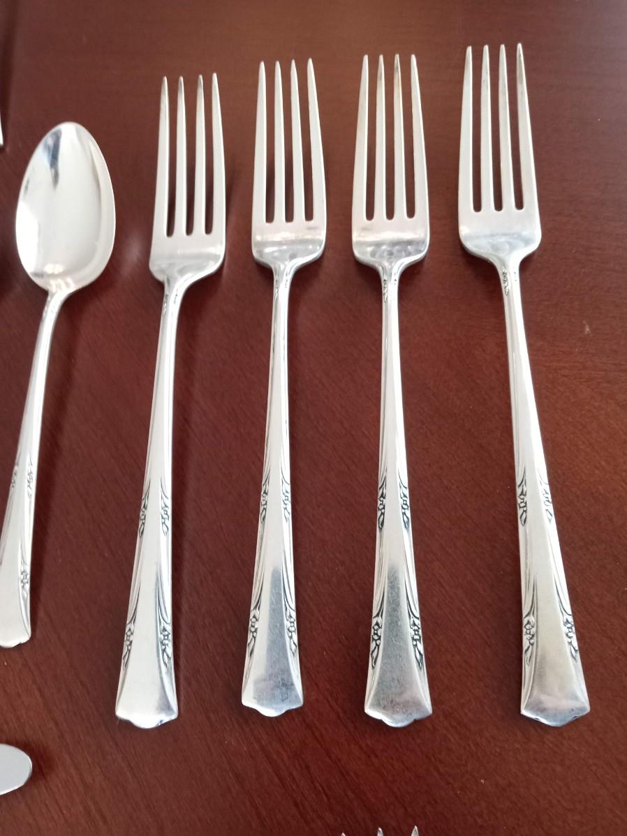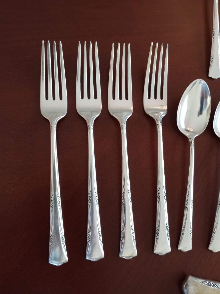 8 SALAD AND 8 DINNER FORKS, 8 KNIVES, 9 TEASPOONS, NO TABLESPOONS, 3 EXTRA STERLING PIECES