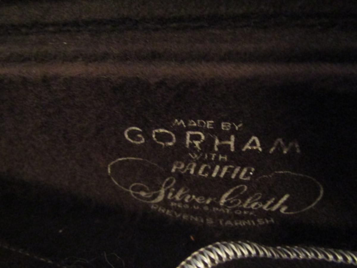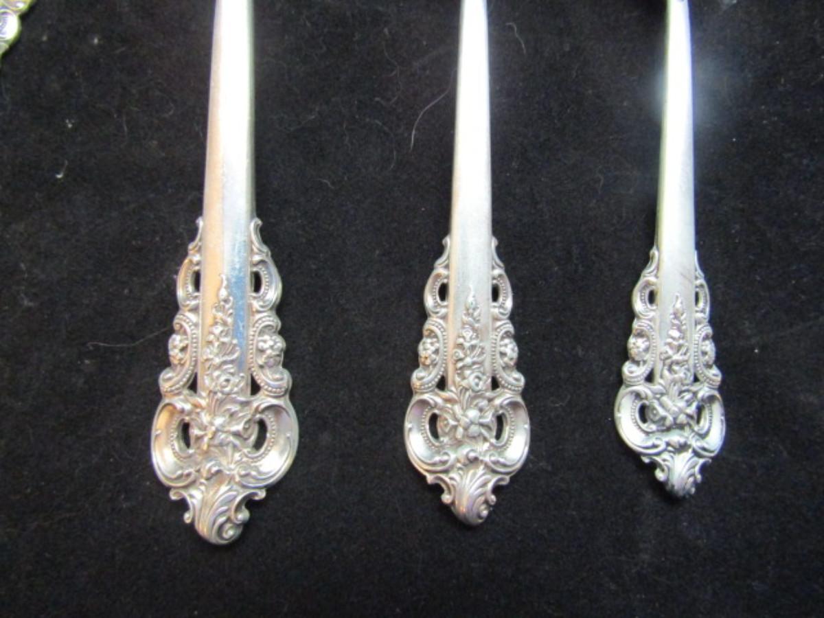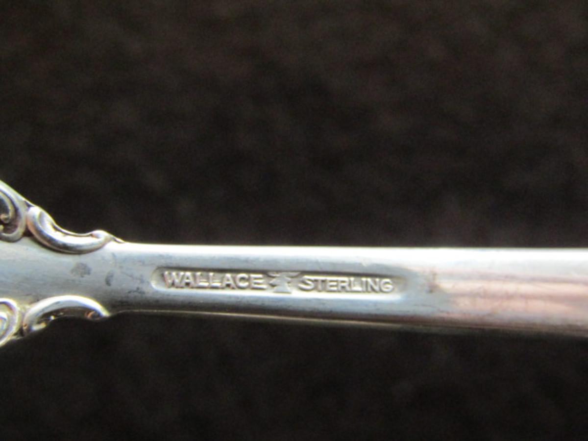 Sterling Silver Flatware by Wallace- Approx 57 Pieces. List of each type of piece, number of pieces, and approx combined weight of each type of piece: Dinner knives (8 pcs)- approx weight 679 grams, Butter knives (8 pcs)- approx weight 262 grams, Salad forks (8 pcs)- approx weight 355 grams, Dinner forks (8 pcs)- approx weight 540 grams, Spoons (8 pcs)- approx weight 267 grams, Soup spoons (8 pcs)- approx 362 grams, Seafood forks (8 pcs)- approx 199 grams, Fish fork ( pc)- approx weight 45 grams. Total approx weight for entire set: 2709 grams. Dinner knives may have stainless steel blades and sterling handles.