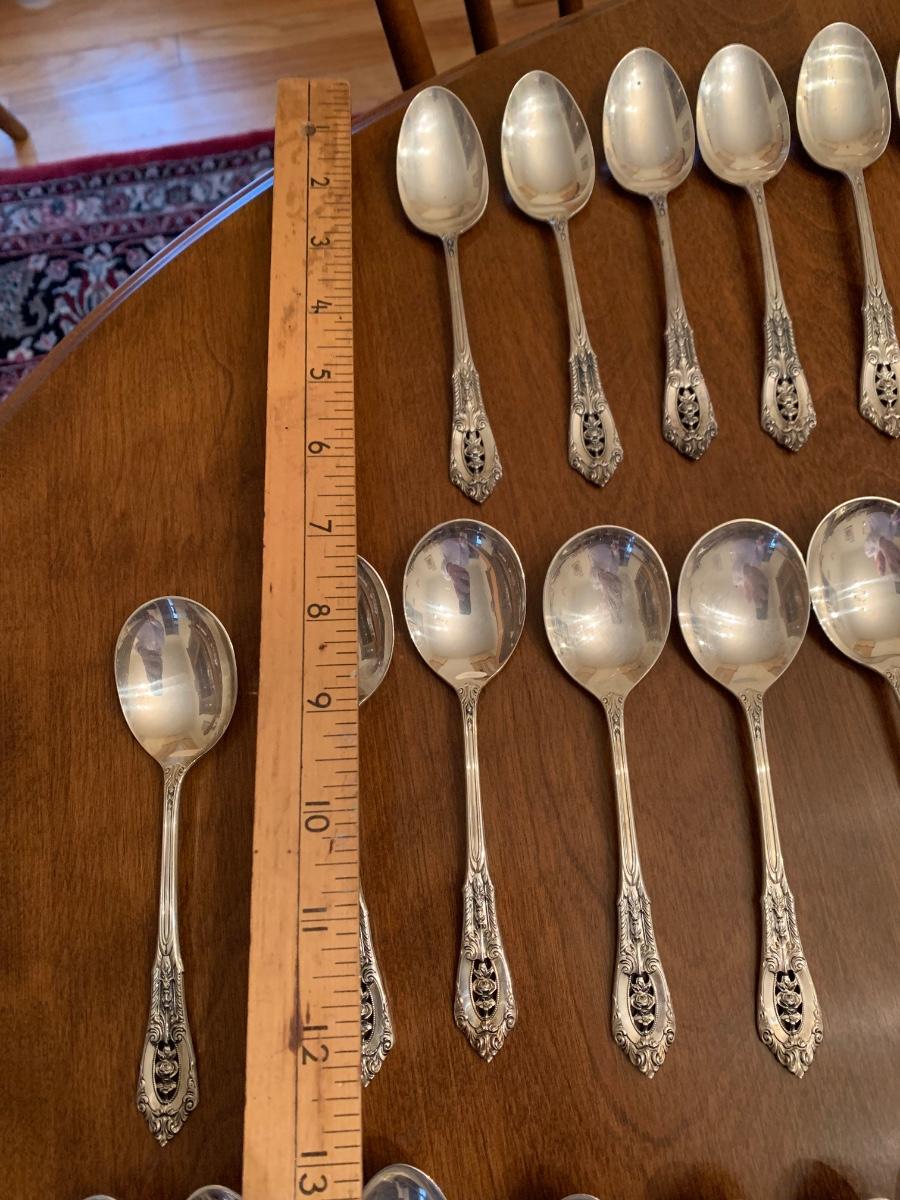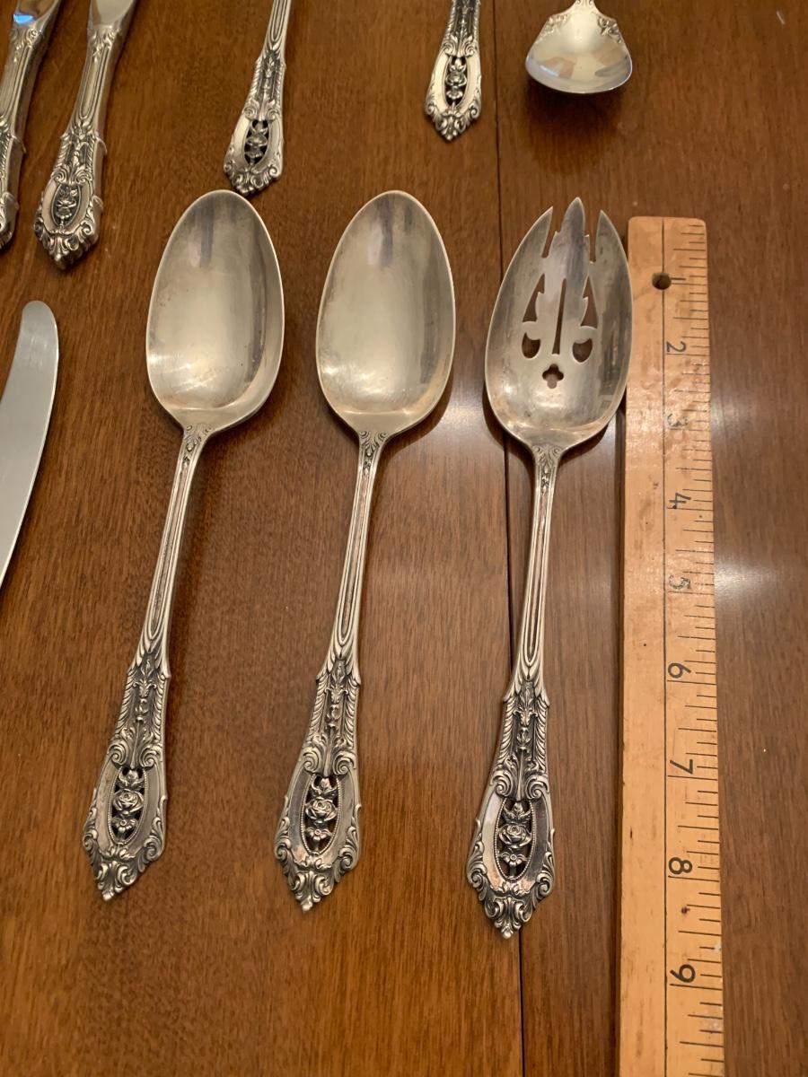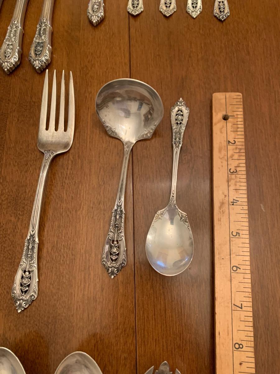This set of sterling silver flatware is in fantastic condition. Service for 12 + many rare & unusual serving pieces. 97 pieces total. 2525 grams plus 26 handled pieces. 12 dinner forks, 12 salad forks, 24 teaspoons, 12 round cream soup spoons, 2 child's forks & spoon, 1 ladle, 1 sugar spoon, 1 serving fork, 2 serving spoons, 1 pierced serving spoon, 4 various condiment serving pieces, 12 handled butter knives, 12 handled dinner knives, 1 letter opener, 1 handled master butter/cheese. See all photos.