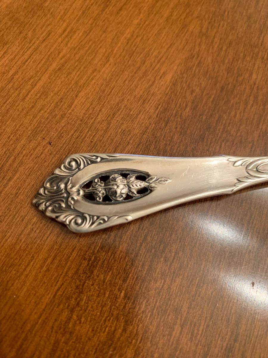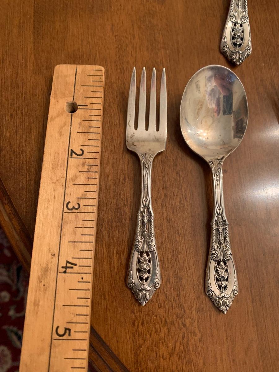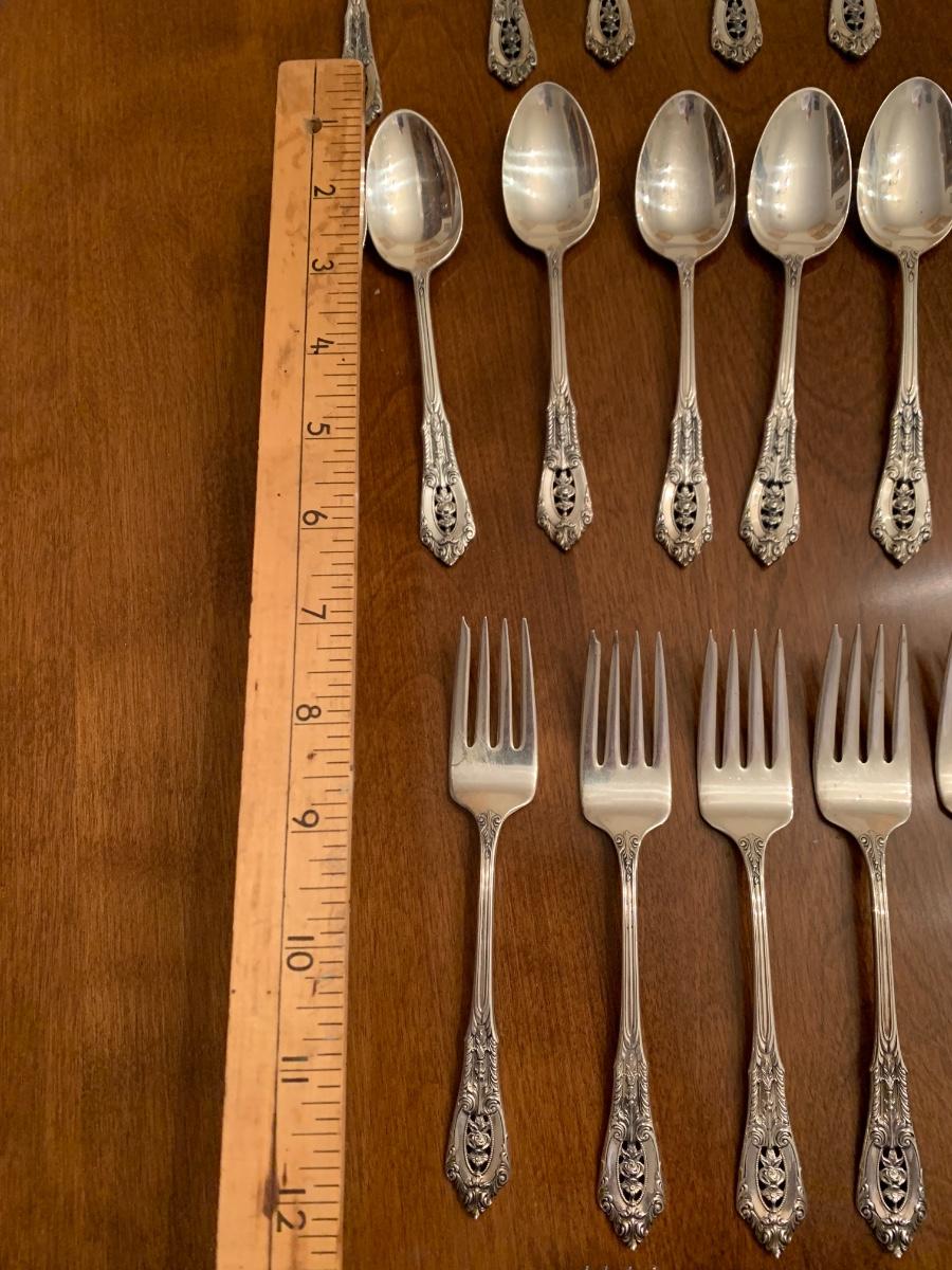 This set of sterling silver flatware is in fantastic condition. Service for 12 + many rare & unusual serving pieces. 97 pieces total. 2525 grams plus 26 handled pieces. 12 dinner forks, 12 salad forks, 24 teaspoons, 12 round cream soup spoons, 2 child's forks & spoon, 1 ladle, 1 sugar spoon, 1 serving fork, 2 serving spoons, 1 pierced serving spoon, 4 various condiment serving pieces, 12 handled butter knives, 12 handled dinner knives, 1 letter opener, 1 handled master butter/cheese. See all photos.