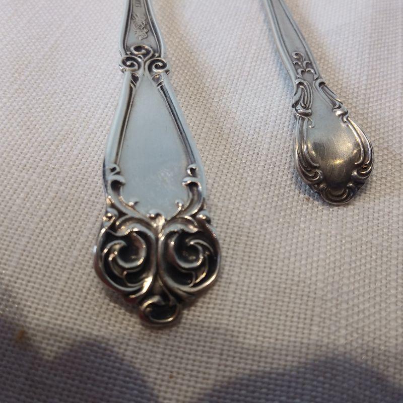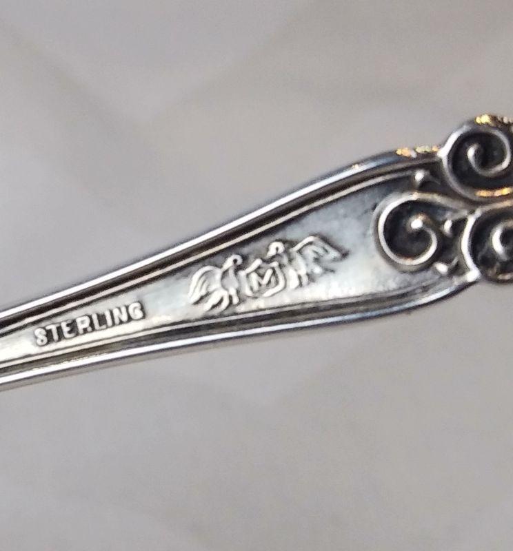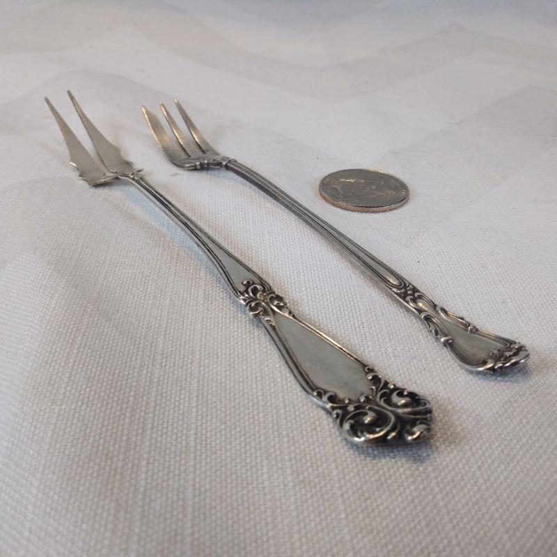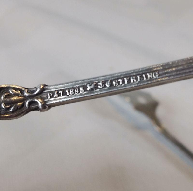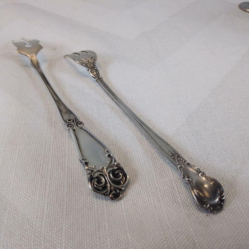 This auction lot is for a duo of Sterling Silver Serving Forks. The pair includes a pickle fork and a cocktail fork. One is marked "Patent 1895" - Sterling. The other is marked "M" flanked by 2 doves - believed to be Manchester Manufacturing - also marked Sterling. Both are in very good condition. The total weight is 24-grams on our scale. Note: the starting price is the reserve price.