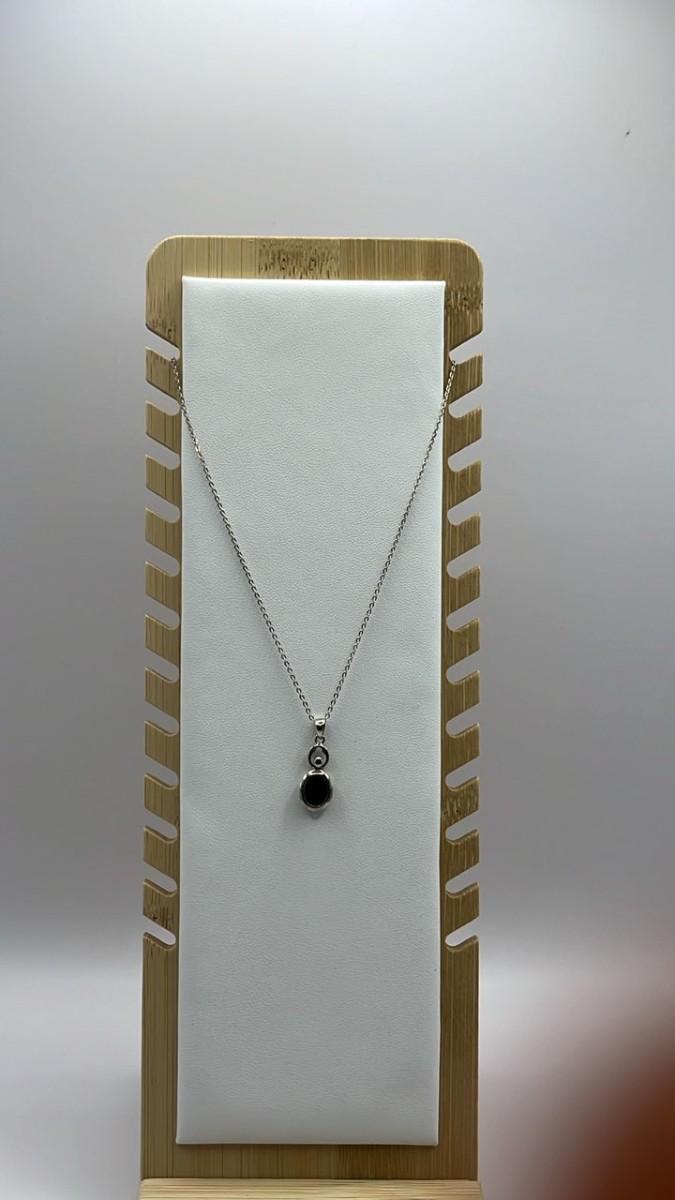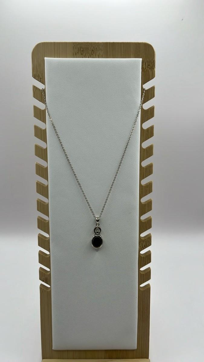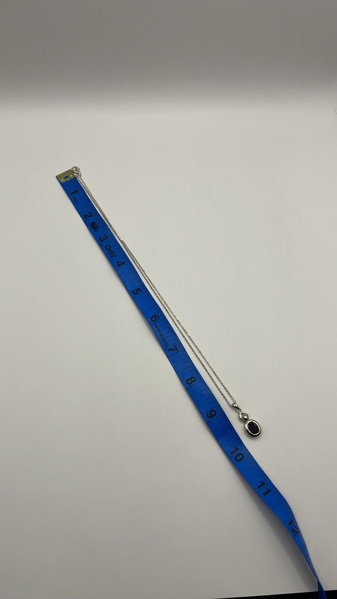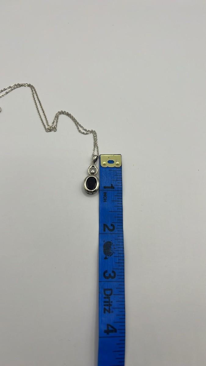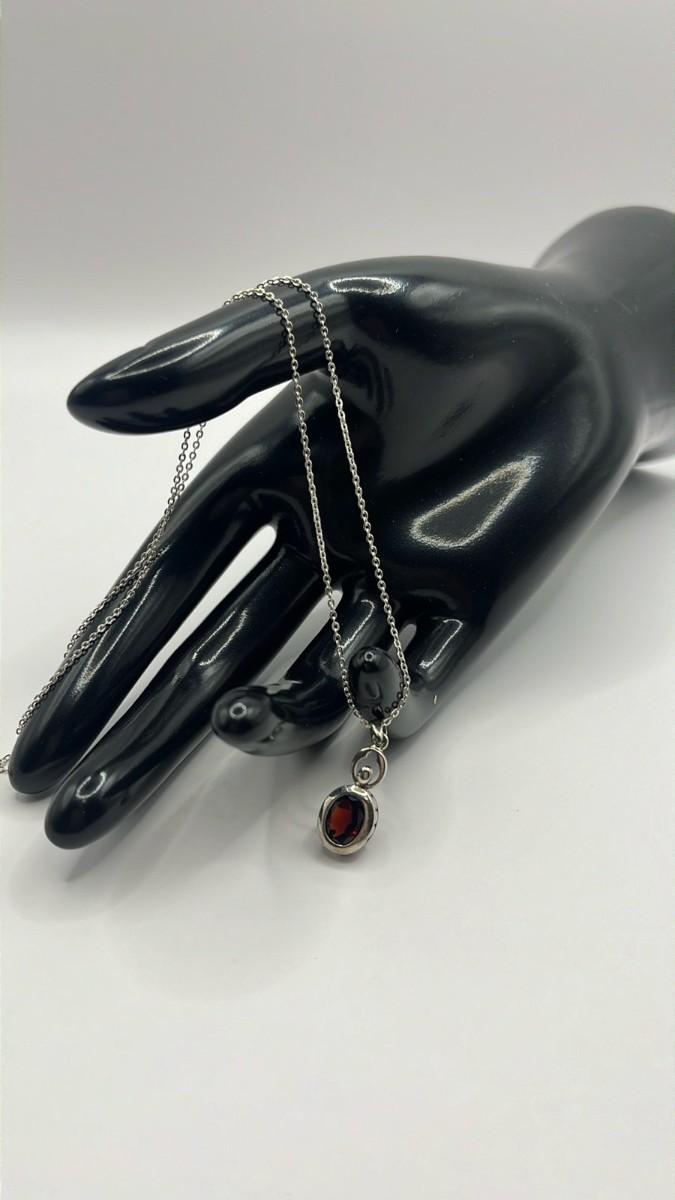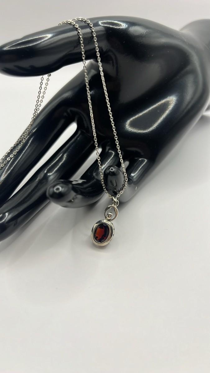 BEAUTIFUL STERLING SILVER PENDANT WITH GARNET-COLORED BEZEL SET STONE. THE CHAIN IS STERLING SILVER AND IS 18 IN LONG THE PENDANT IS APPROX 1 INCH IN LENGTH