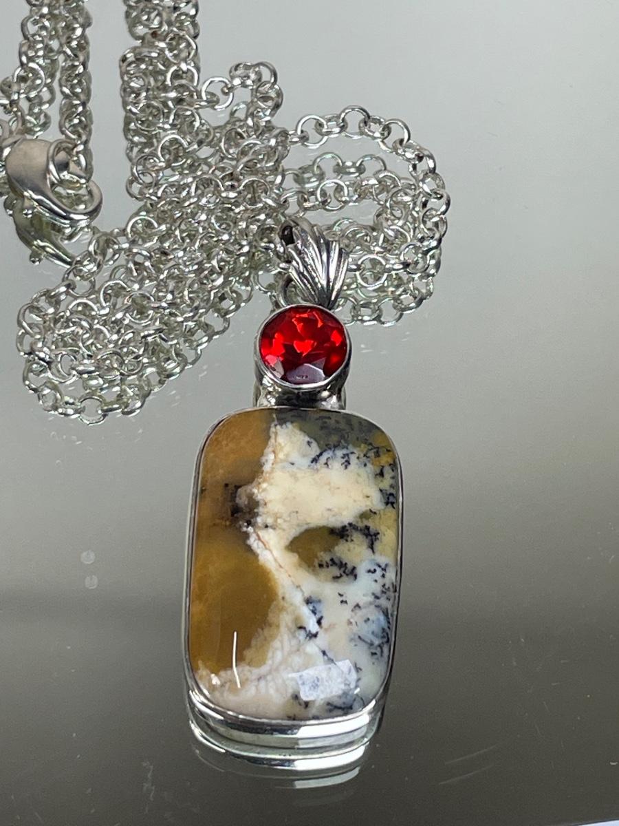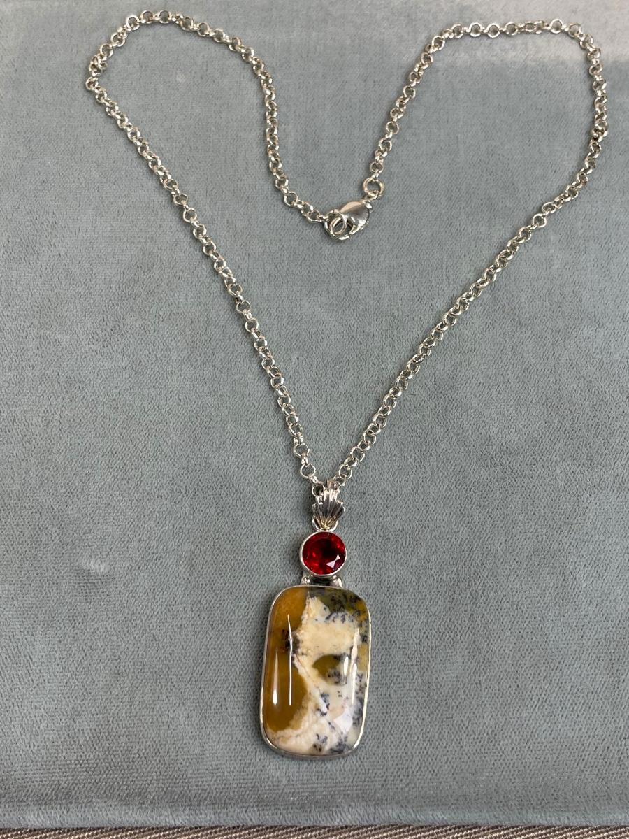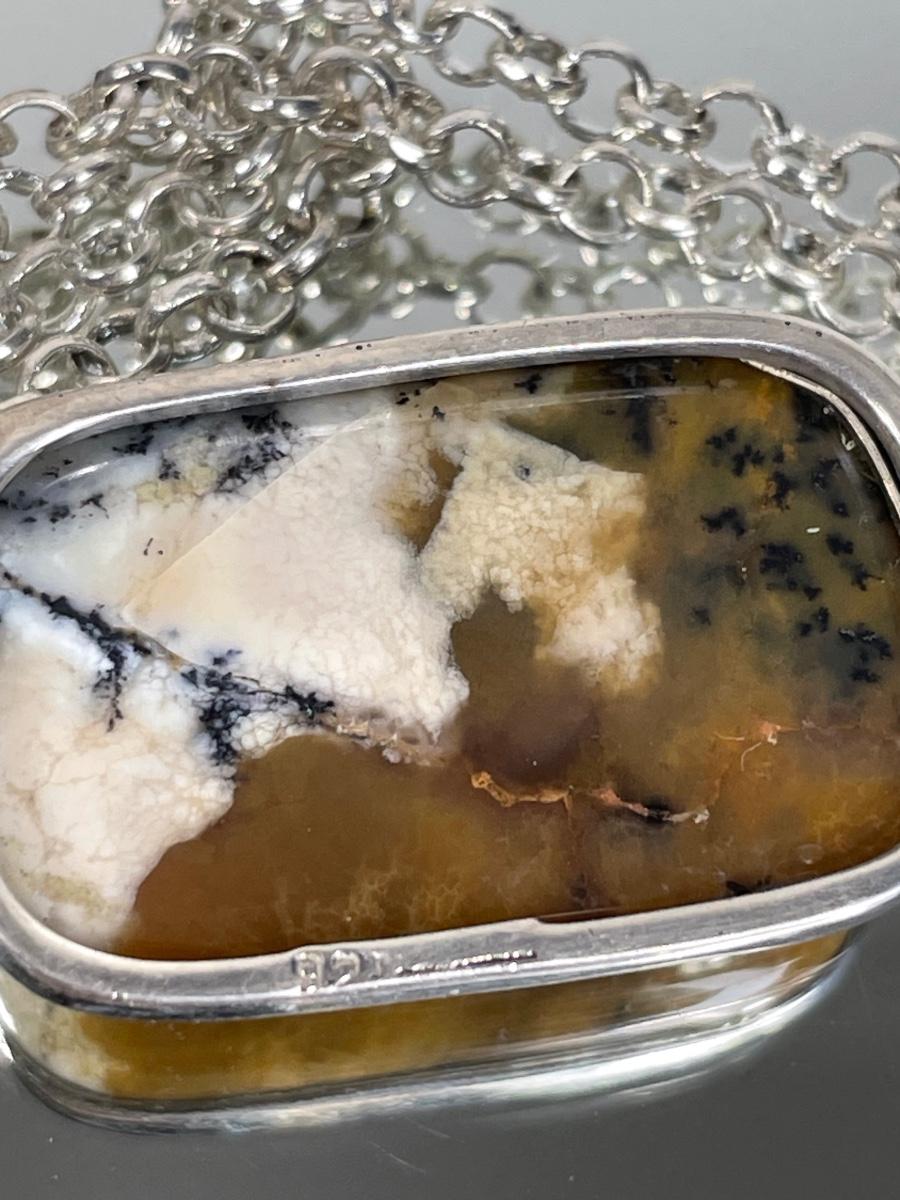 2” pendant is stamped 925. Chain is unknown material and 18” long.