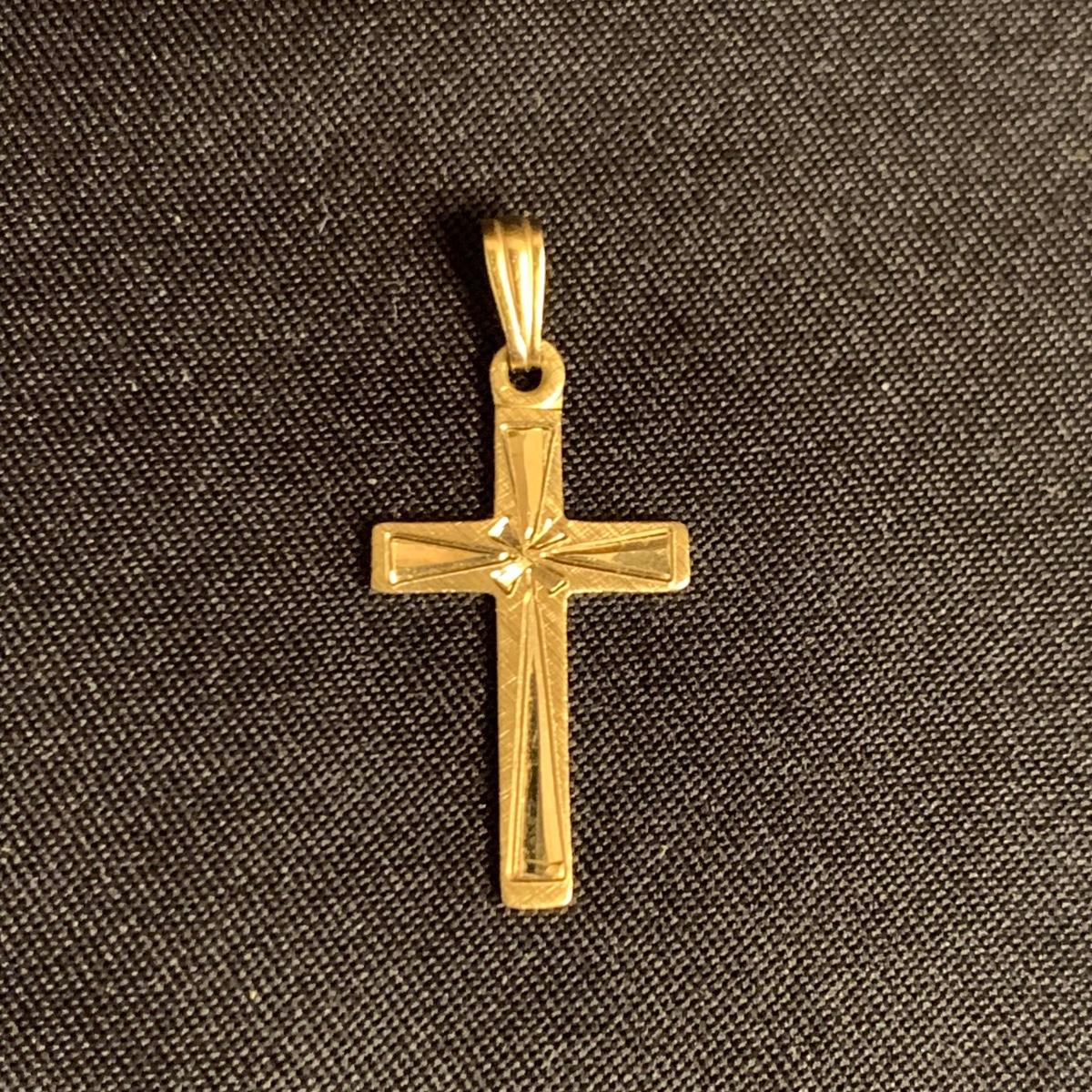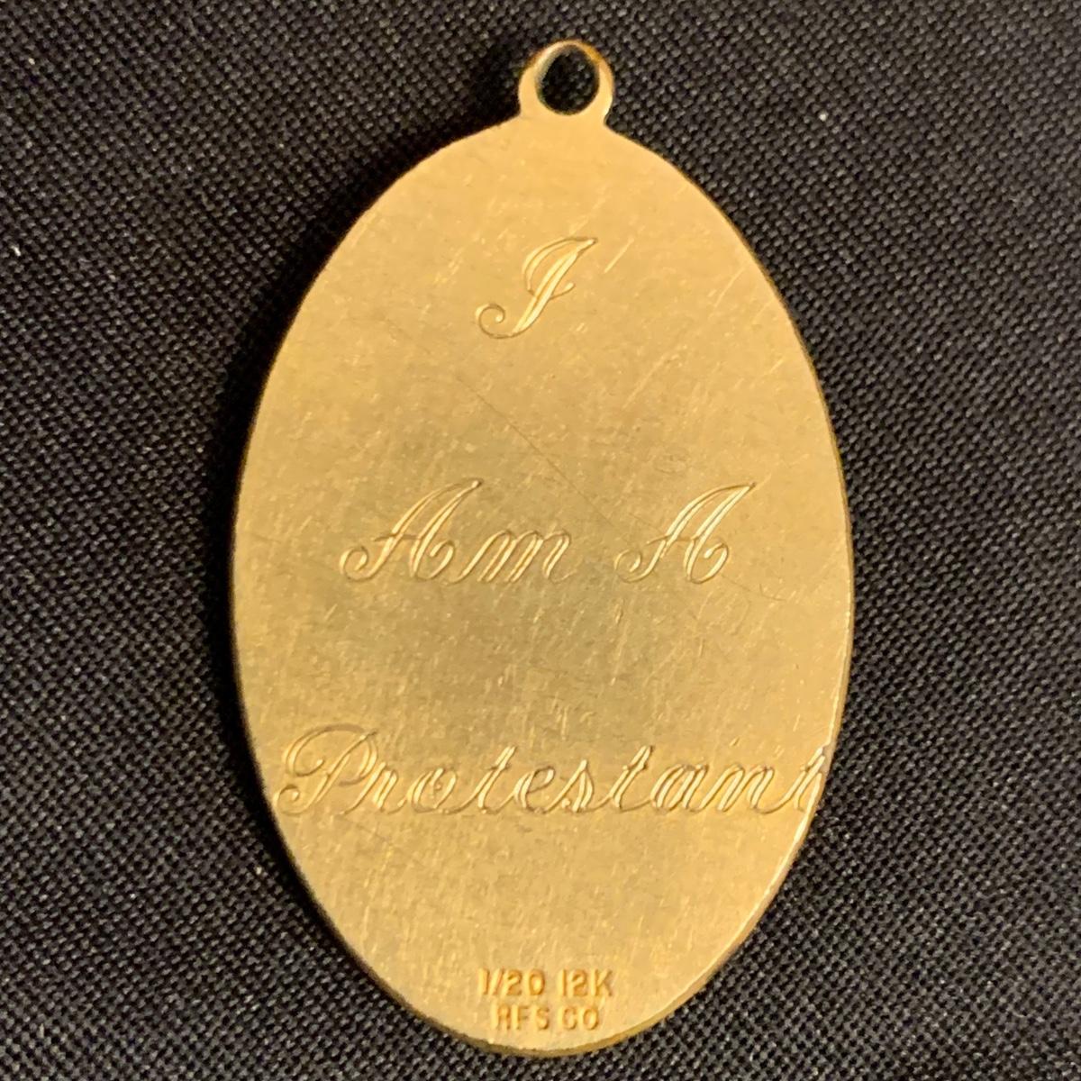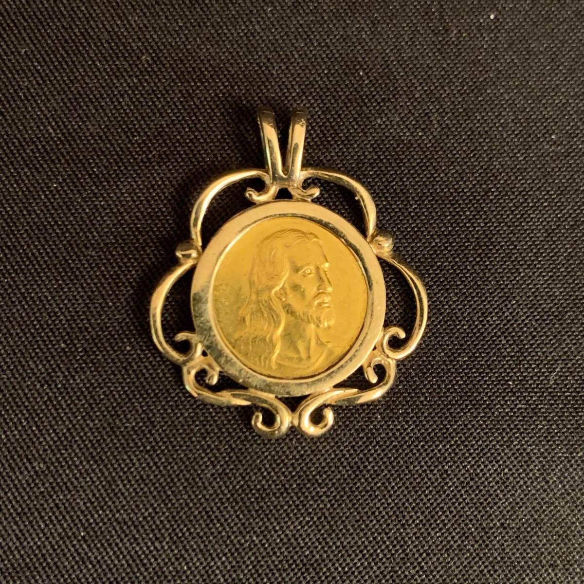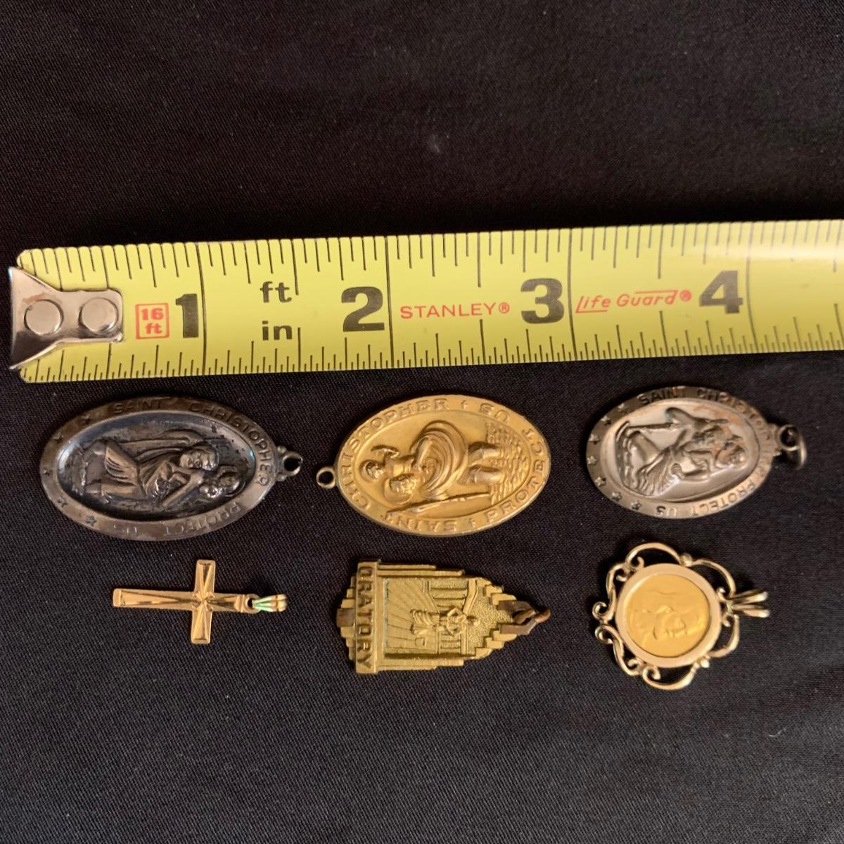 Six religious pendants. Two “˜St. Christopher’ pendants are marked “˜Sterling’ and the other is marked “˜1/20 12K’. The cross is marked “˜1/20 14K G.O.’. The mark on the back of the Jesus pendant is not completely visible, but it does appear to say “˜.999 Pure Gold’. No marking on the Oratory pendant.
