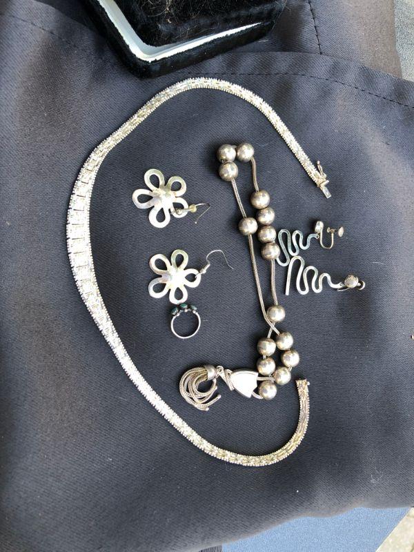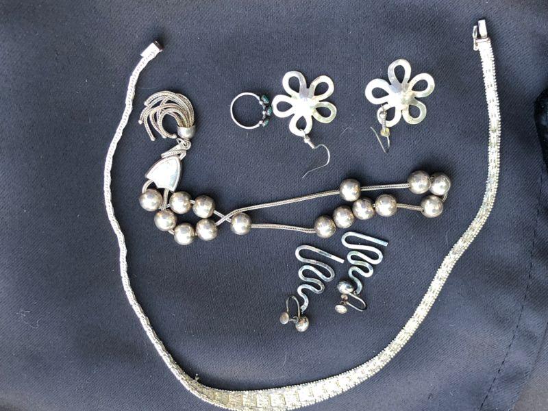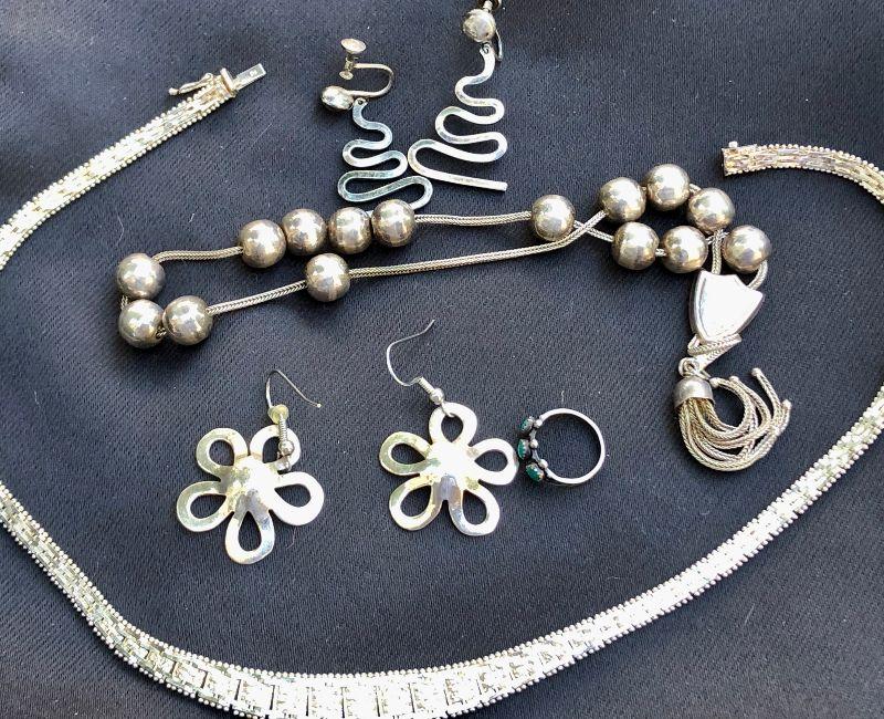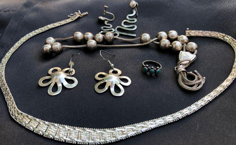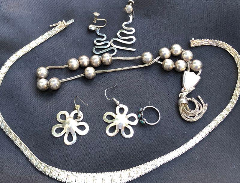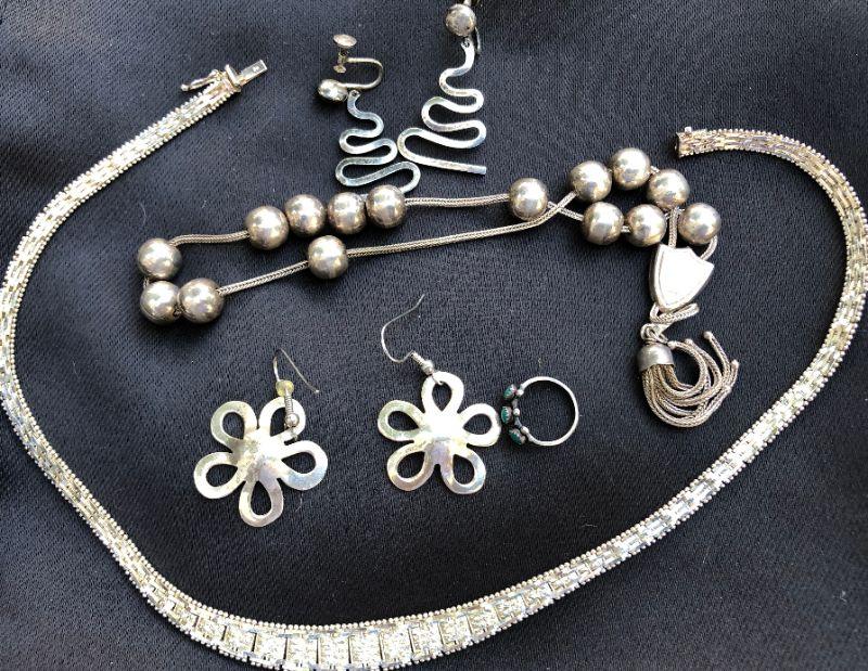 Sterling Silver Earrings Necklace, Beaded Chain, and Ring. For wear or scrap. Flat Rate Shipping/Handling for this lot is $15.00 which includes insurance.