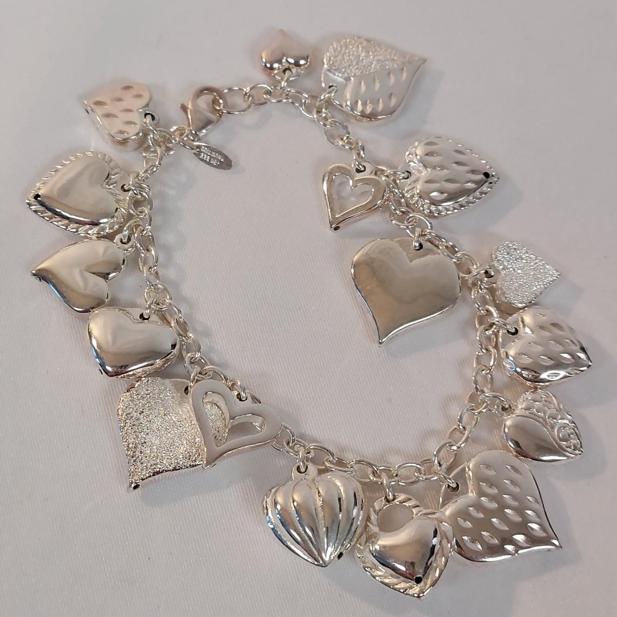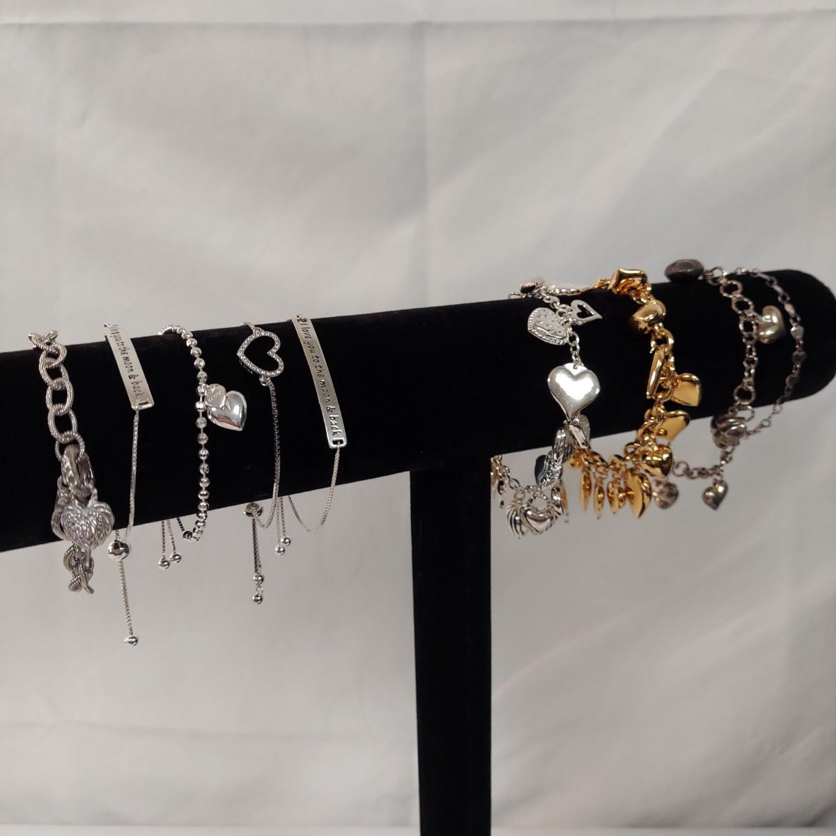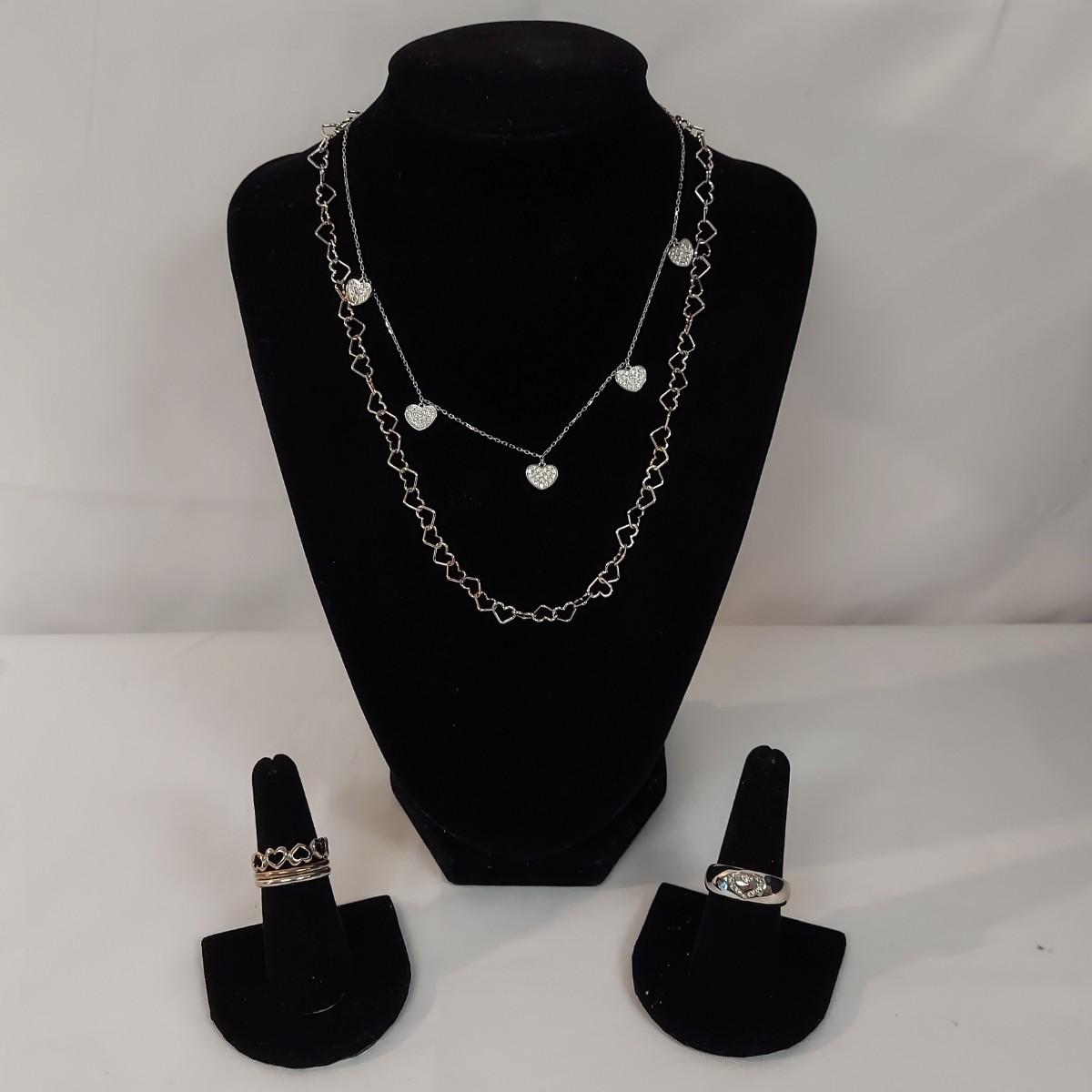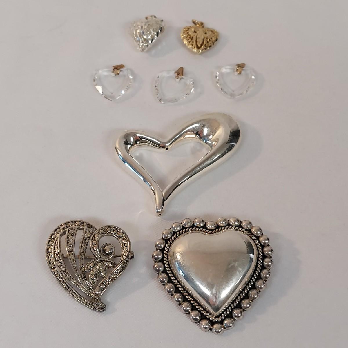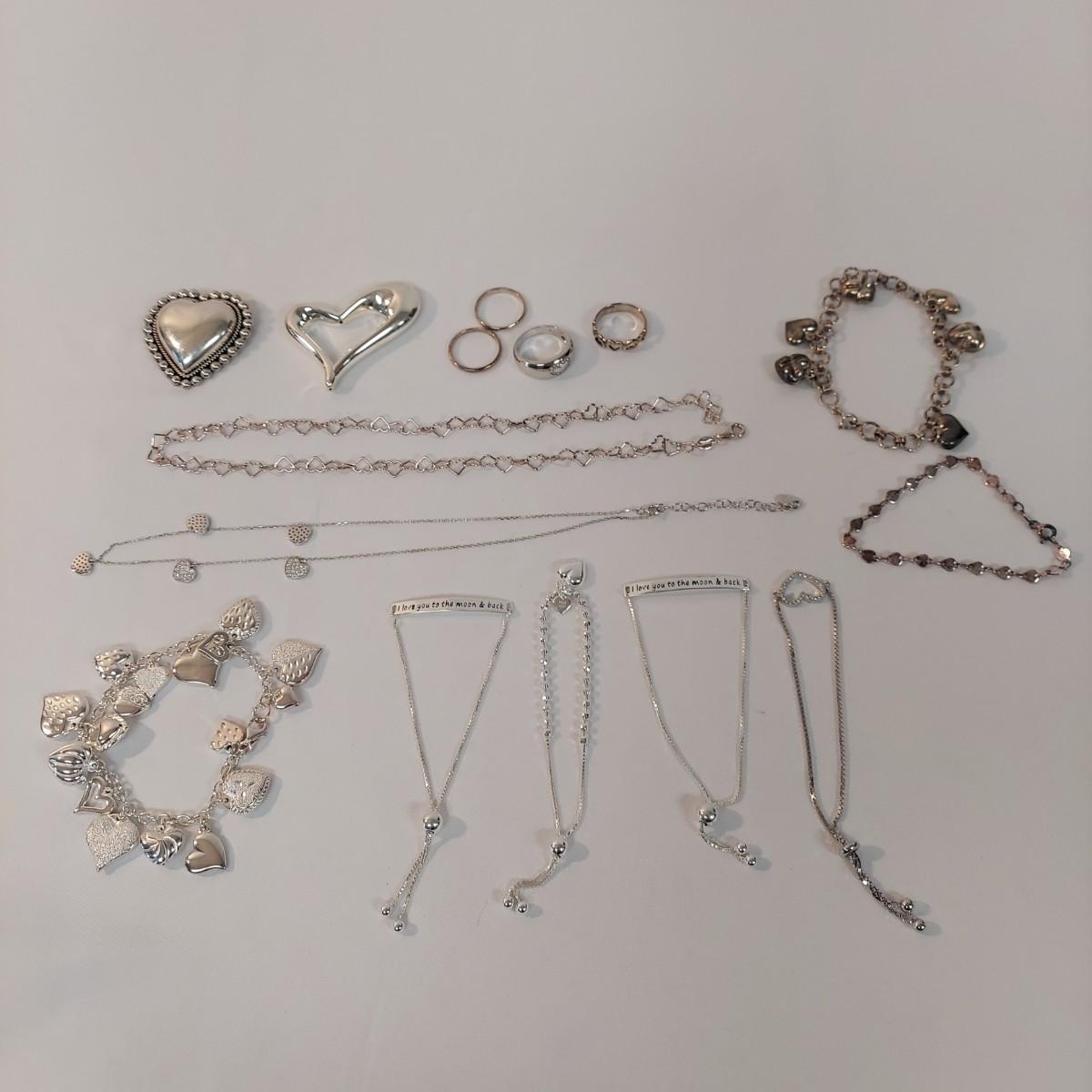 Several pieces of heart design jewelry. Lot includes four necklaces, nine bracelets, four rings, two brooches and six pendants. The majority of items are stamped .925. Last group photo shows these items. The shortest necklace is 17". The longest necklace is 36". Please see photos for all markings found. All sales are final. No returns or refunds. Please bid accordingly.