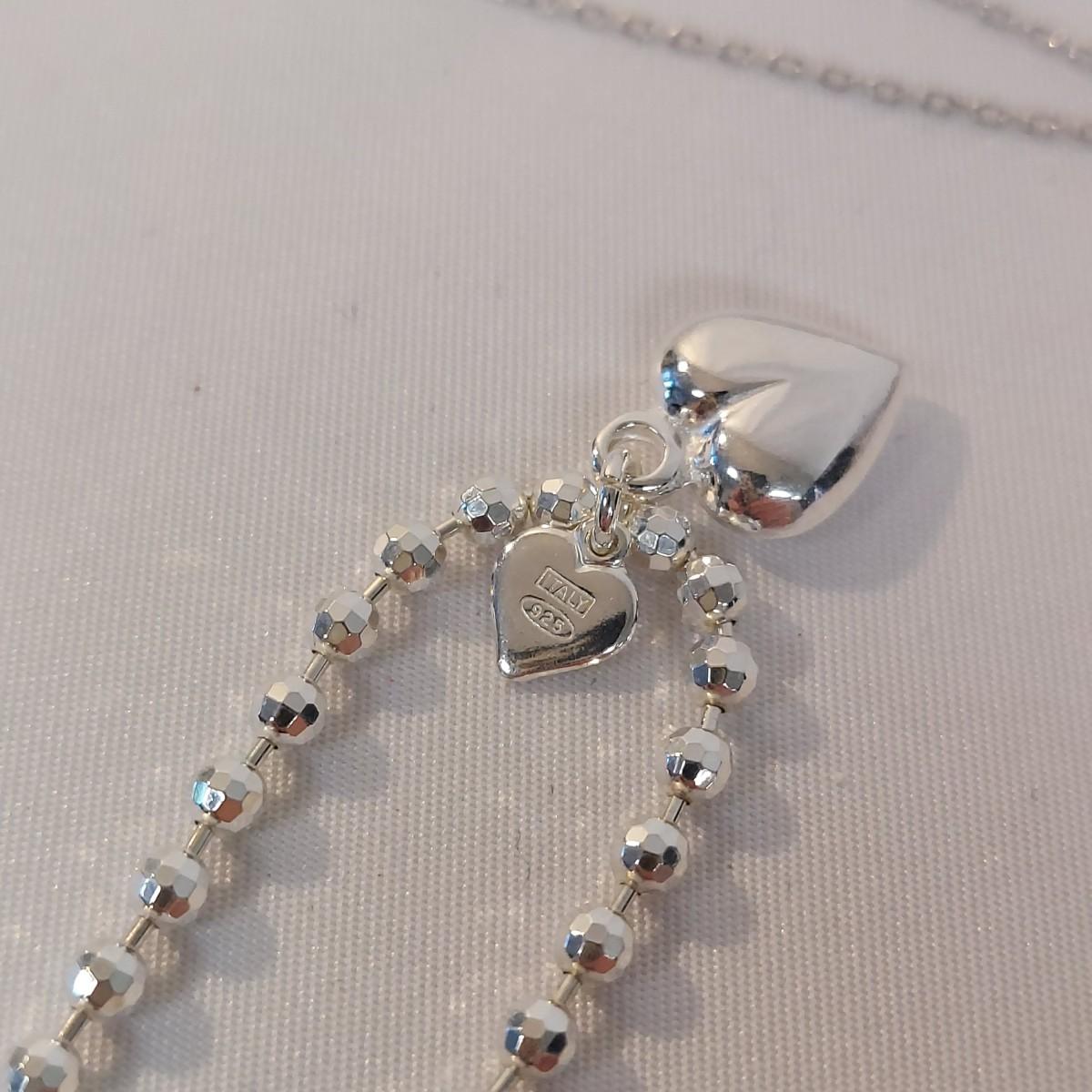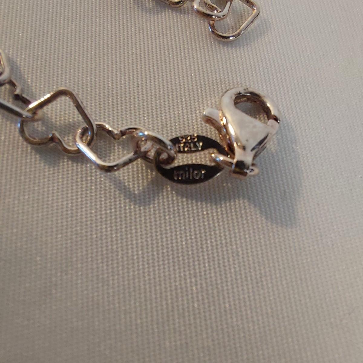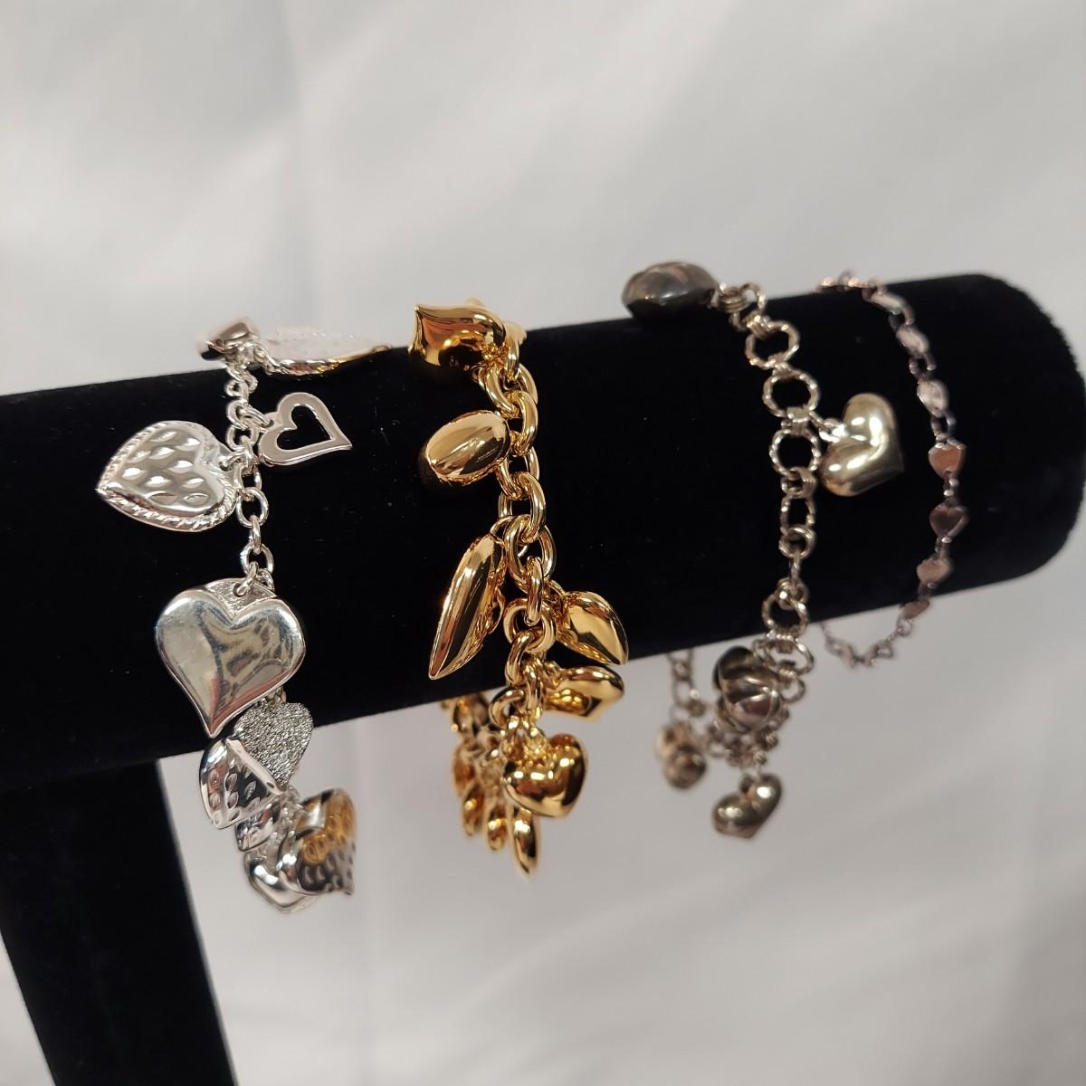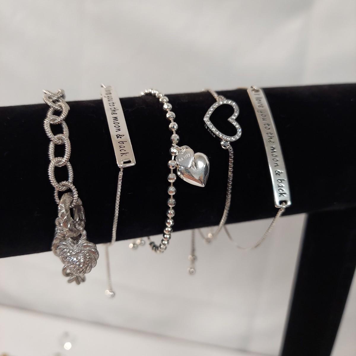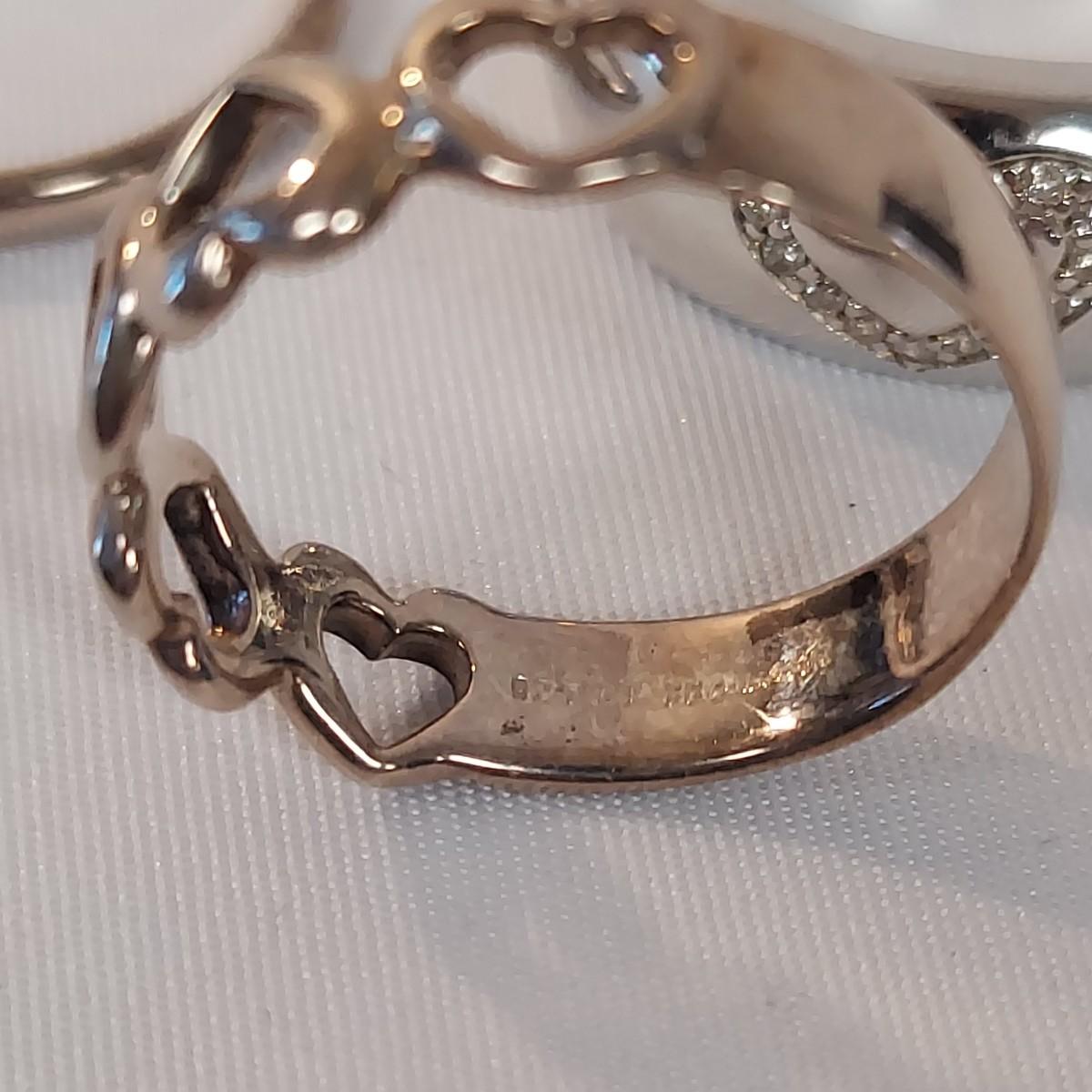 Several pieces of heart design jewelry. Lot includes four necklaces, nine bracelets, four rings, two brooches and six pendants. The majority of items are stamped .925. Last group photo shows these items. The shortest necklace is 17". The longest necklace is 36". Please see photos for all markings found. All sales are final. No returns or refunds. Please bid accordingly.