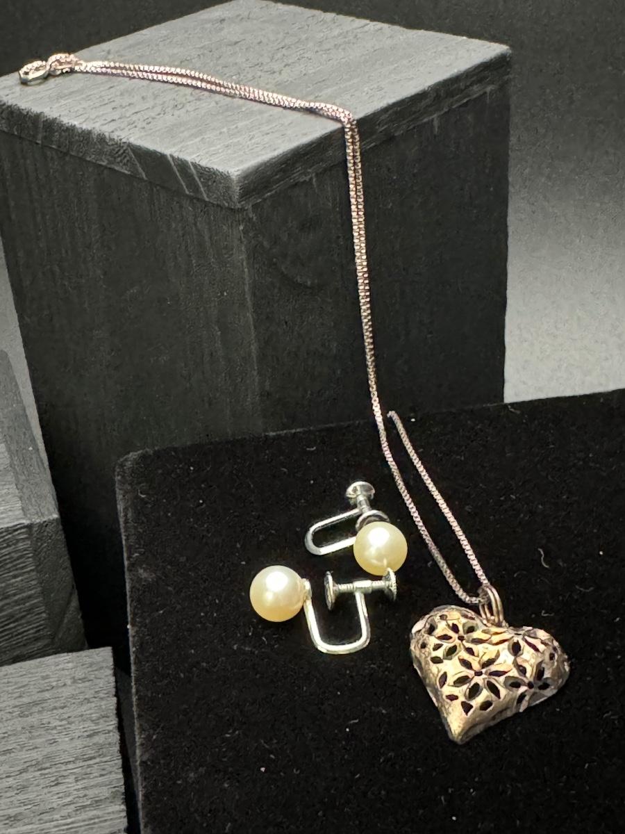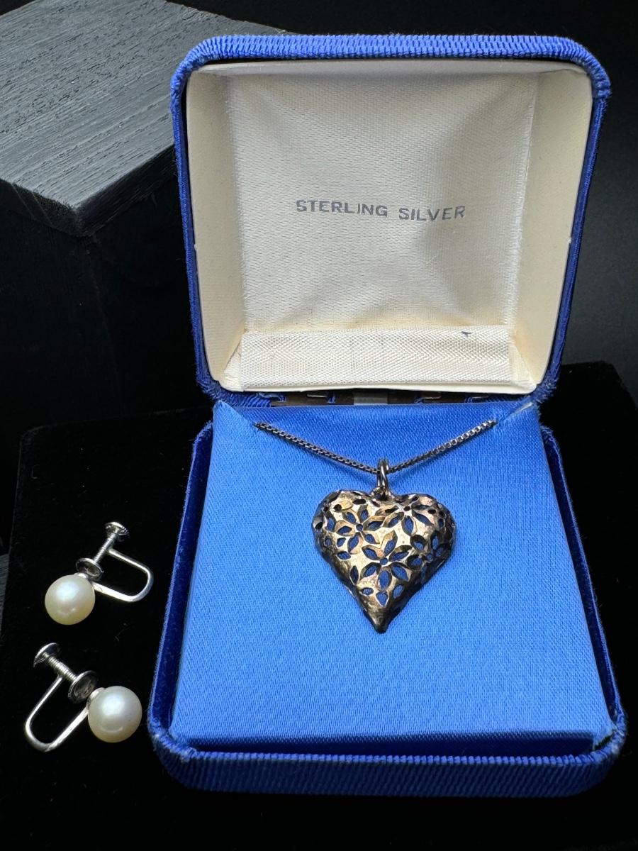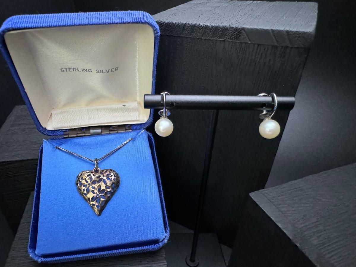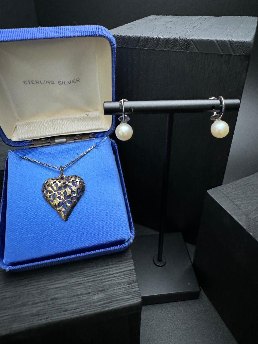 Sterling Silver Heart Necklace and Sterling Pearl Earrings