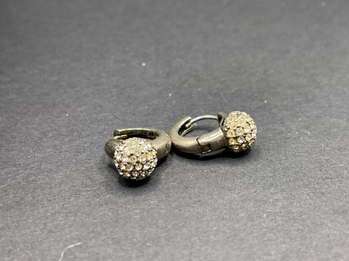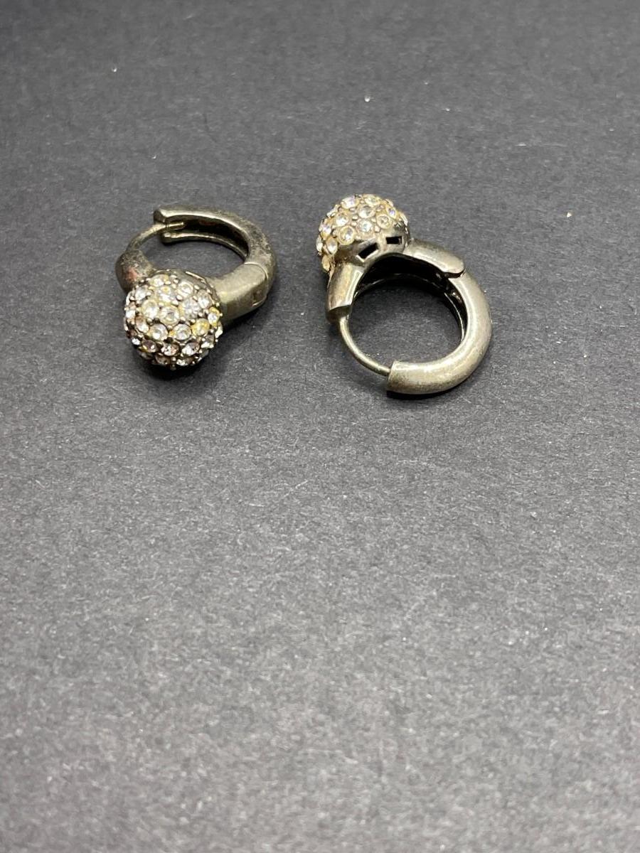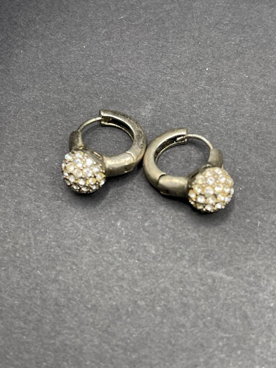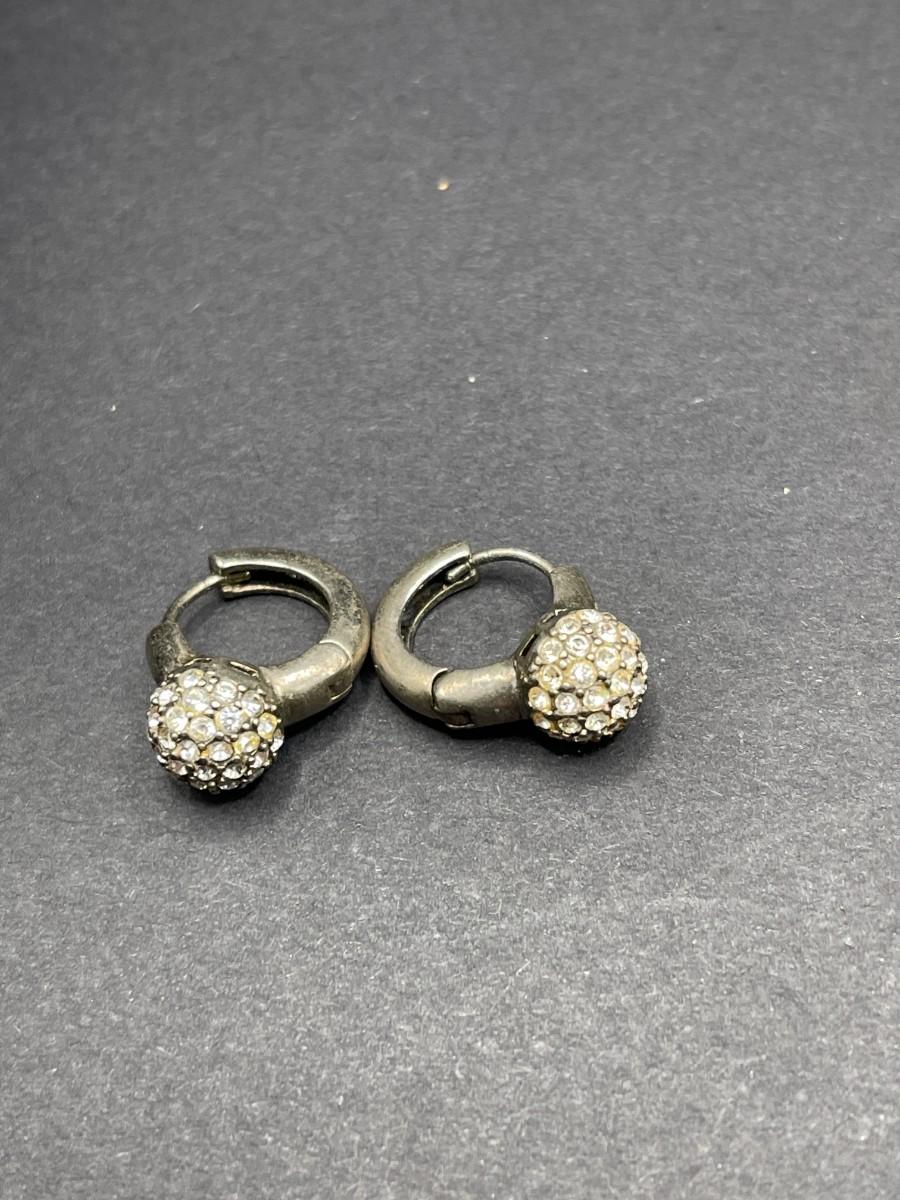 Sterling silver hoop earrings with faux diamond balls. One is missing a stone.