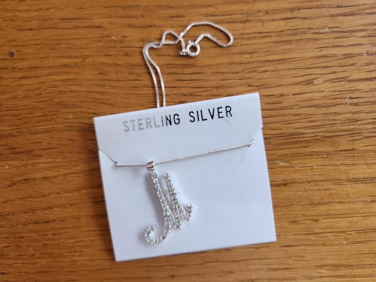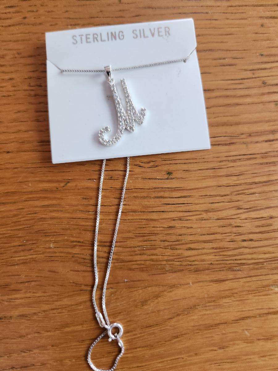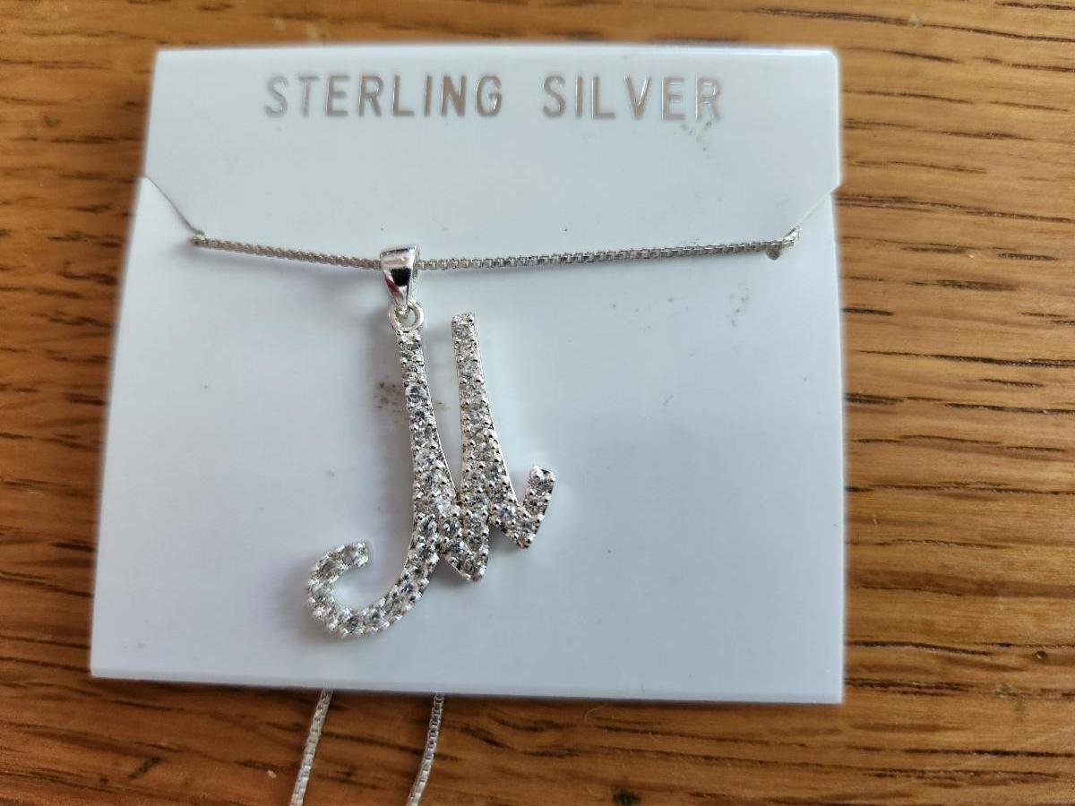 This auction lot is for a Sterling Silver Initial Necklace. This necklace sports the letter "M" - both the necklace and the initial are marked 925. Chain measures about 10-inches. It is a fine and in new condition.