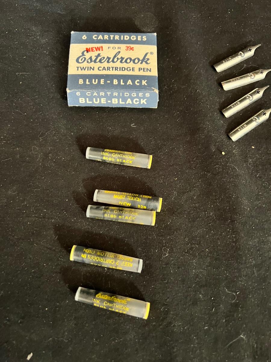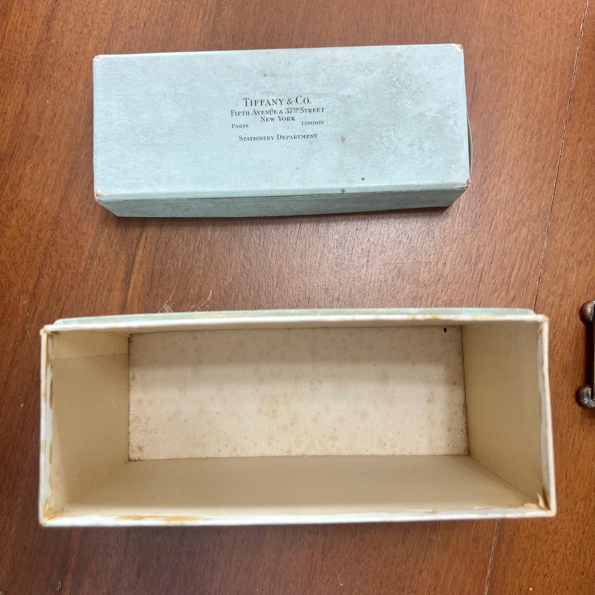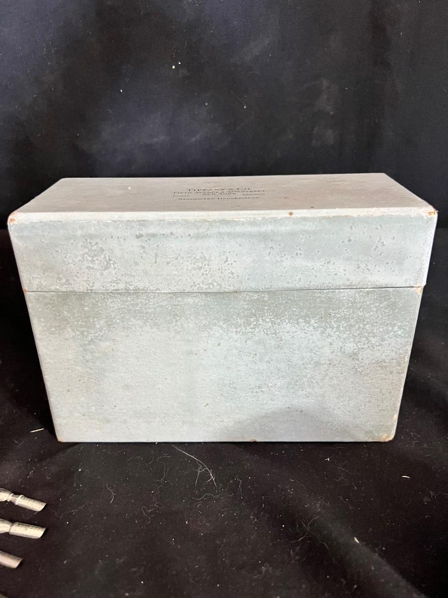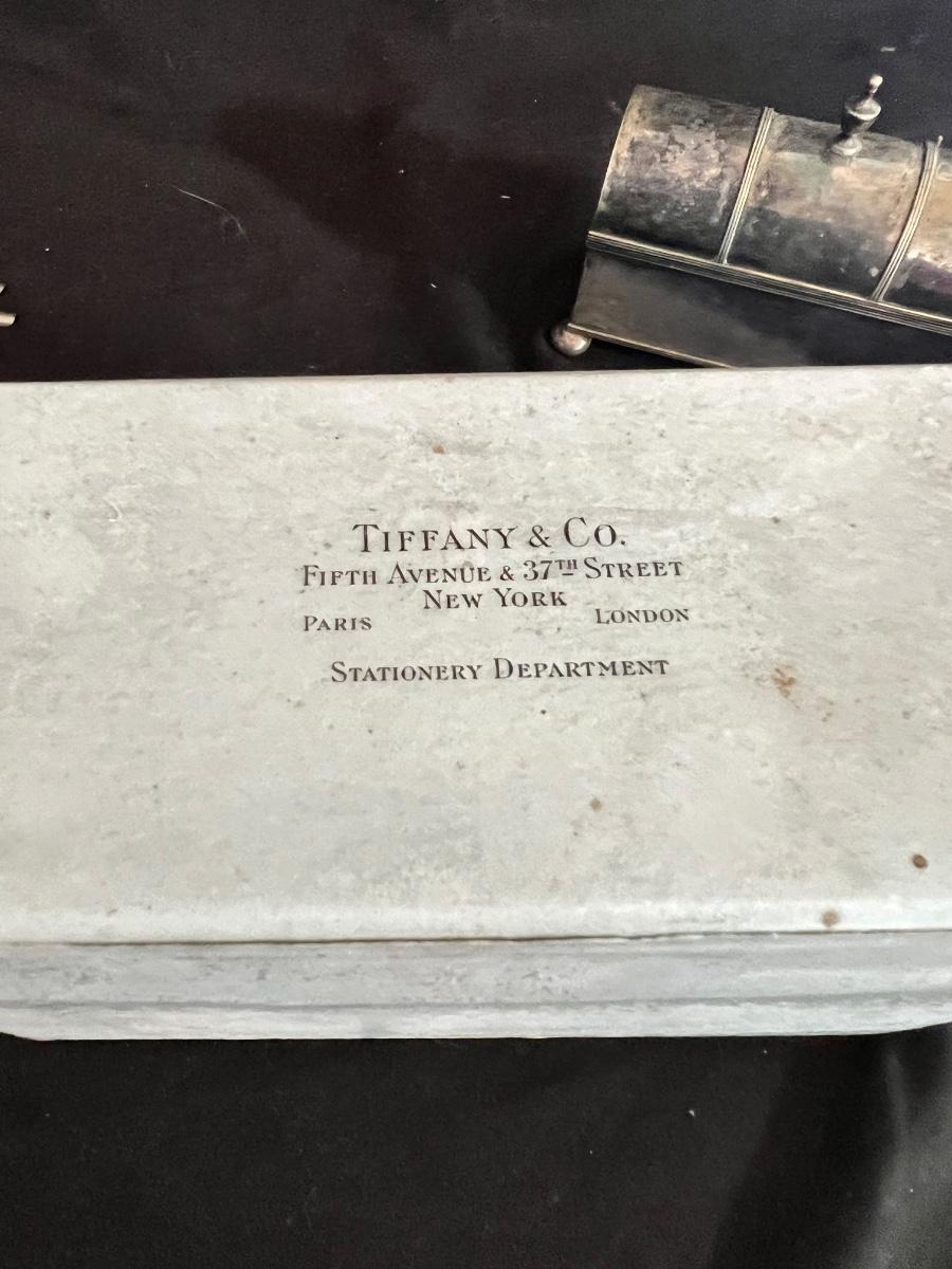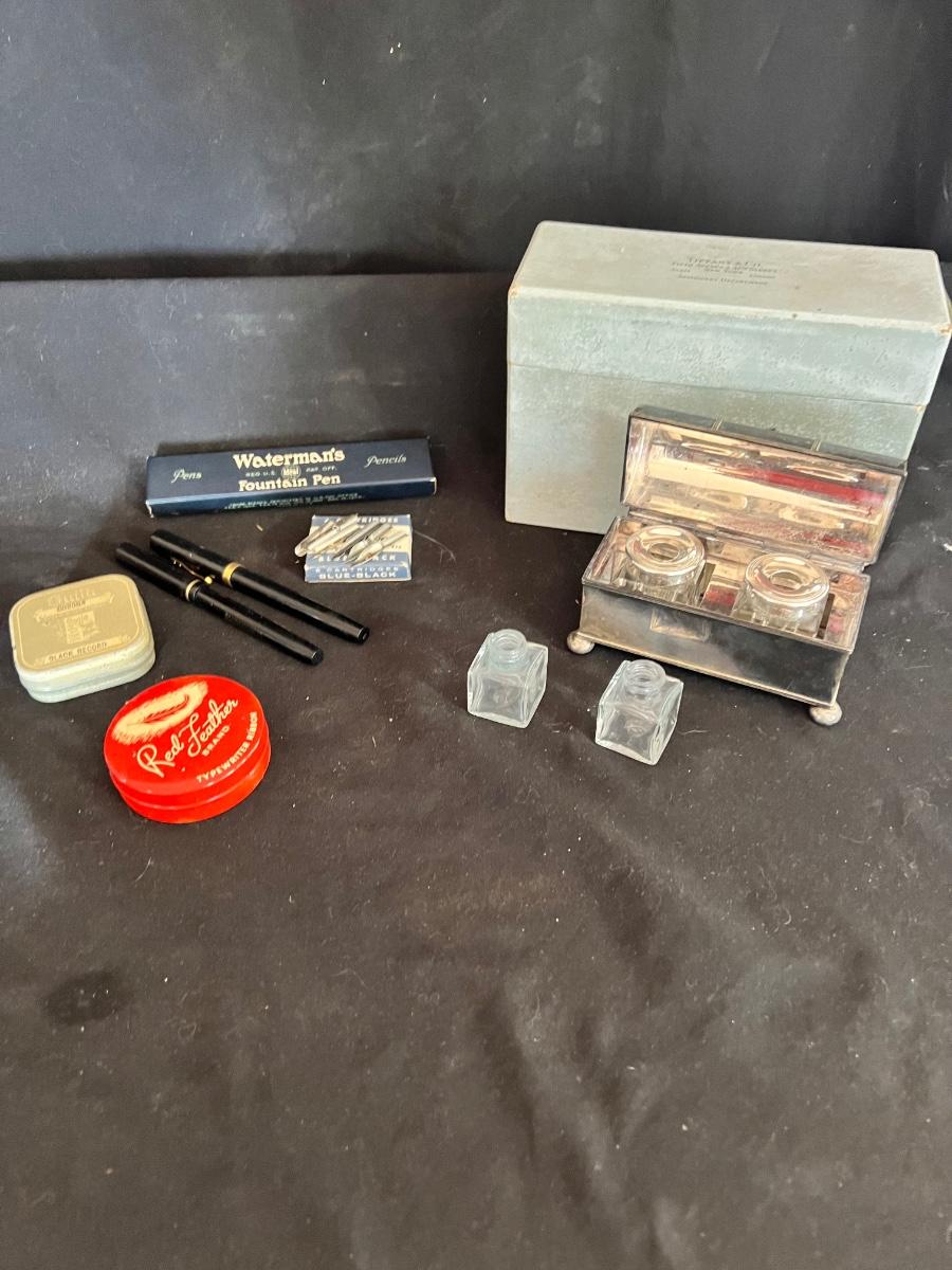 Silver metal (marked EPNS) ink well with two glass square ink holders inside. Two fountain pens are 5.5” long and 5 ink cartridges are included. Lot also includes eight pen tips and two vintage tin containers originally used for typewriter ribbon. Also included is a vintage Tiffany & Co. stationary box.