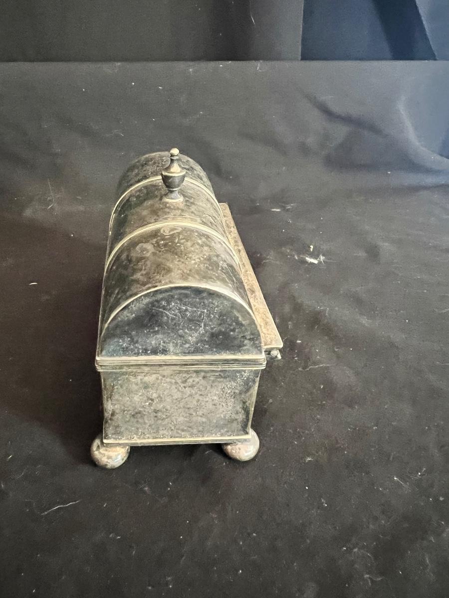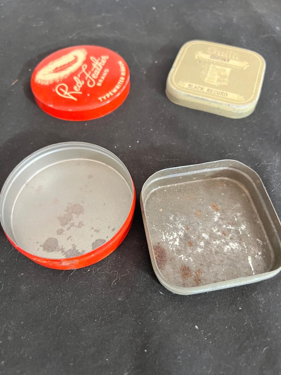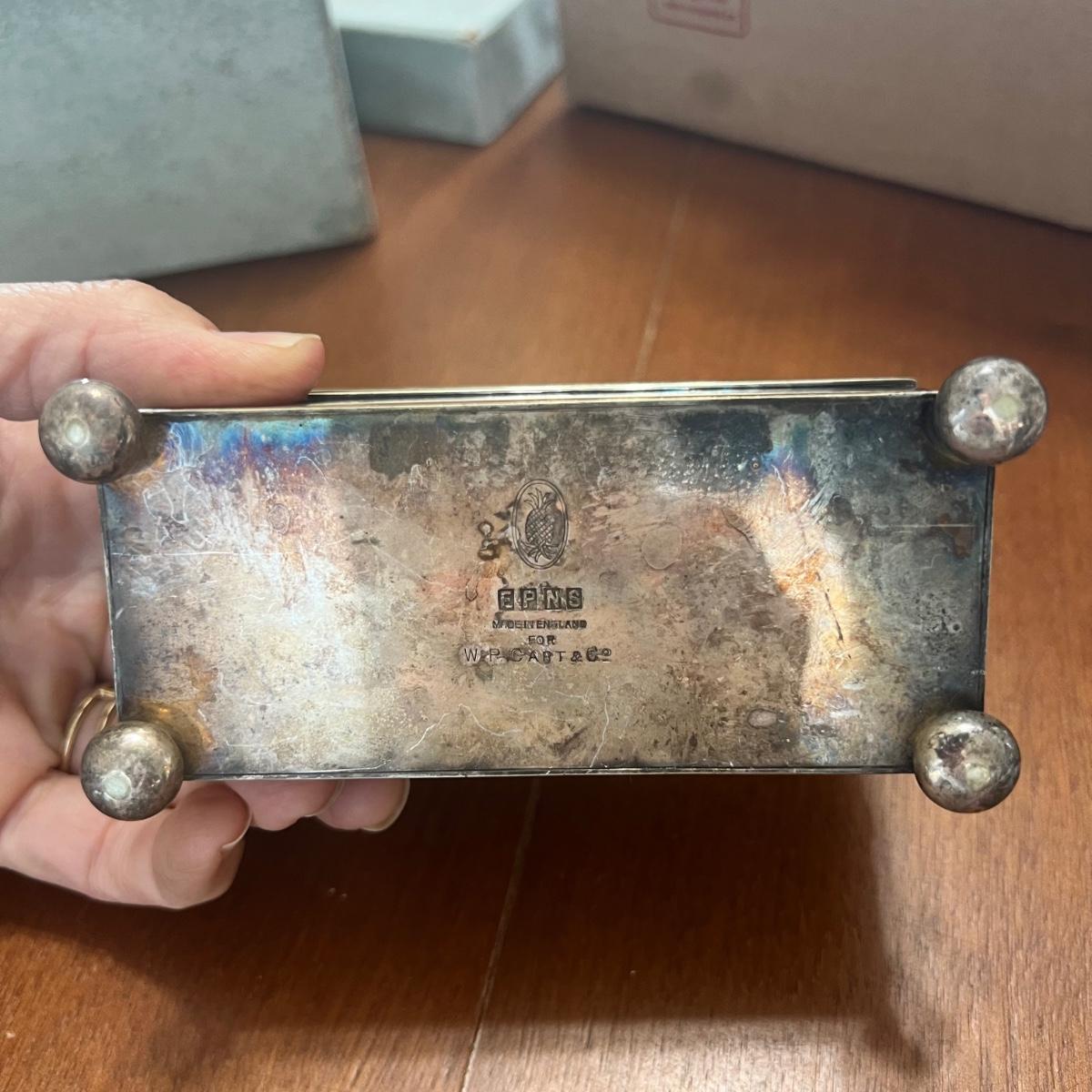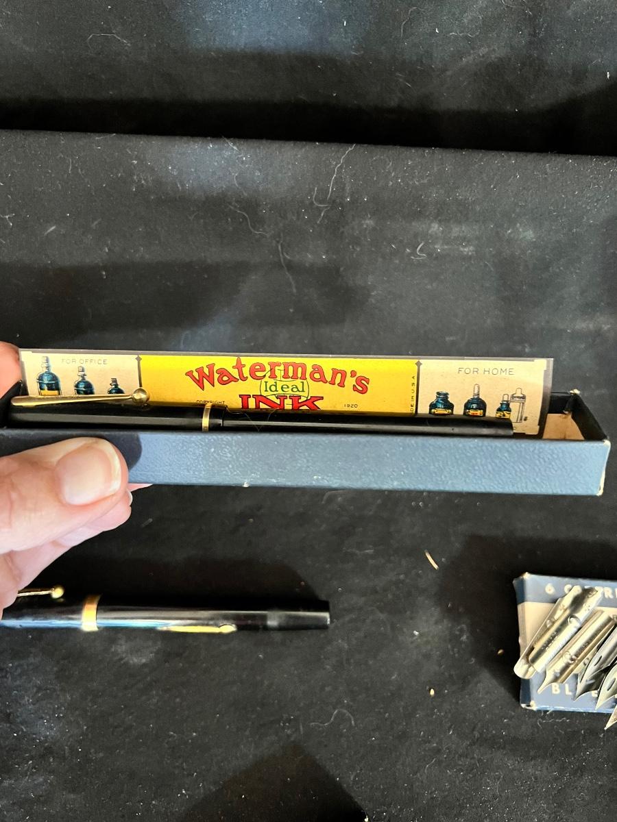 Silver metal (marked EPNS) ink well with two glass square ink holders inside. Two fountain pens are 5.5” long and 5 ink cartridges are included. Lot also includes eight pen tips and two vintage tin containers originally used for typewriter ribbon. Also included is a vintage Tiffany & Co. stationary box.