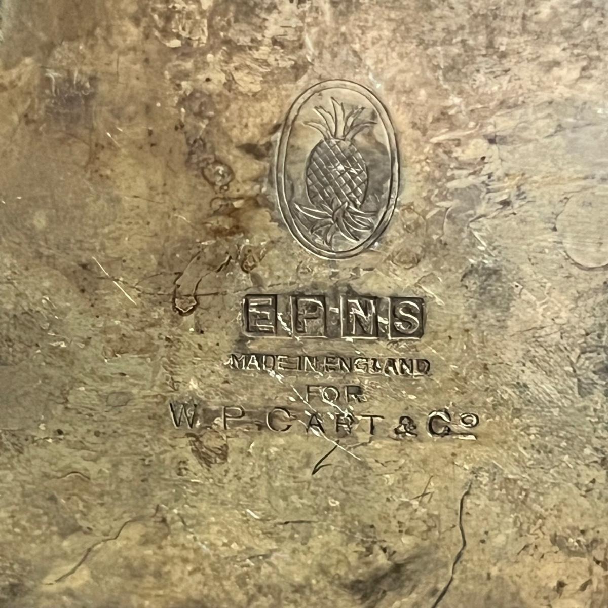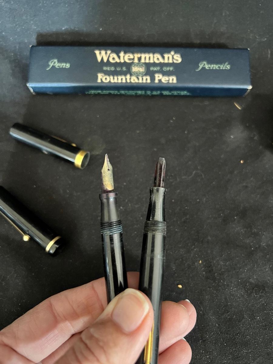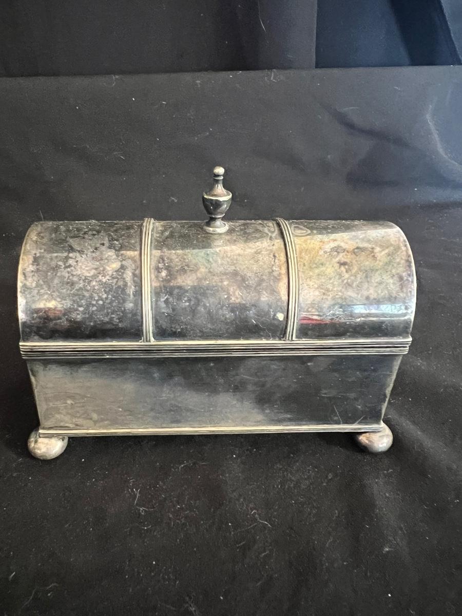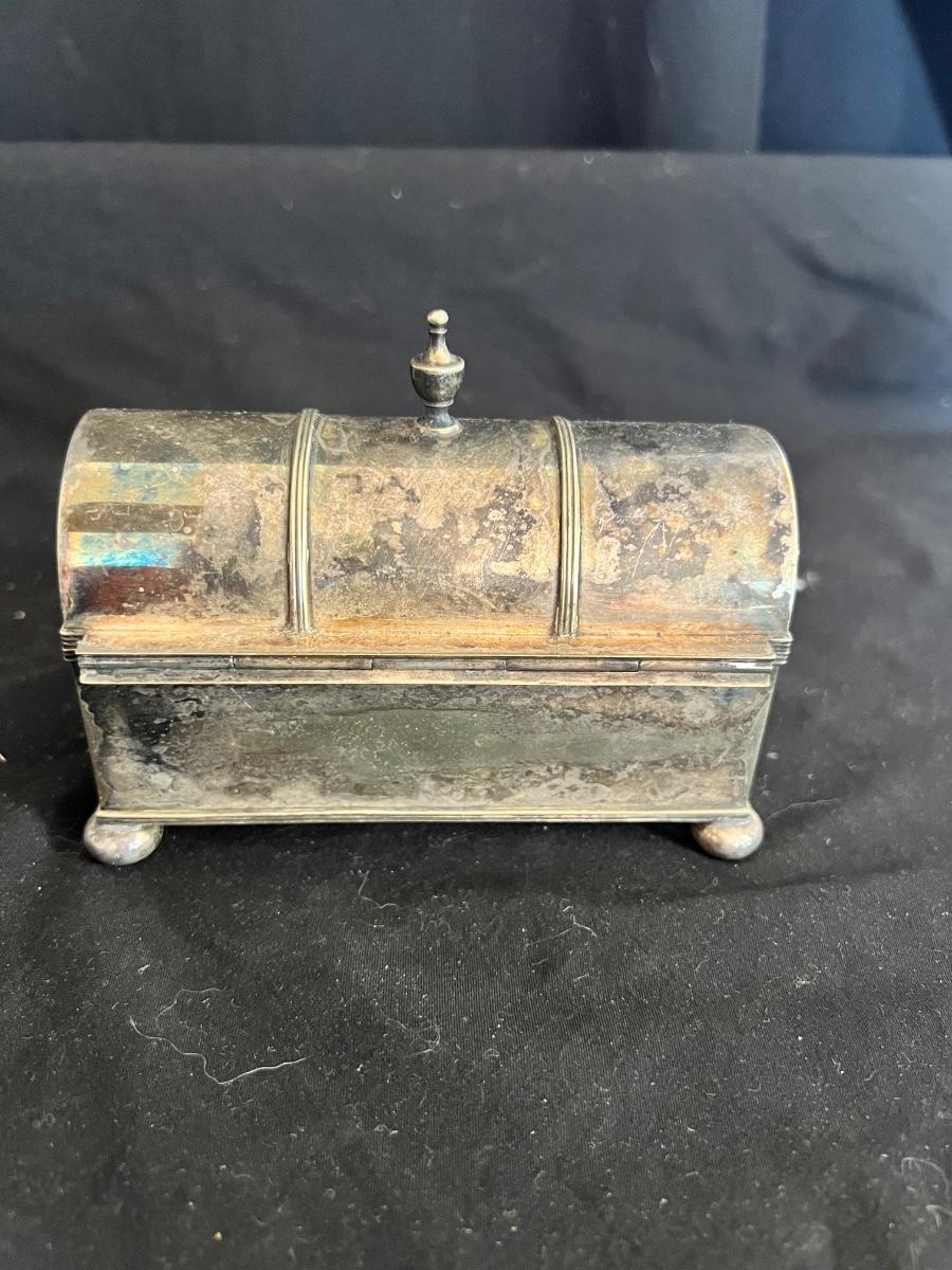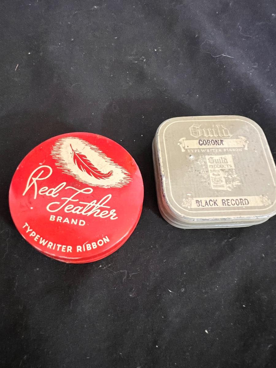 Silver metal (marked EPNS) ink well with two glass square ink holders inside. Two fountain pens are 5.5” long and 5 ink cartridges are included. Lot also includes eight pen tips and two vintage tin containers originally used for typewriter ribbon. Also included is a vintage Tiffany & Co. stationary box.