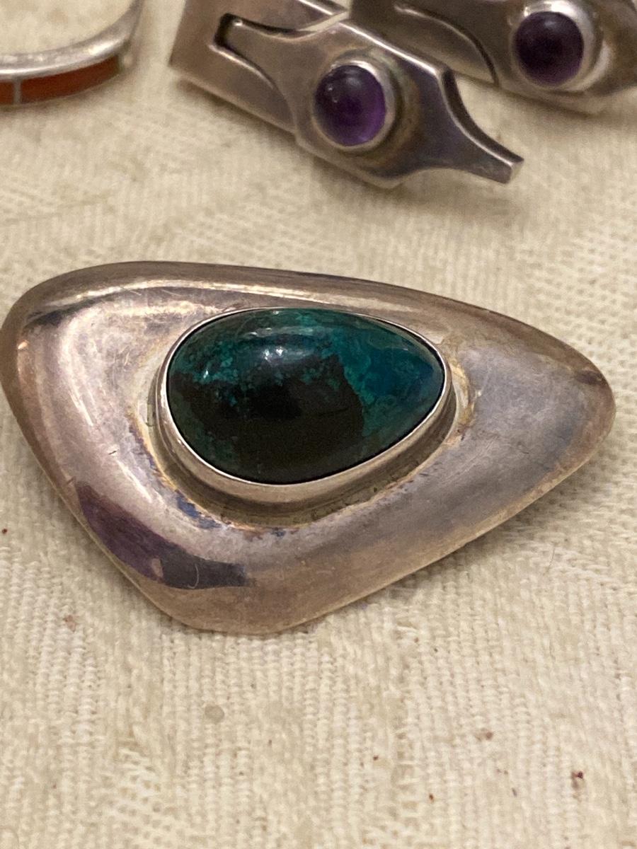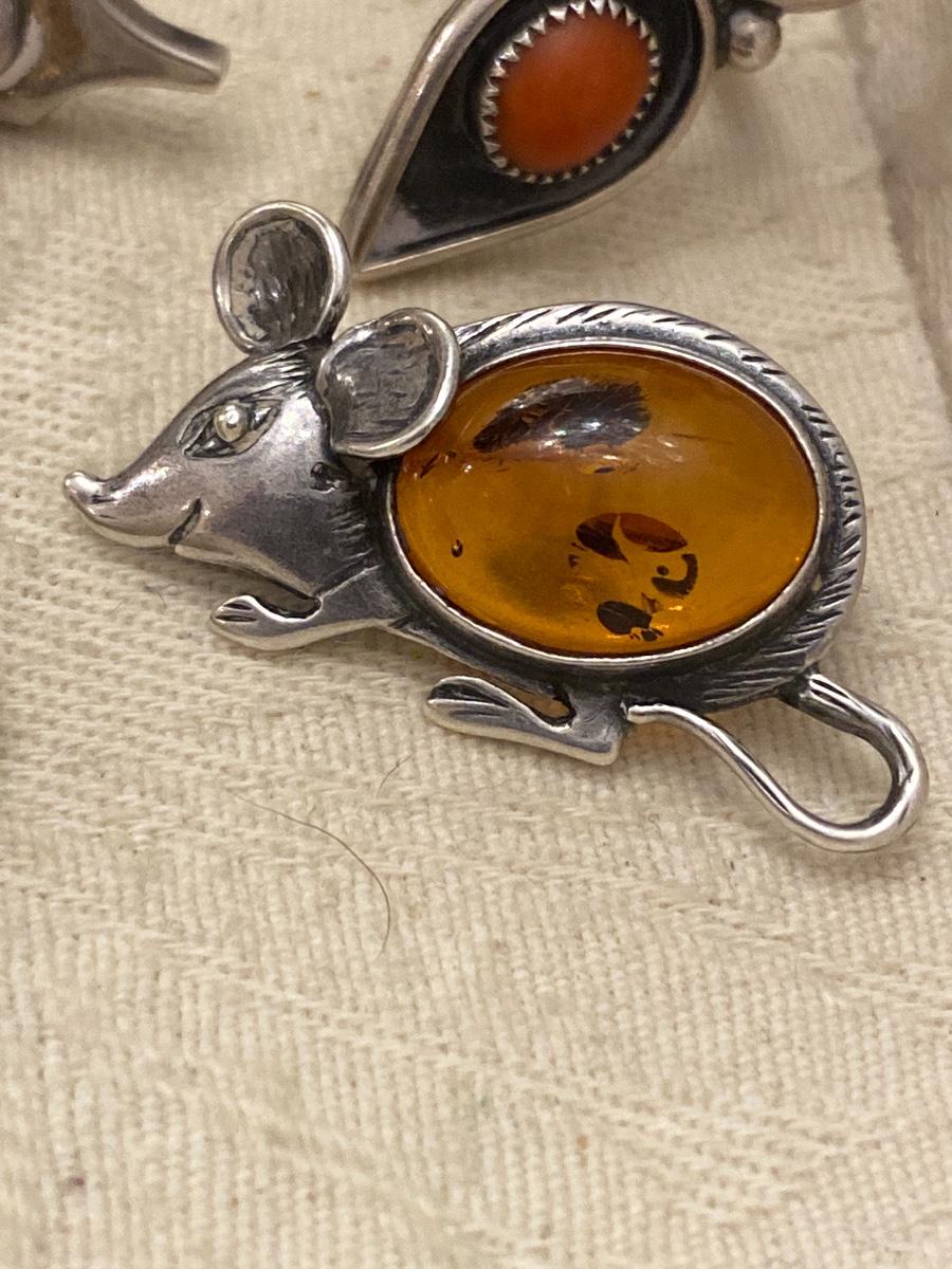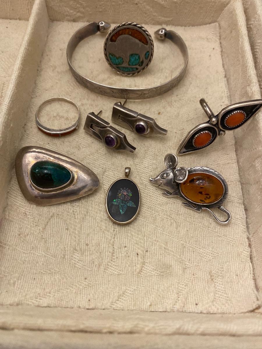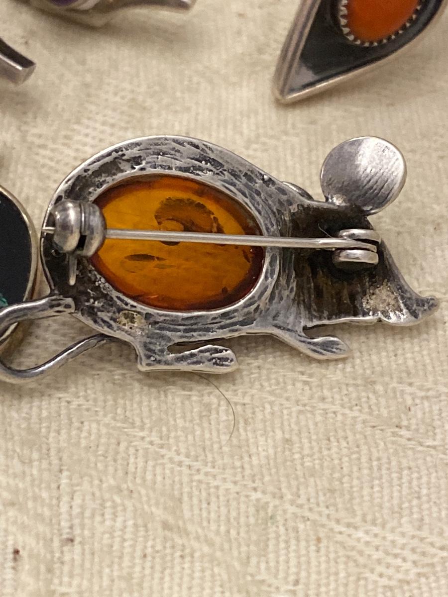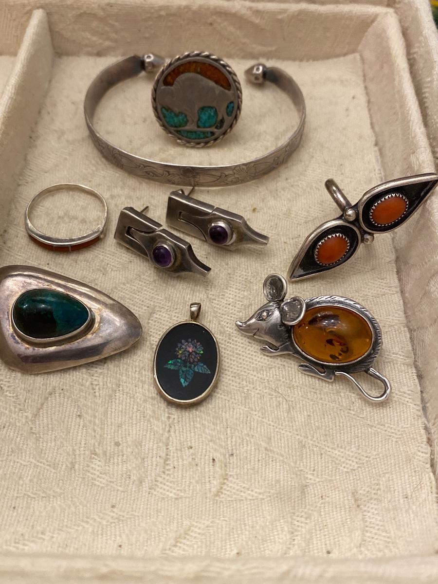 Including an amber and silver mouse brooch, a sterling cuff bracelet, a coral ring, a Buffalo nickel ring, a sterling silver brooch/pendant with a green stone, a pair of sterling silver and amethyst earrings. See all photos to see the ring sizes because ring were photo'd on ring sizer. The total weight for all jewelry is 30.3 dwt or 47.1 grams. Some of the pieces are stamped sterling and some are not.
