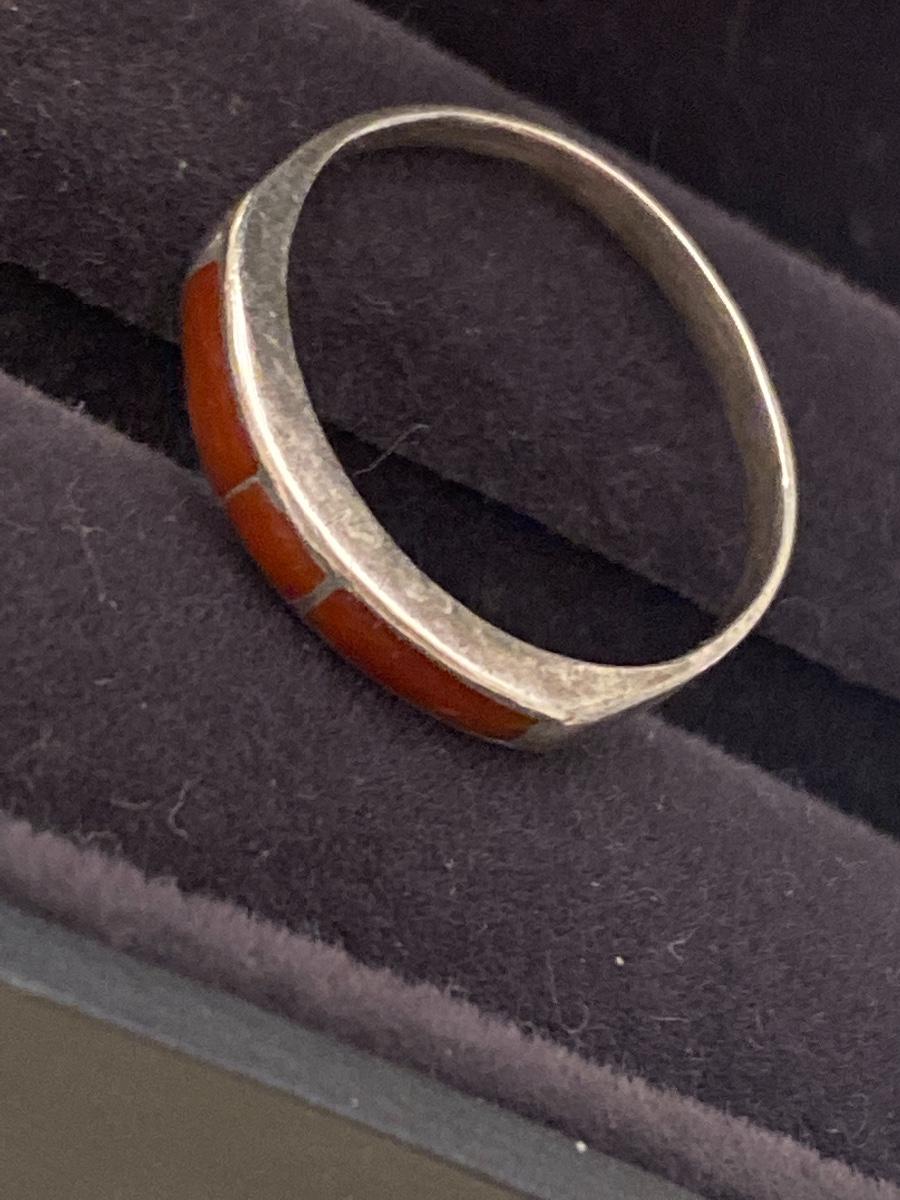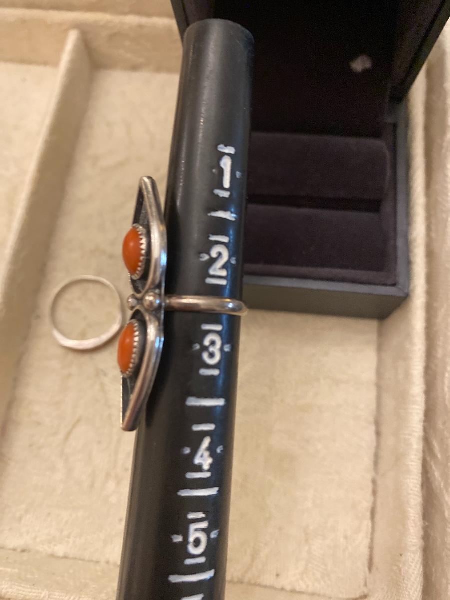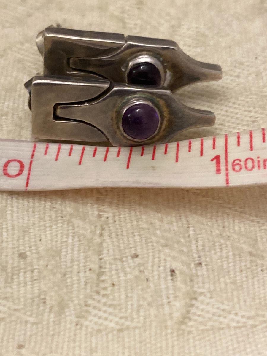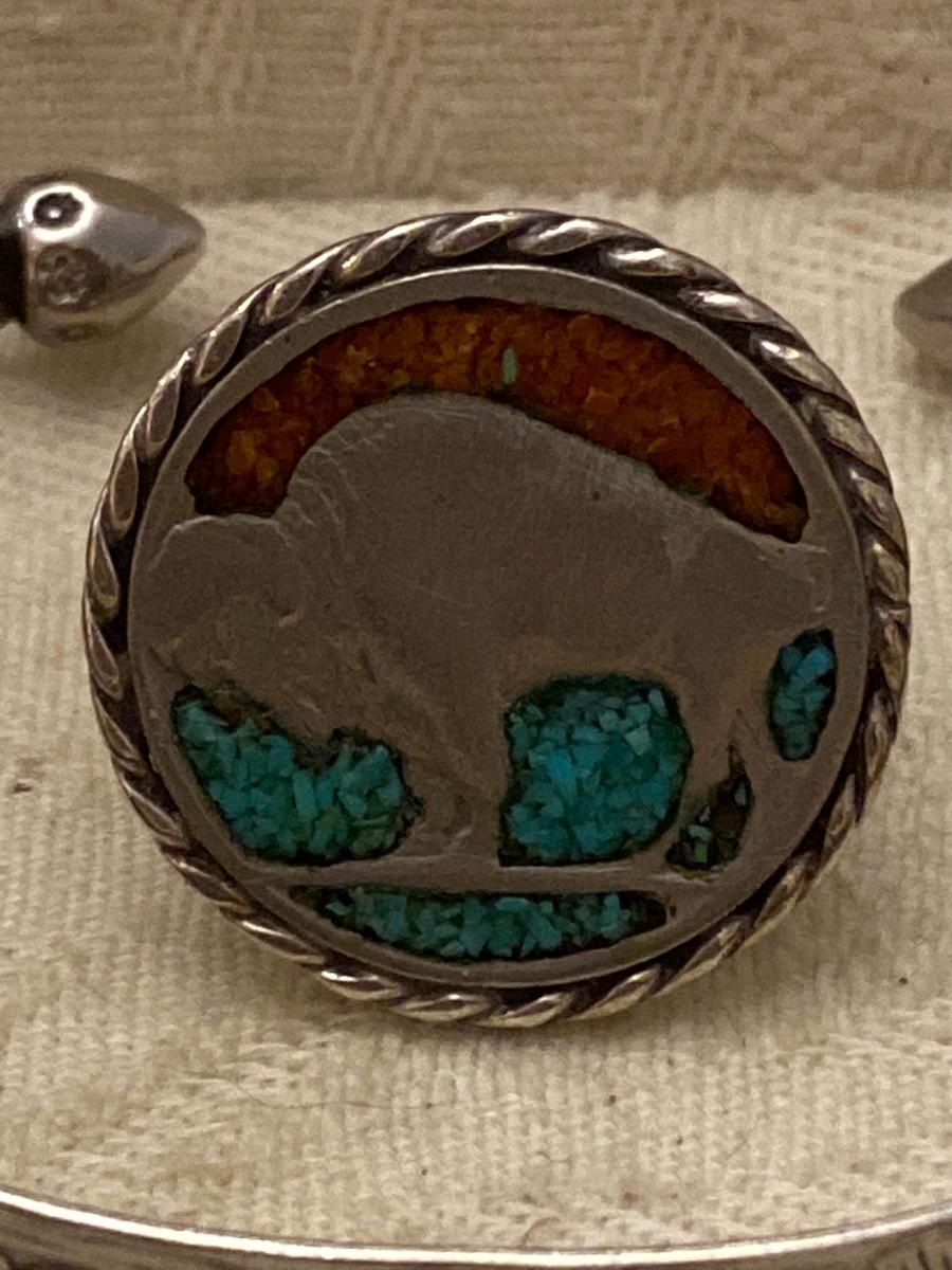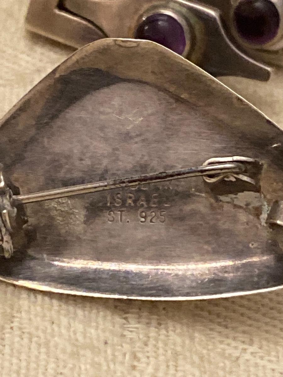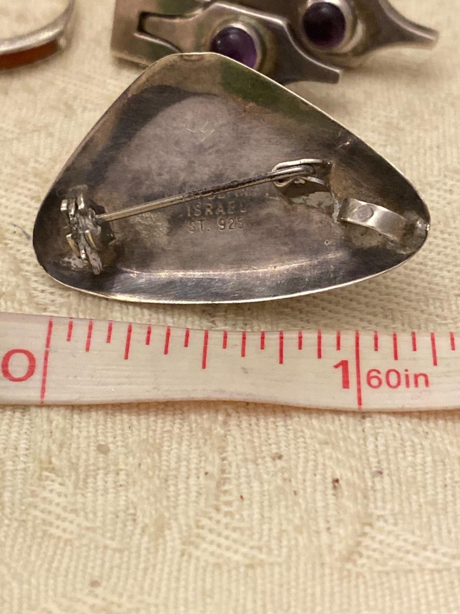 Including an amber and silver mouse brooch, a sterling cuff bracelet, a coral ring, a Buffalo nickel ring, a sterling silver brooch/pendant with a green stone, a pair of sterling silver and amethyst earrings. See all photos to see the ring sizes because ring were photo'd on ring sizer. The total weight for all jewelry is 30.3 dwt or 47.1 grams. Some of the pieces are stamped sterling and some are not.