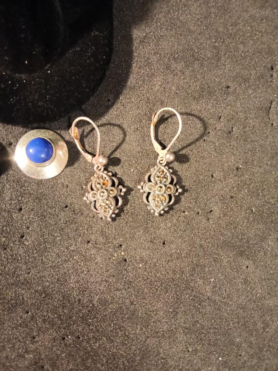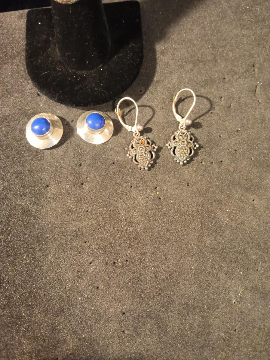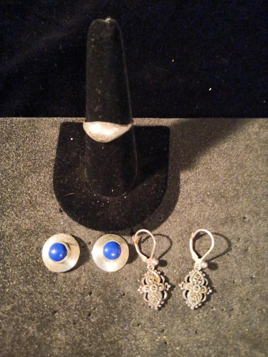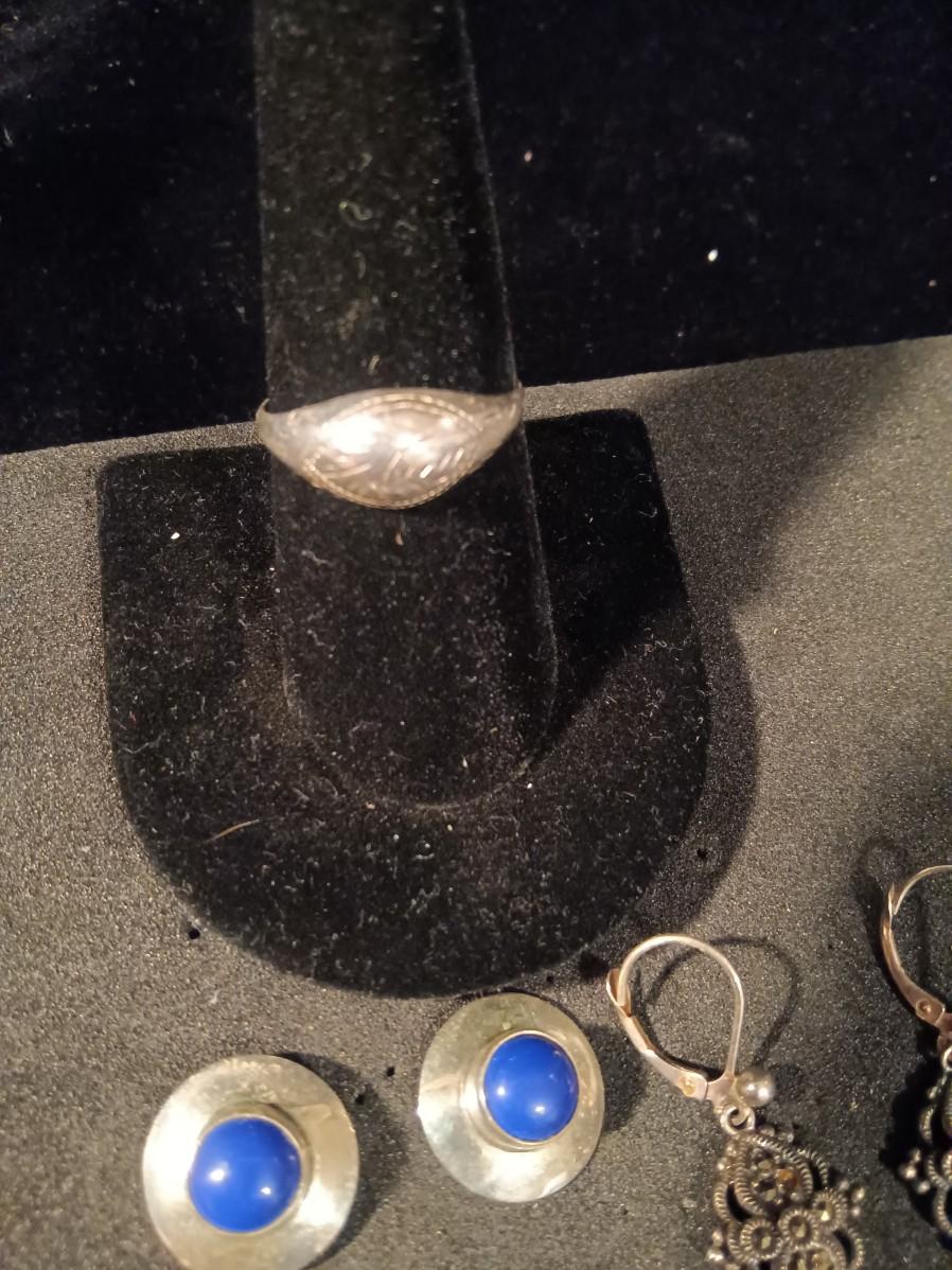 A STERLING SILVER RING WITH DESIGN ON THE FRONT SIZE 7.5, A PAIR OF BLUE AND SILVER EARRINGS AND A FLORAL TYPE OF EARRINGS ALL PIECES ARE STERLING SILVER.
