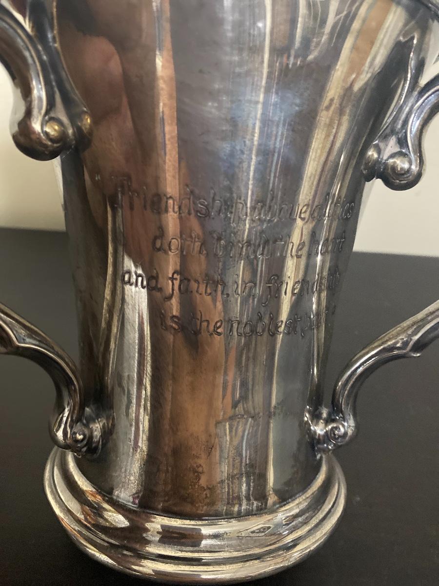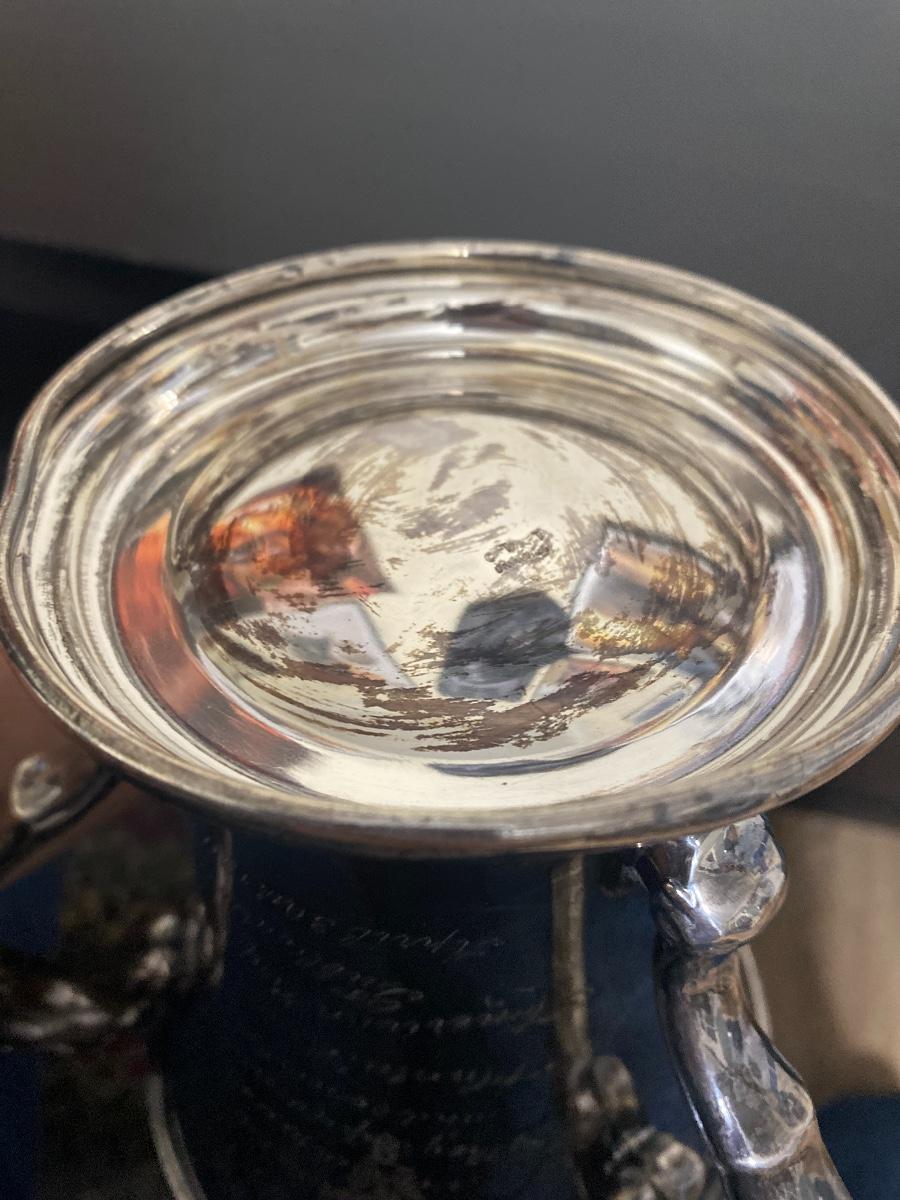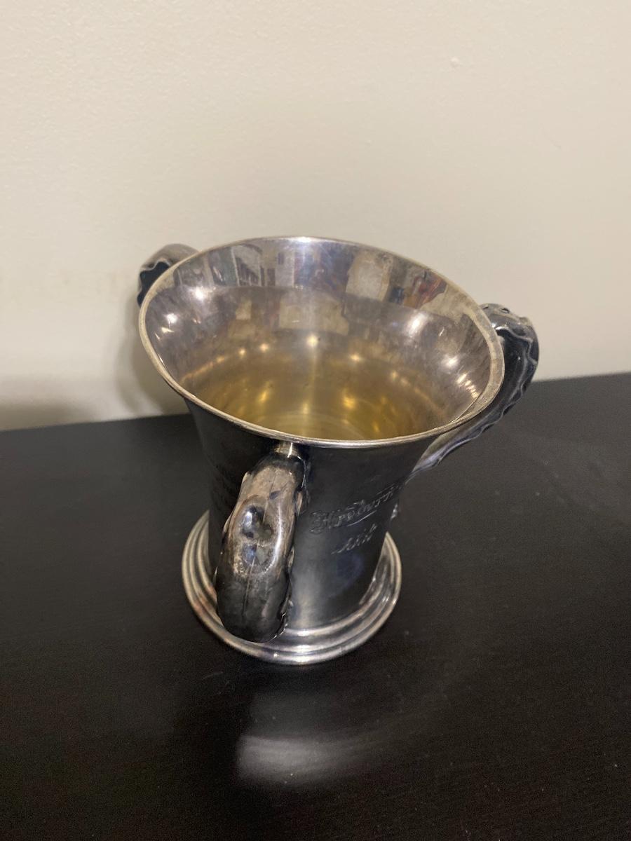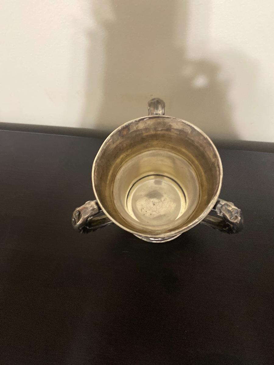 380.7 grams. 244.8 dwt. 12.24 ozt. 5 1/2 “ high. Inscription on side says “friendship above all ties doth bind the heart and faith in friendship is the Nobelist part”. Other side is inscribed Frederick J Paxon 1887 Dash 1901. Underneath is stamped STERLING 1810. Some dents to silver. As is. THIS ITEM HAS A RESERVE OF $300. Pick Up of Purchased Items will be on Saturday the 16th at Morningstar Storage in Bluffton, SC. 1110 Fording Island Rd, Bluffton, SC 29910. At the end of the sale todayI will send out a SignUpGenius link to the winning bidder to schedule your your pick up time along with a contact phone number.