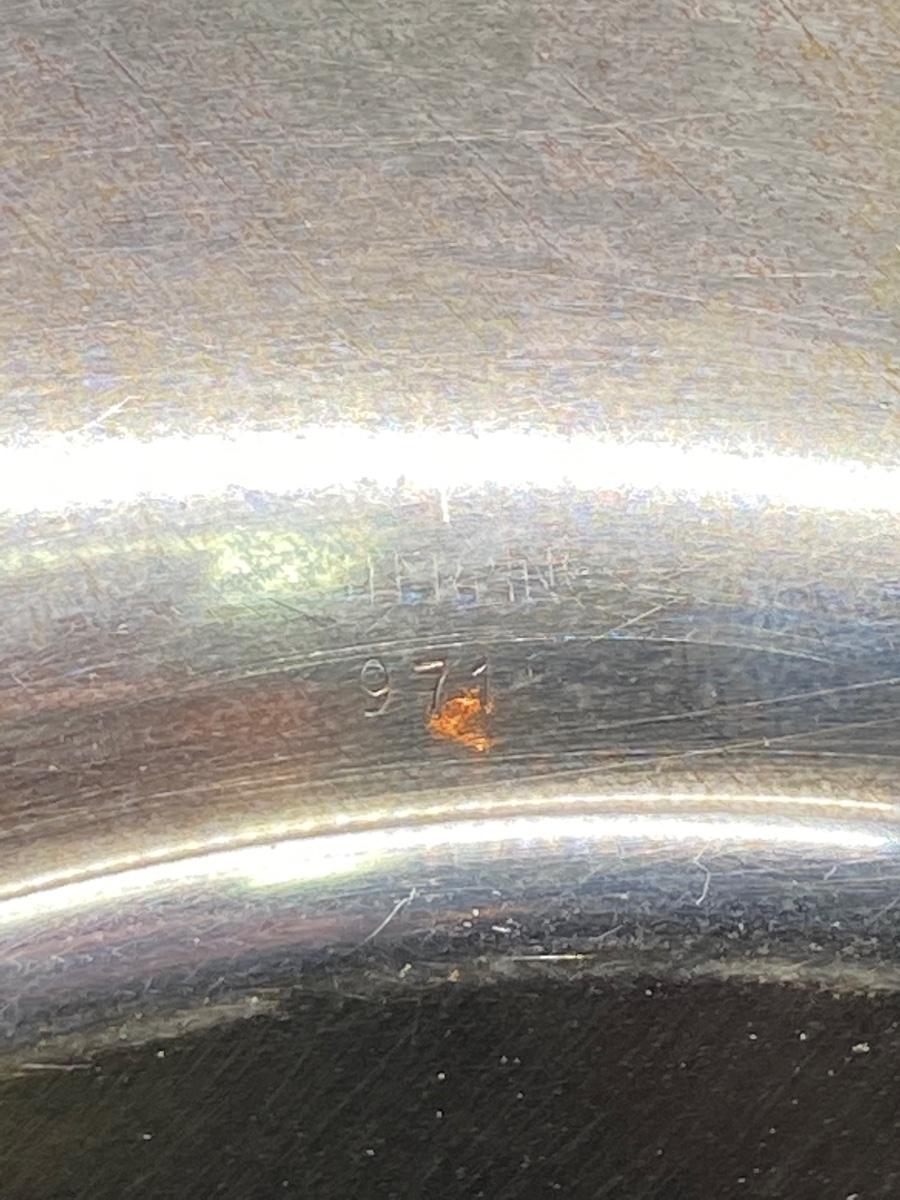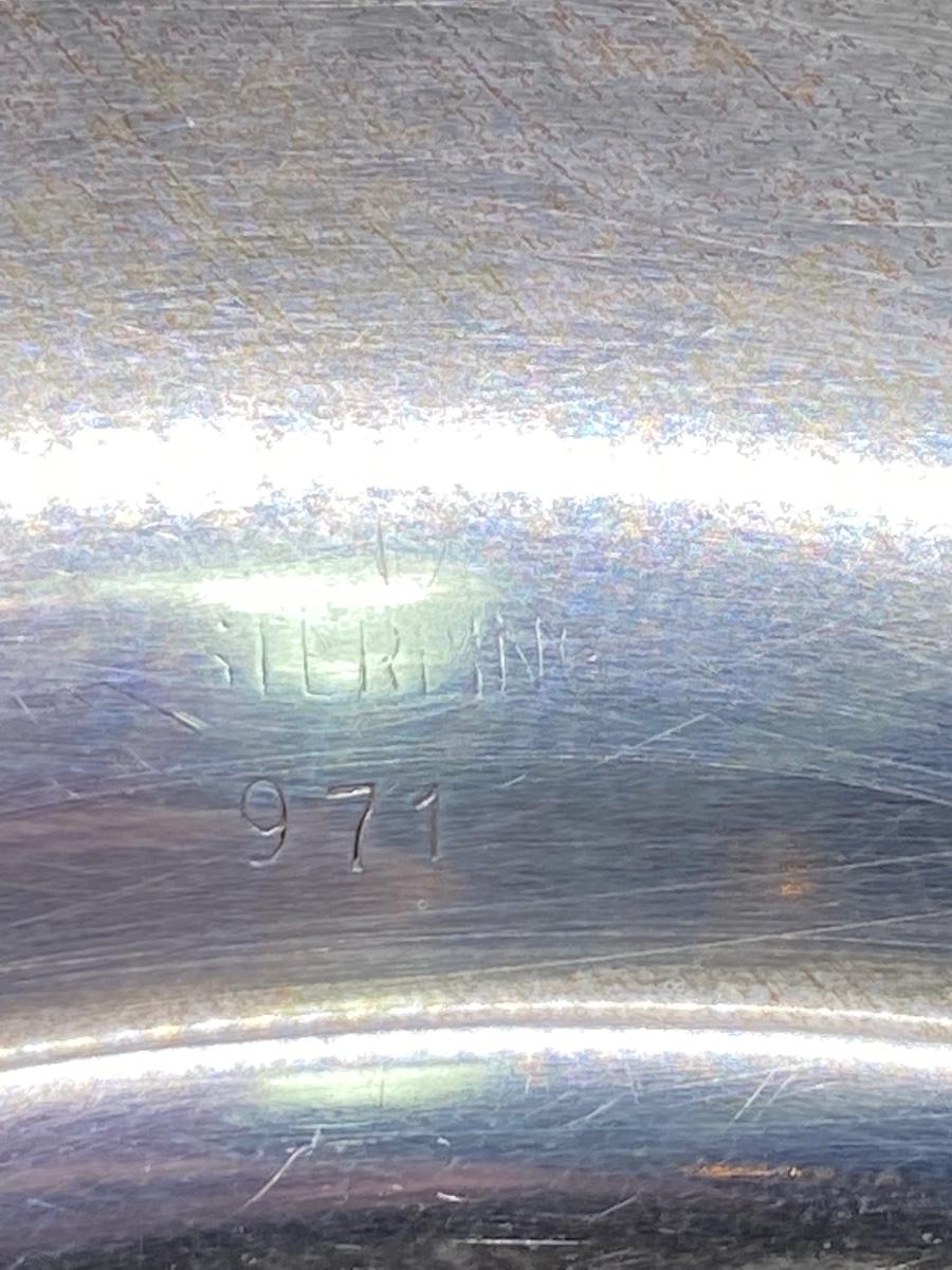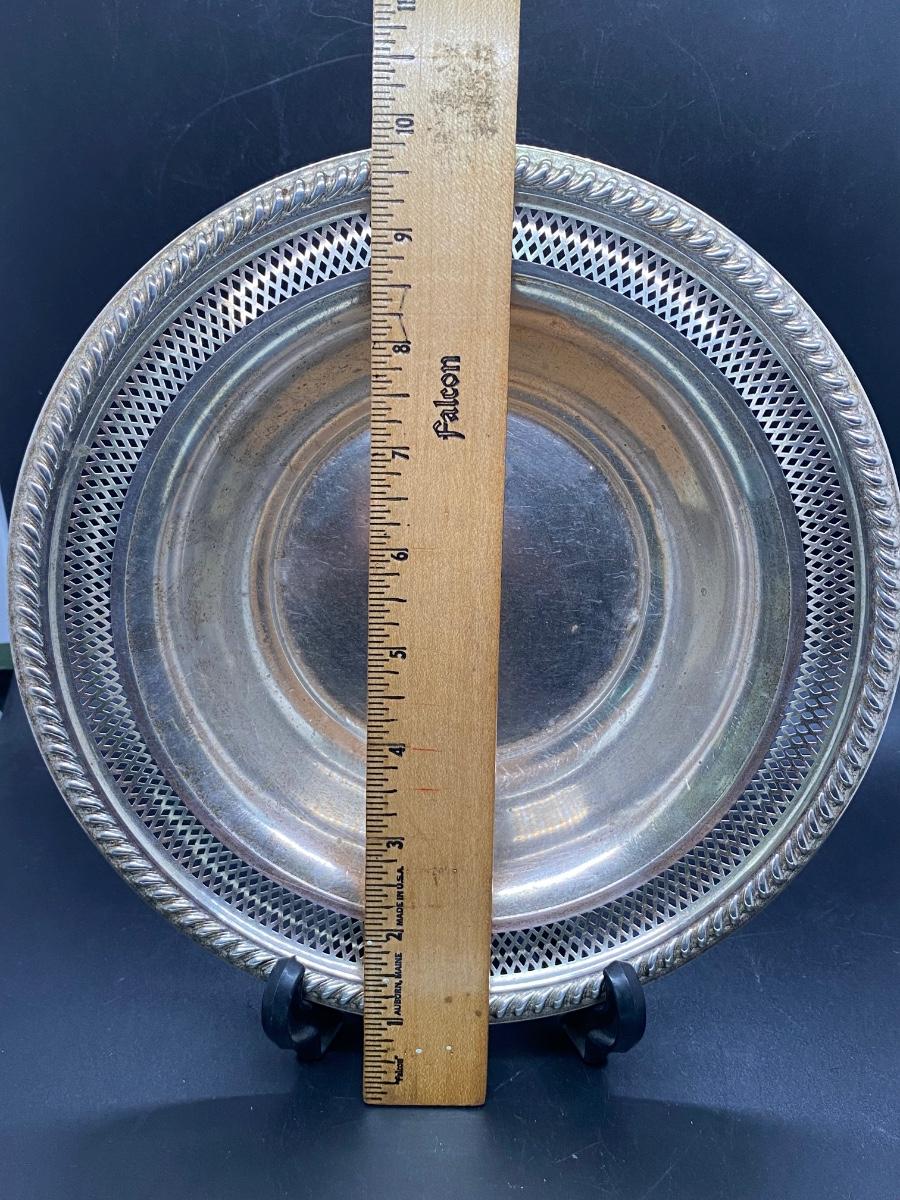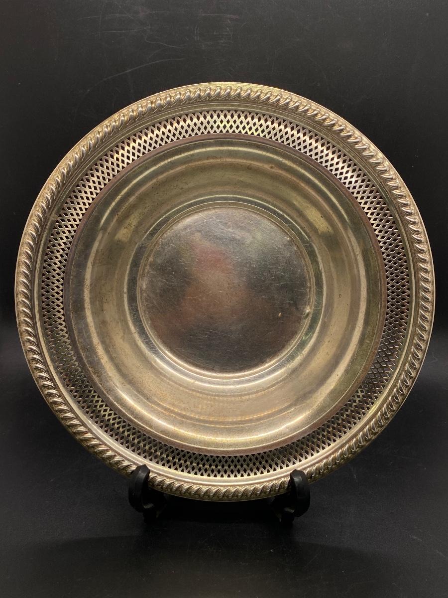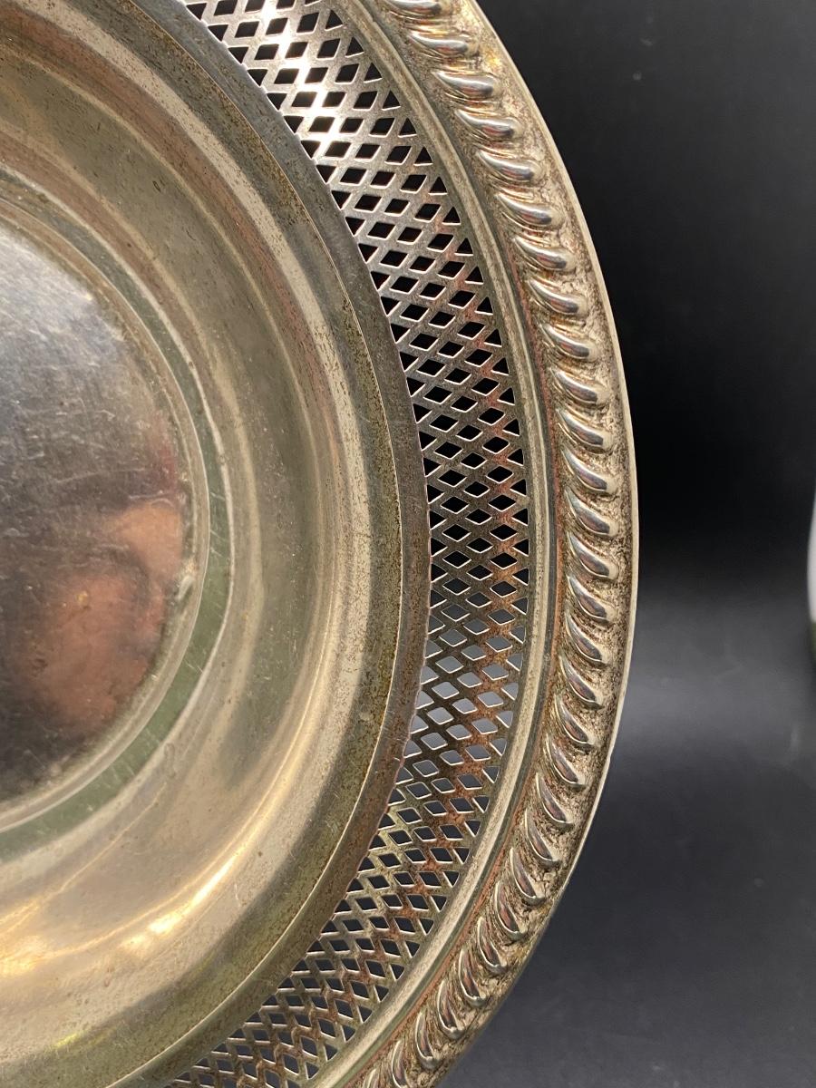 Sterling silver serving bowl. Open work lattice edge. Marked on the side near the bottom, very faint. In good condition, about 9" diameter.