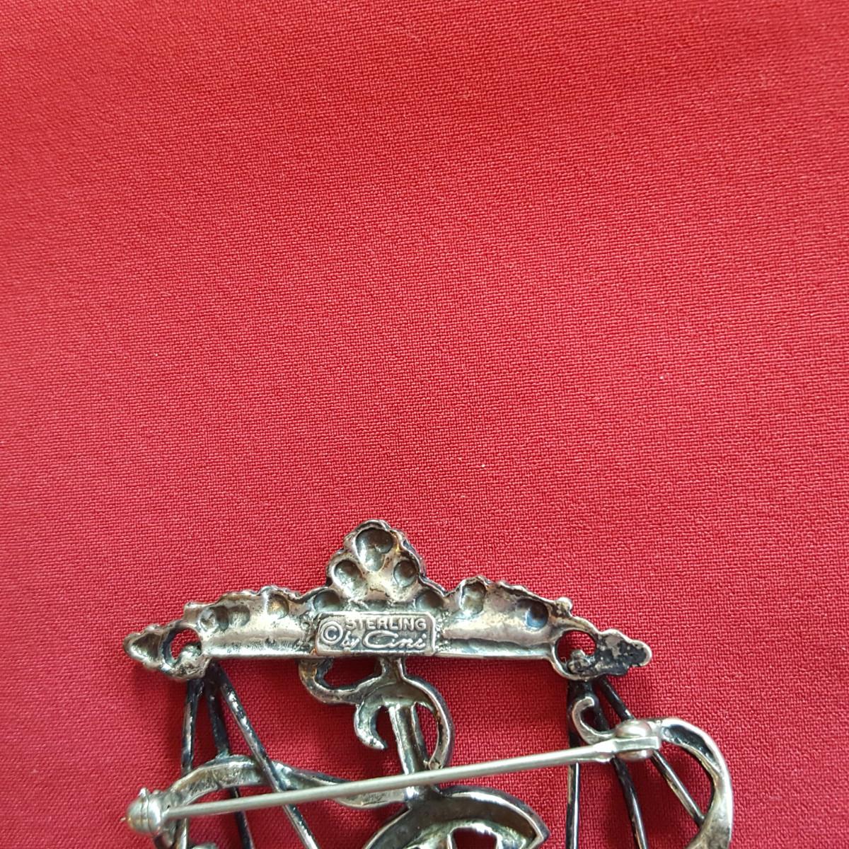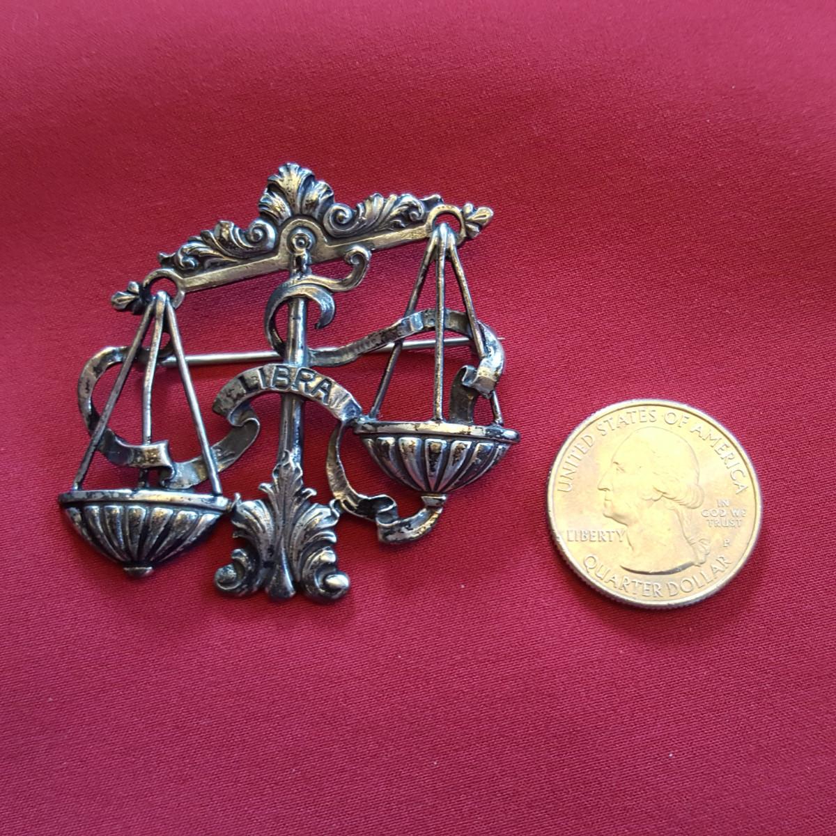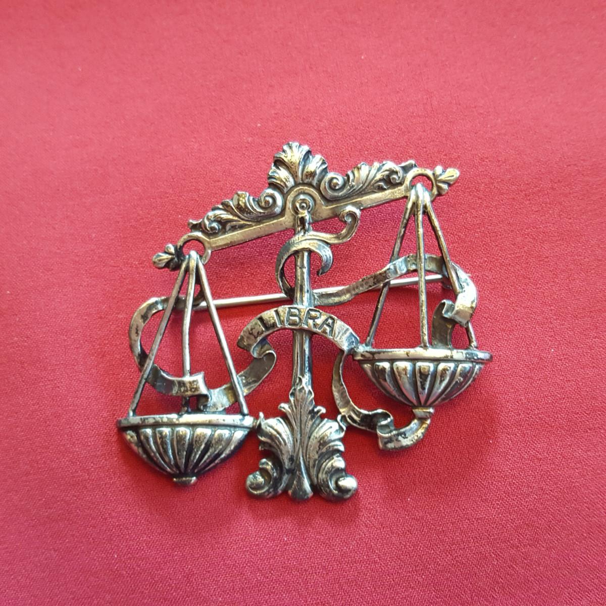 This auction lot is for a Sterling Silver Libra Brooch. The brooch is marked sterling and has a copyright mark by Cini. The brooch depicts the scales of justice and has the wording Libra on the ribbon. The brooch weighs approximately .536toz.