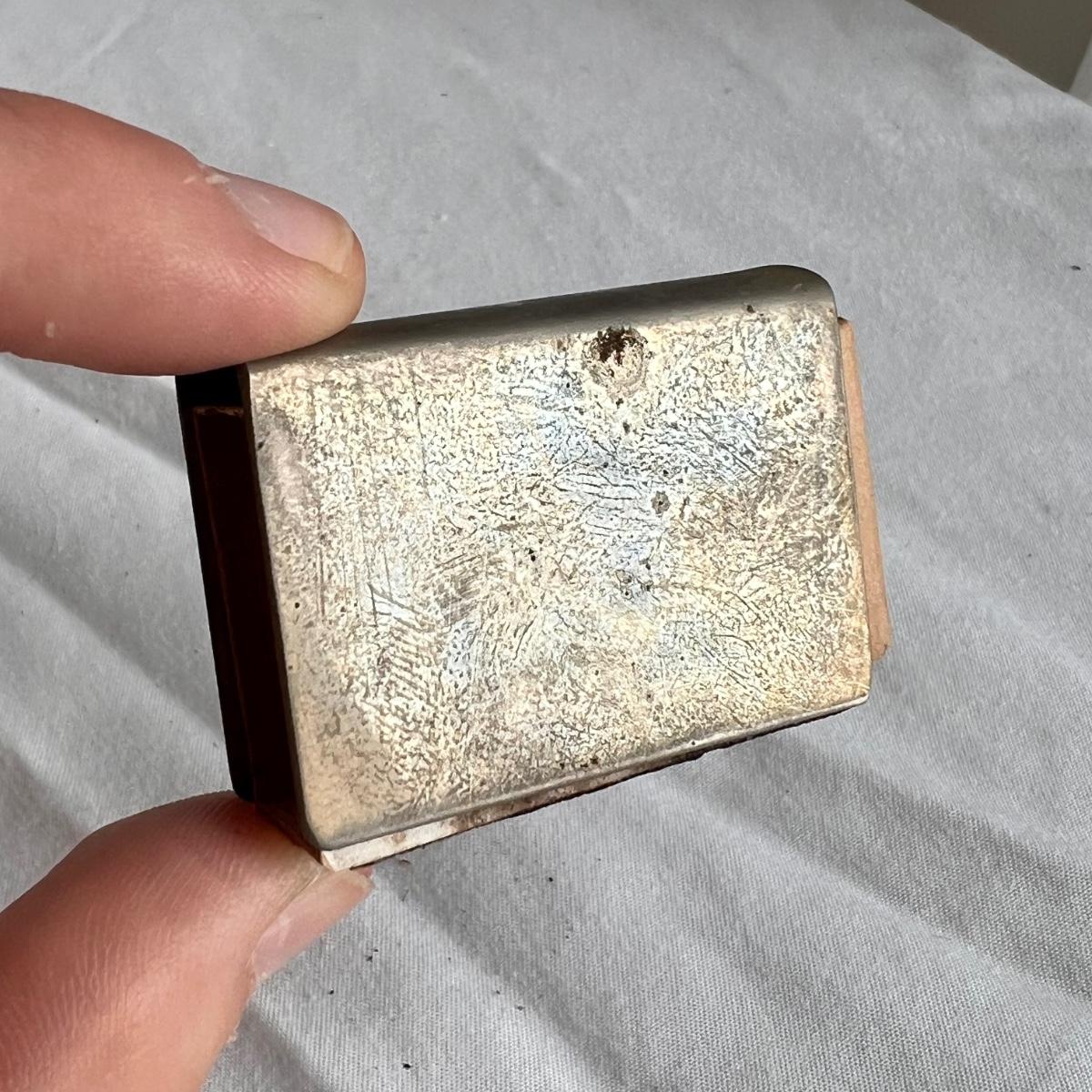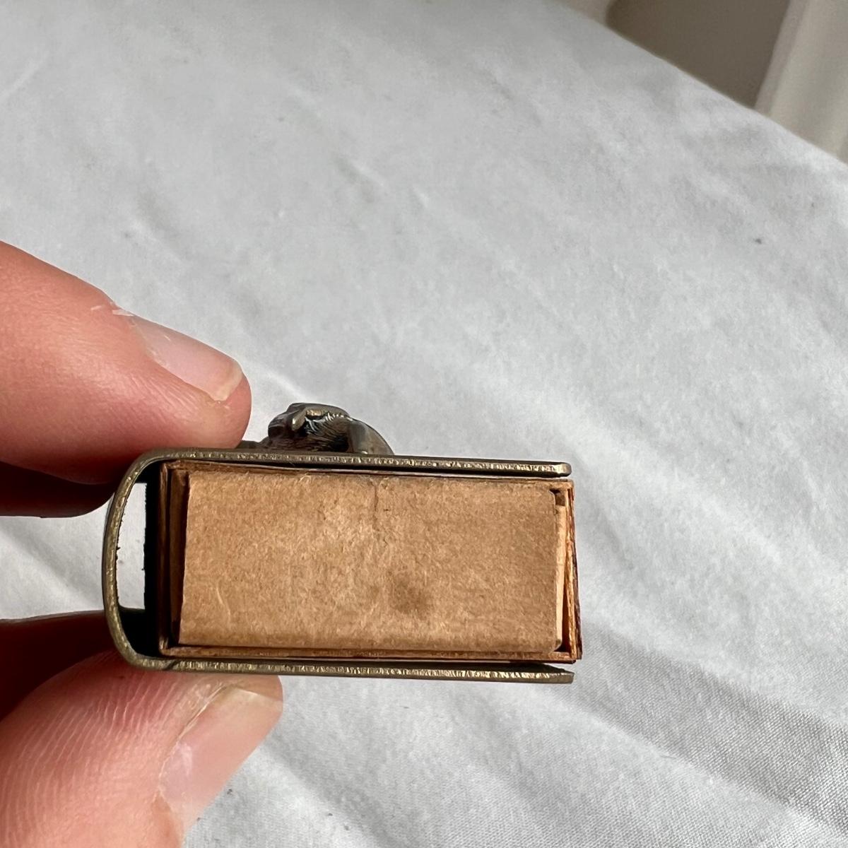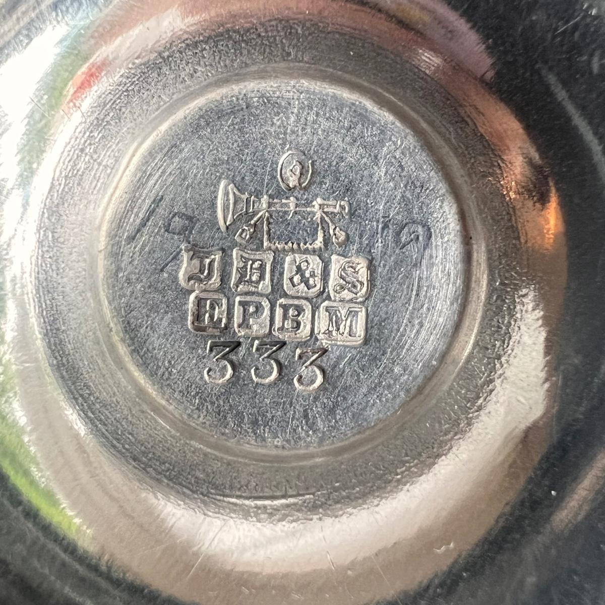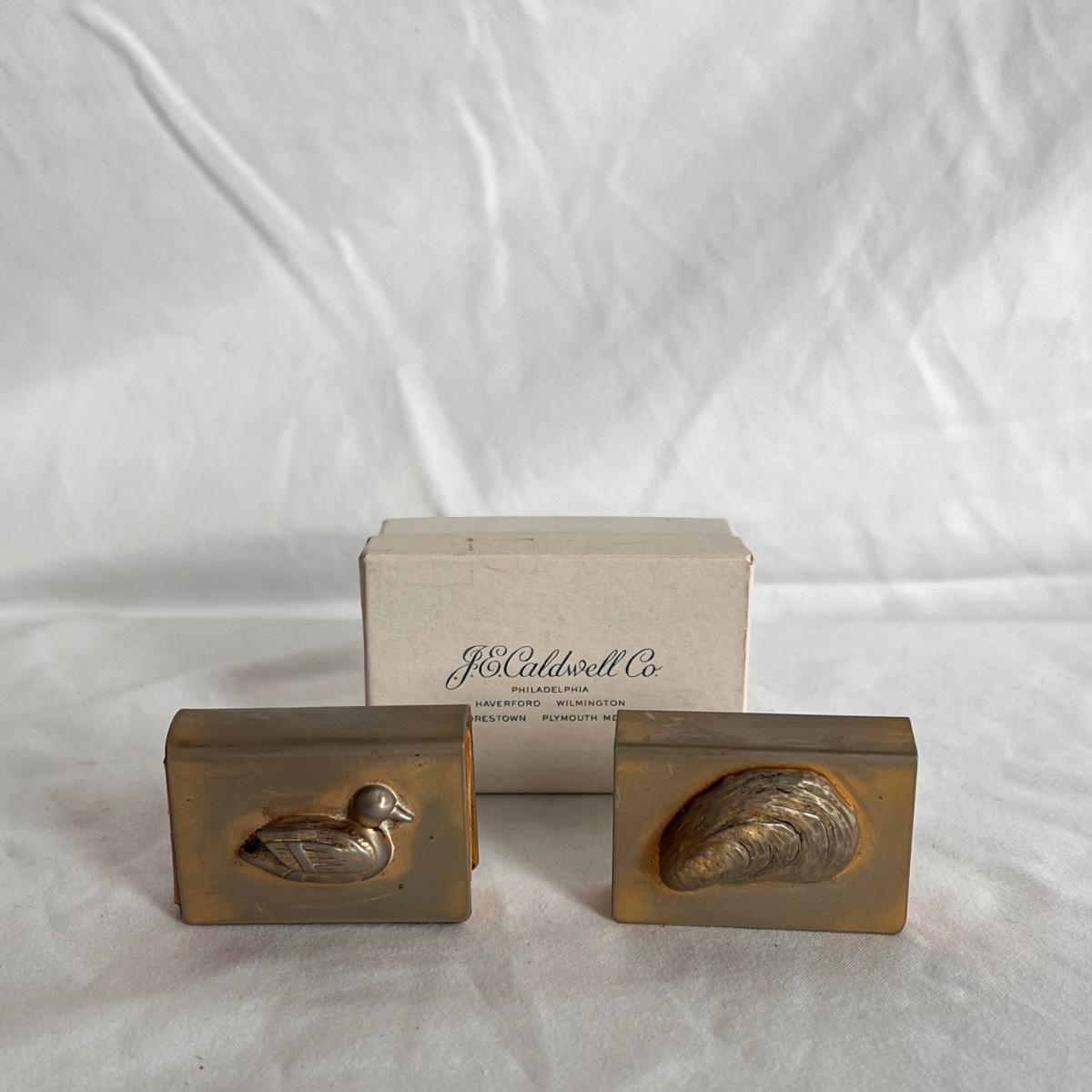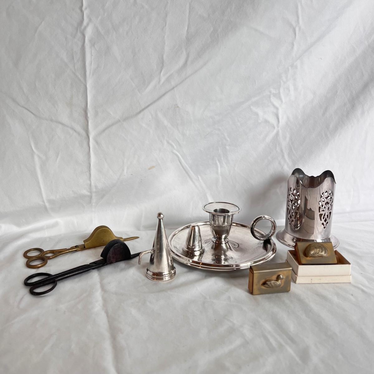 This lot includes one silver plated condiment holder with cutouts, one sterling silver lighter, one candle holder and snuffer, two wick scissors, and two matchbox holders that appear to be silver plated. The candle holder measures 6” x 2”H and appears to be stamped with James Dixon & Sons, EPBM. The lighter is stamped with sterling silver on the bottom. The matchbox holders came in a J.E. Caldwell Co. box, but aren’t stamped. Shipping available.
