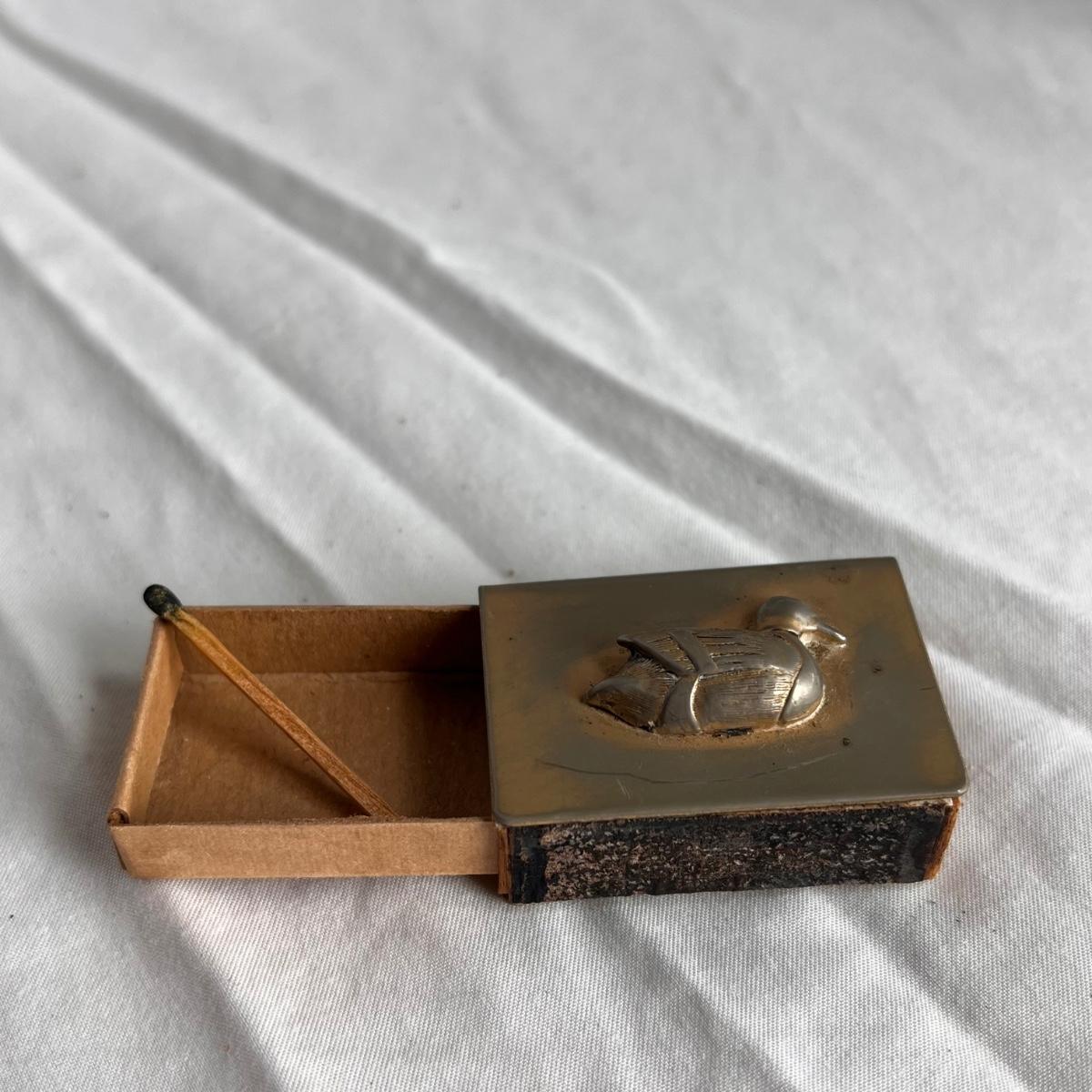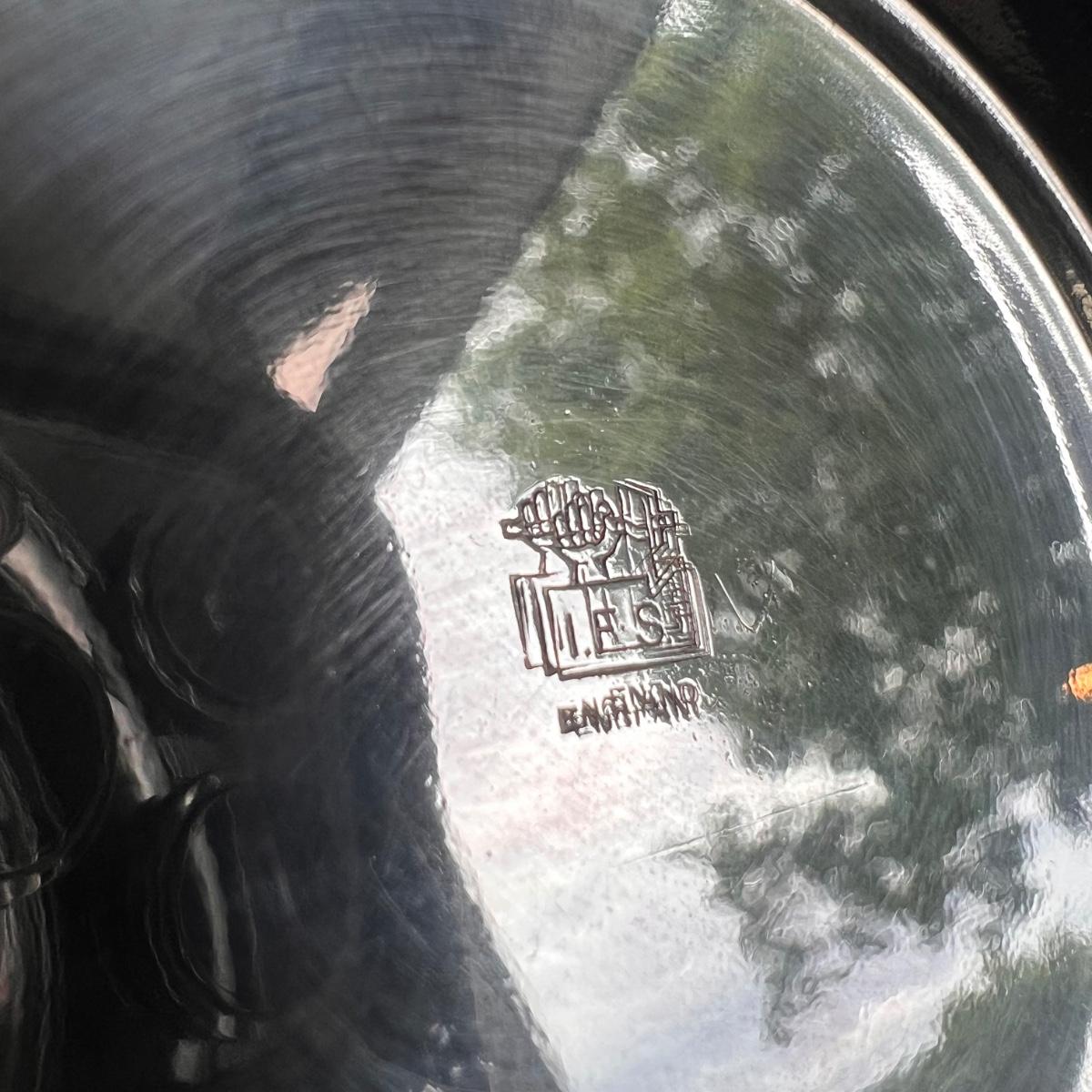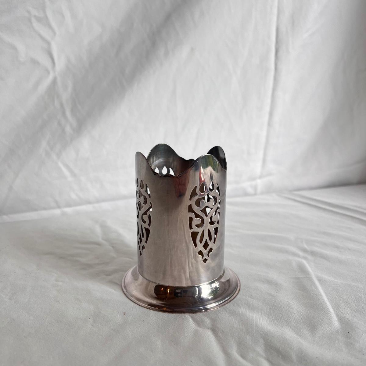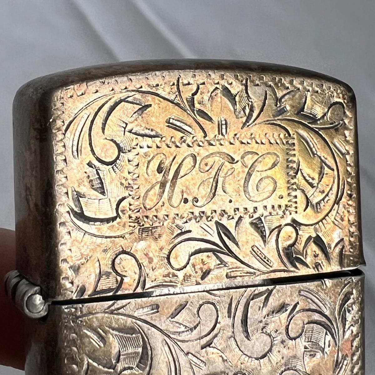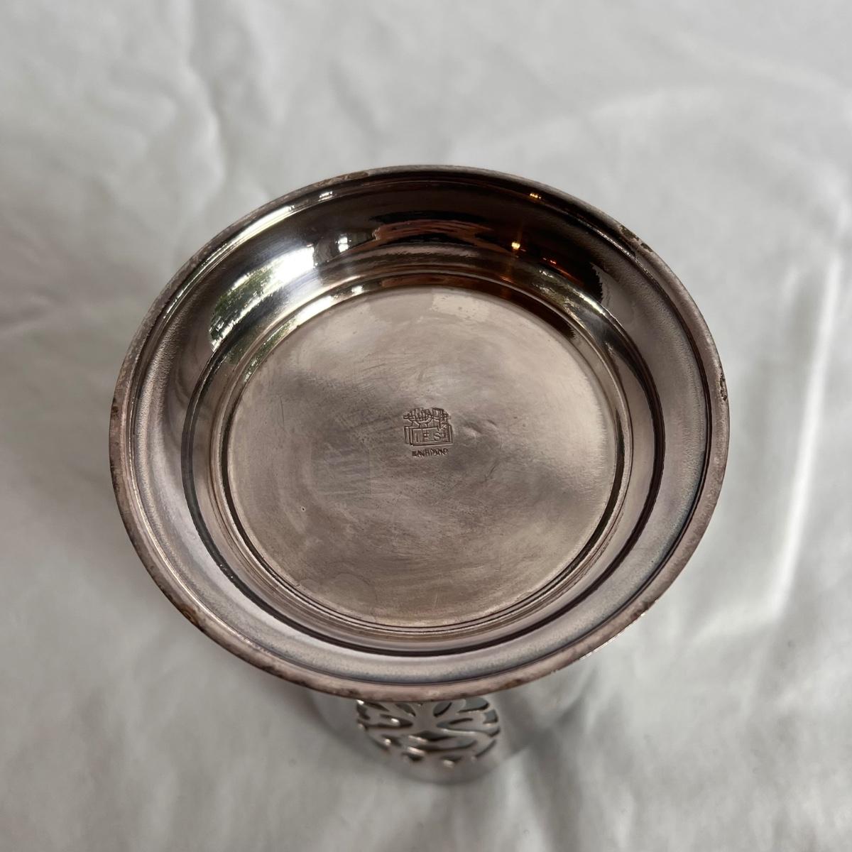 This lot includes one silver plated condiment holder with cutouts, one sterling silver lighter, one candle holder and snuffer, two wick scissors, and two matchbox holders that appear to be silver plated. The candle holder measures 6” x 2”H and appears to be stamped with James Dixon & Sons, EPBM. The lighter is stamped with sterling silver on the bottom. The matchbox holders came in a J.E. Caldwell Co. box, but aren’t stamped. Shipping available.