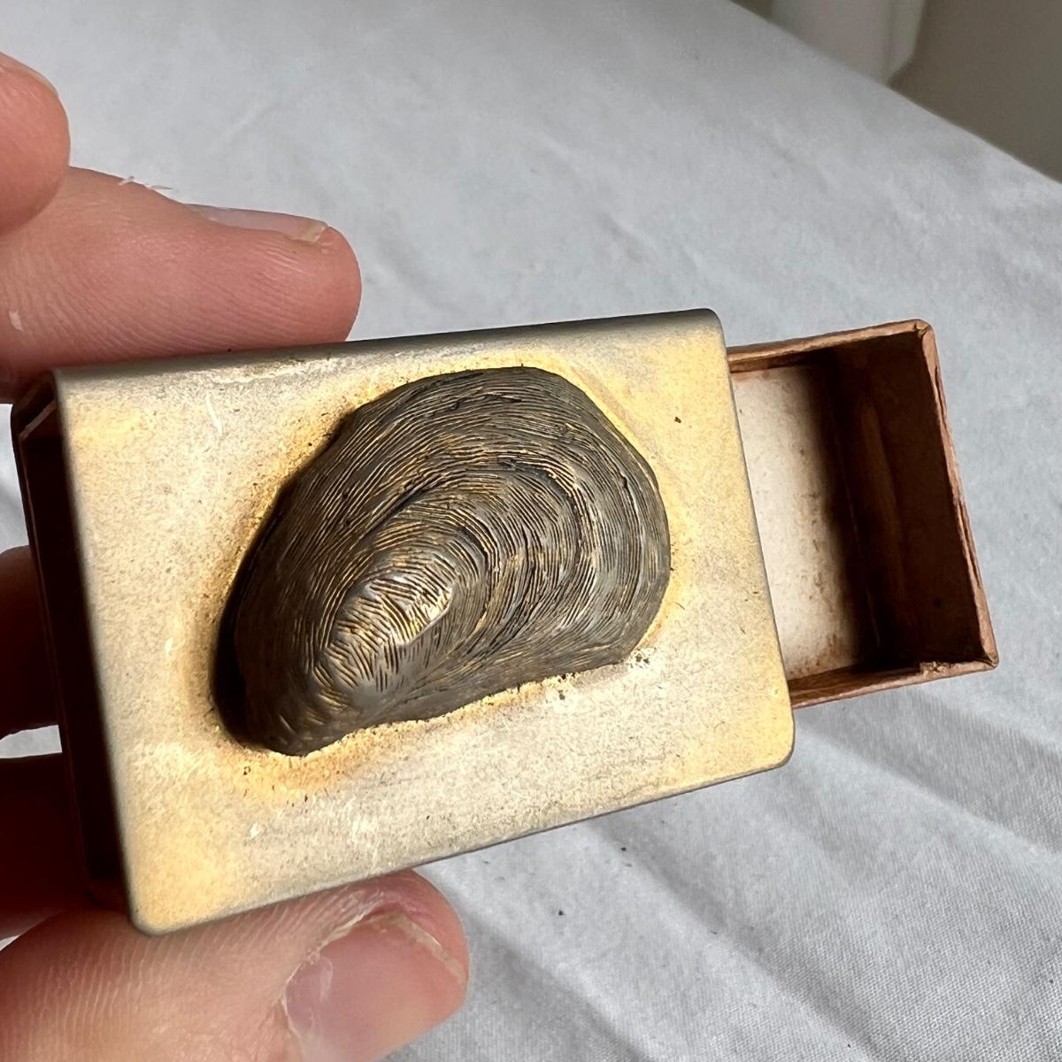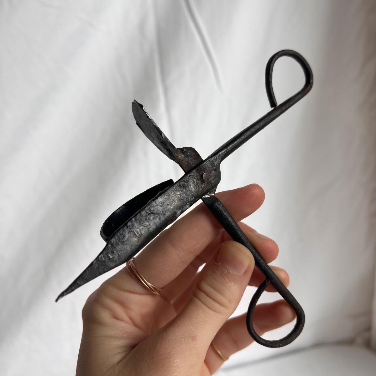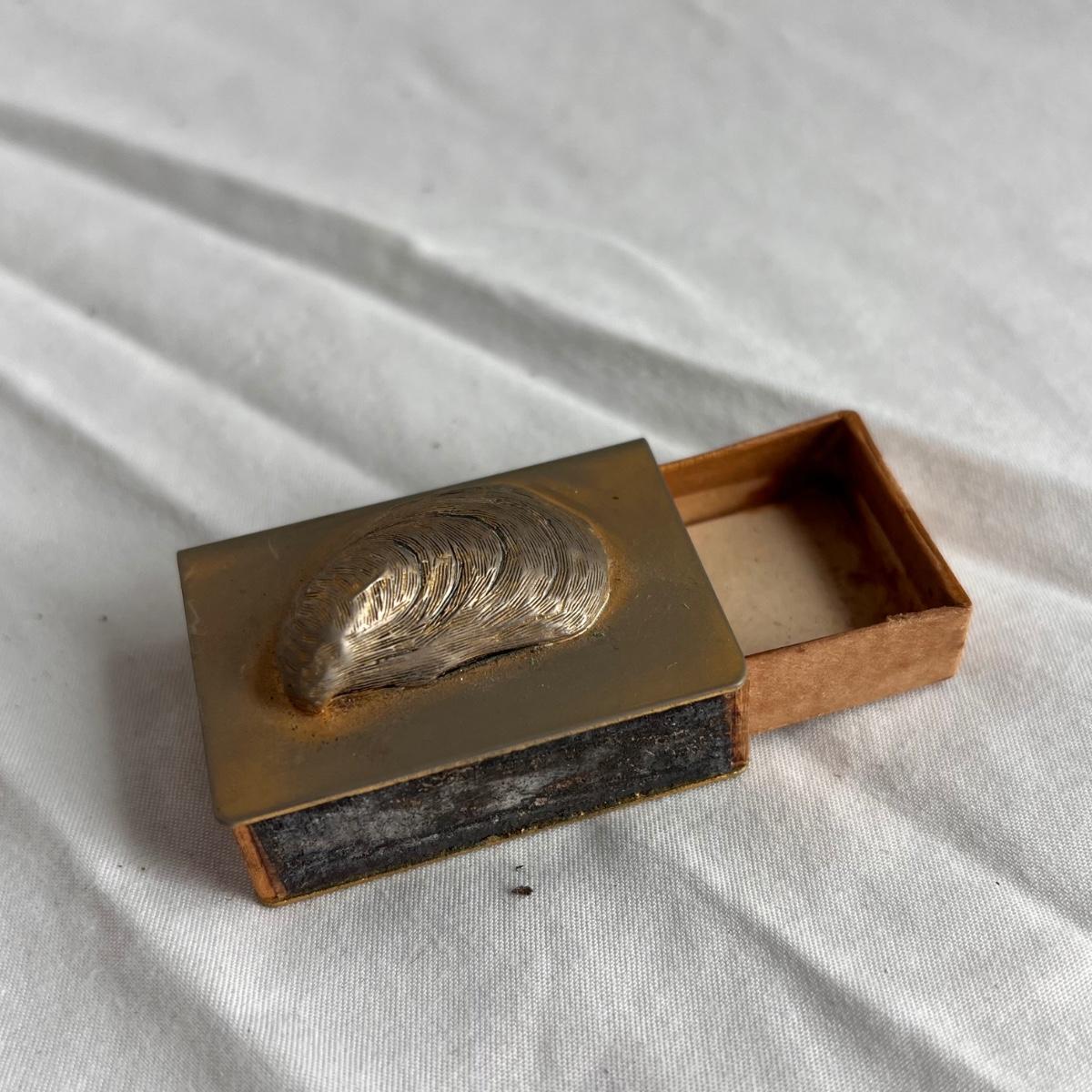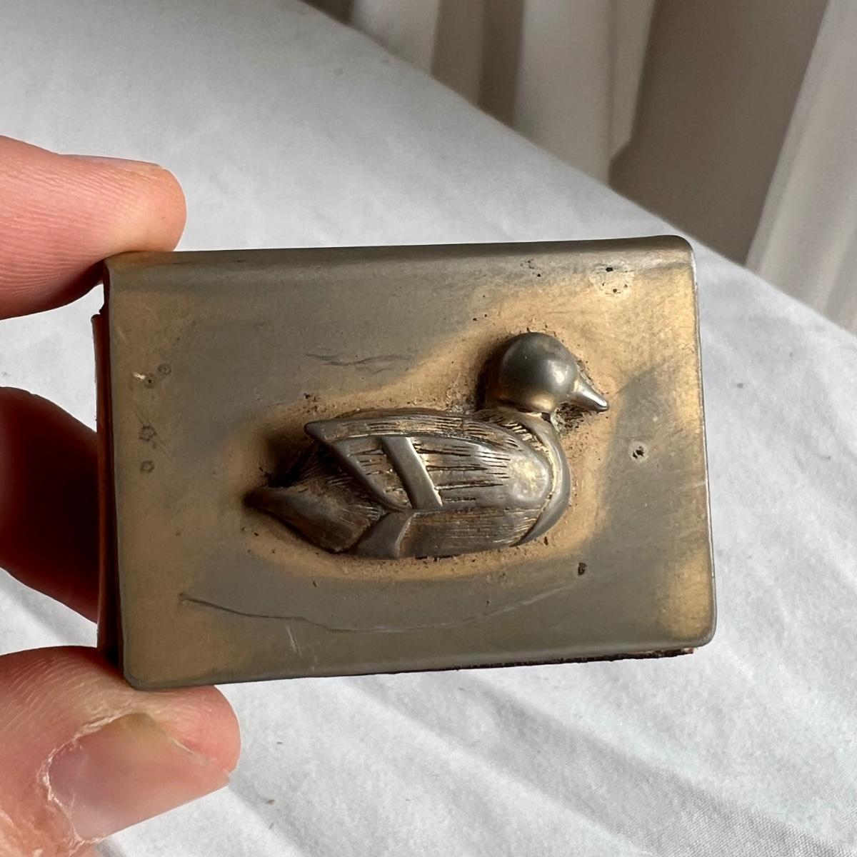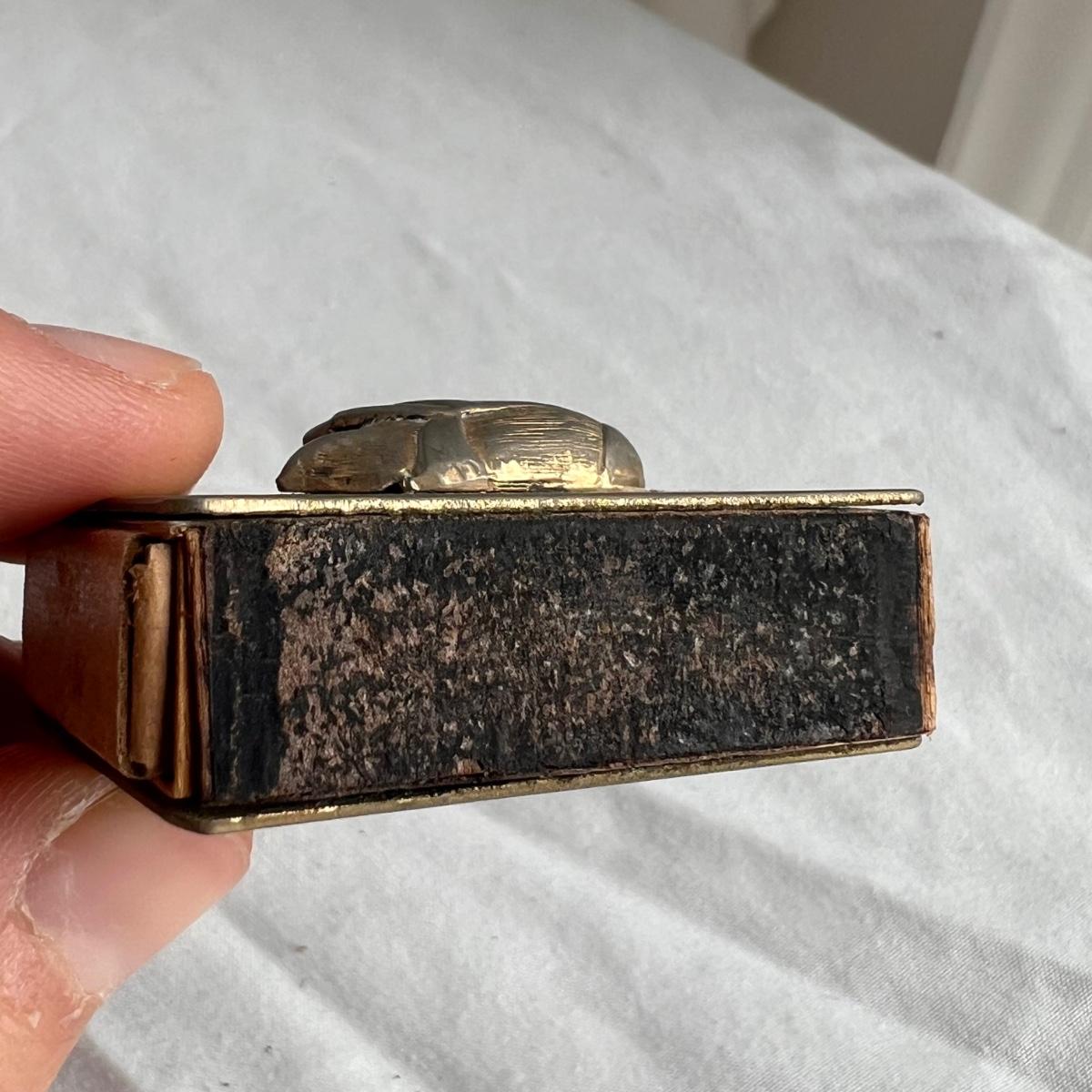 This lot includes one silver plated condiment holder with cutouts, one sterling silver lighter, one candle holder and snuffer, two wick scissors, and two matchbox holders that appear to be silver plated. The candle holder measures 6” x 2”H and appears to be stamped with James Dixon & Sons, EPBM. The lighter is stamped with sterling silver on the bottom. The matchbox holders came in a J.E. Caldwell Co. box, but aren’t stamped. Shipping available.