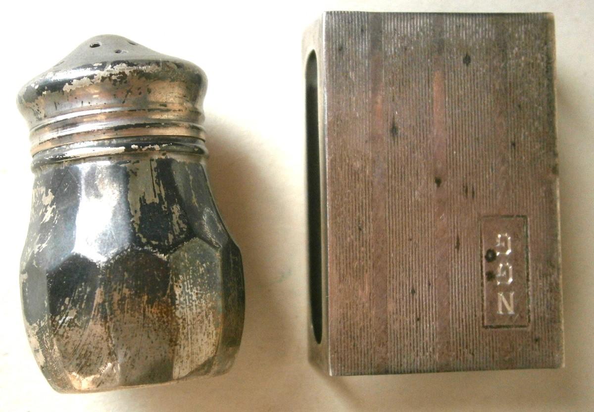 Sterling Silver Matchbox Holder together with individual Sterling salt shaker, matchbox holder is 1 3/4 in. long and shaker is 1 1/2 in. tall.