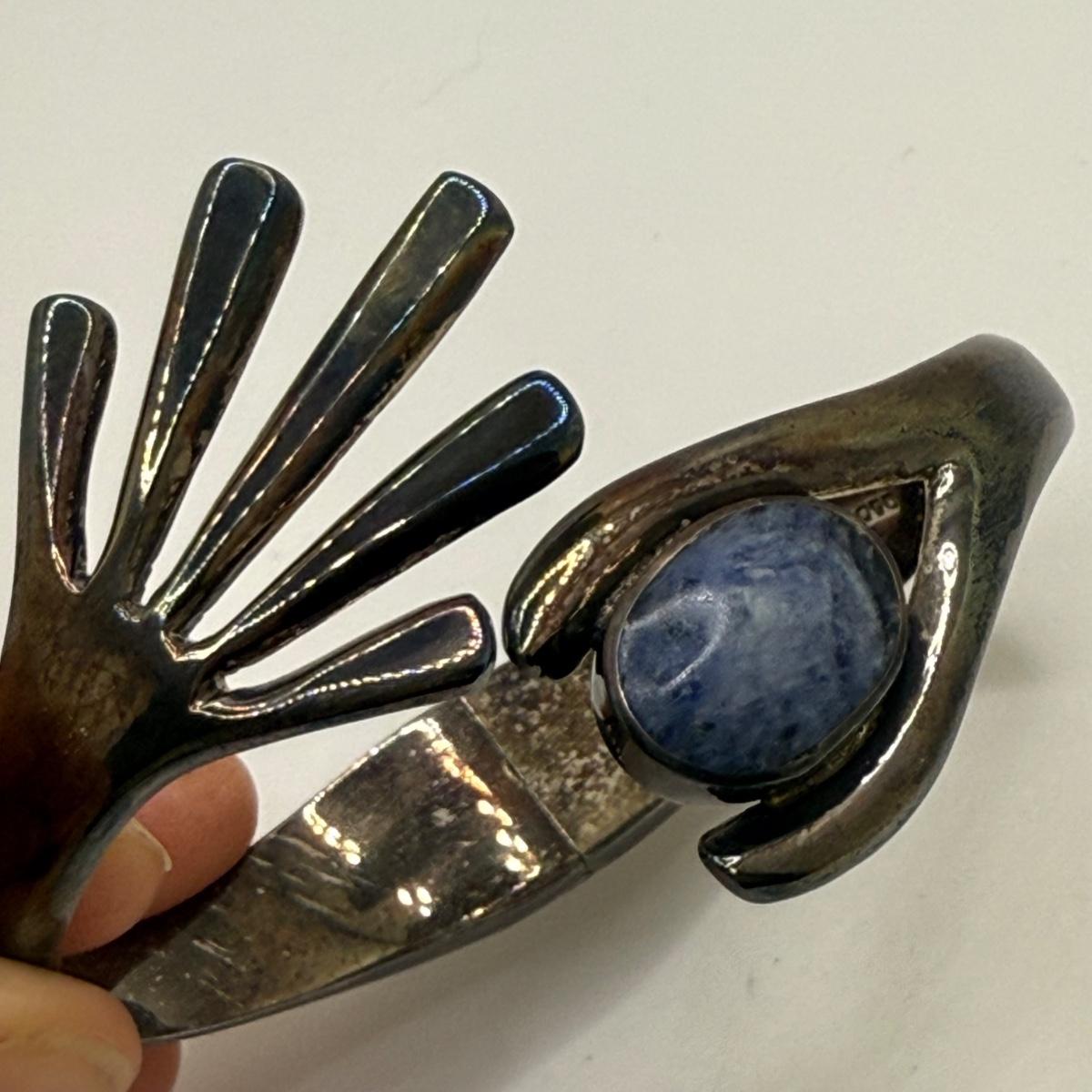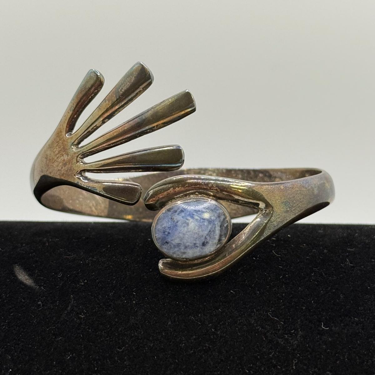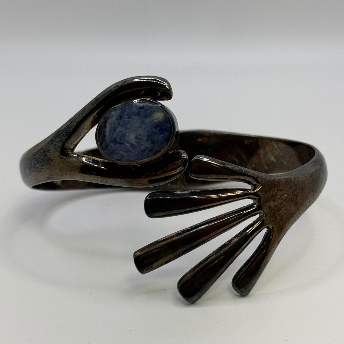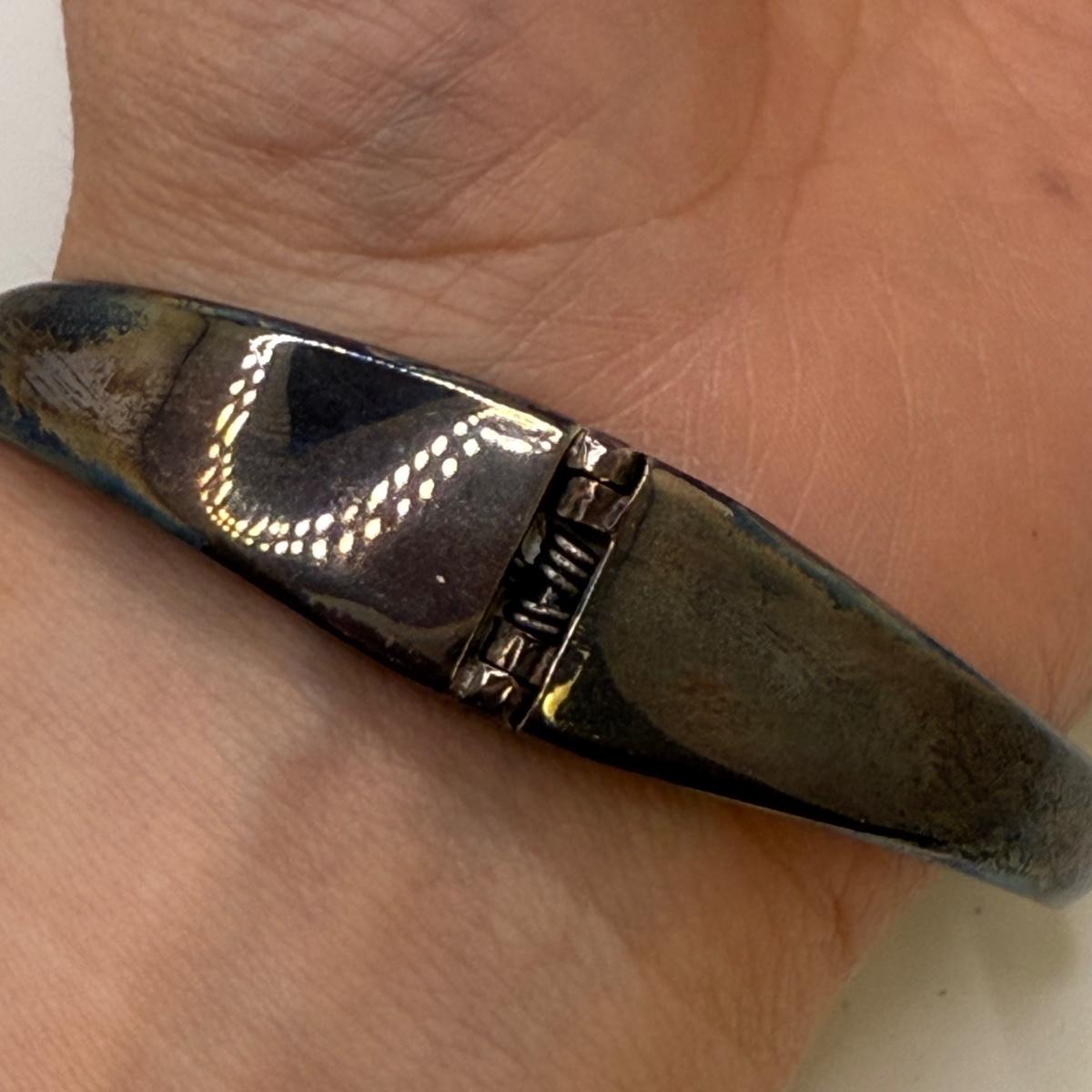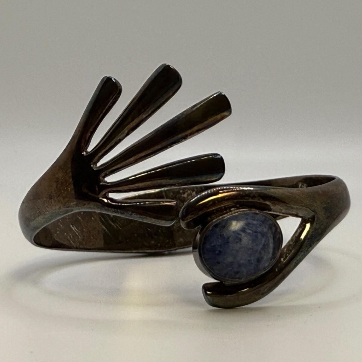 Unique cuff bracelet with lovely light blue stone. It has a spring hinge to open it slightly. The stamps inside appear to say ‘Mexico 950 TL-83’. It is tarnished.