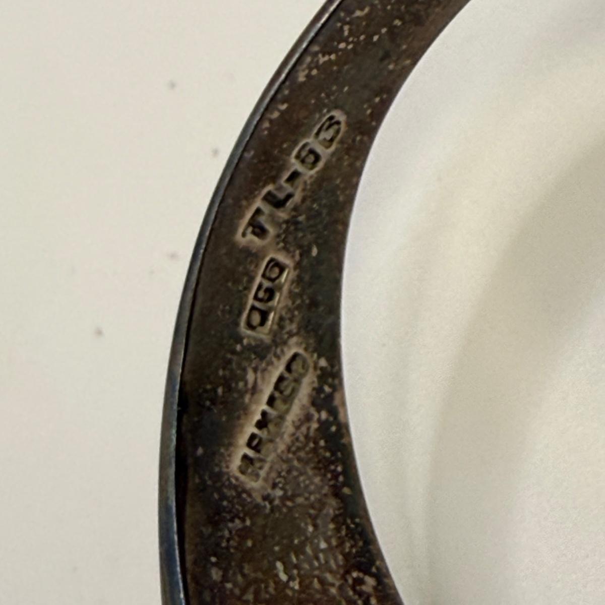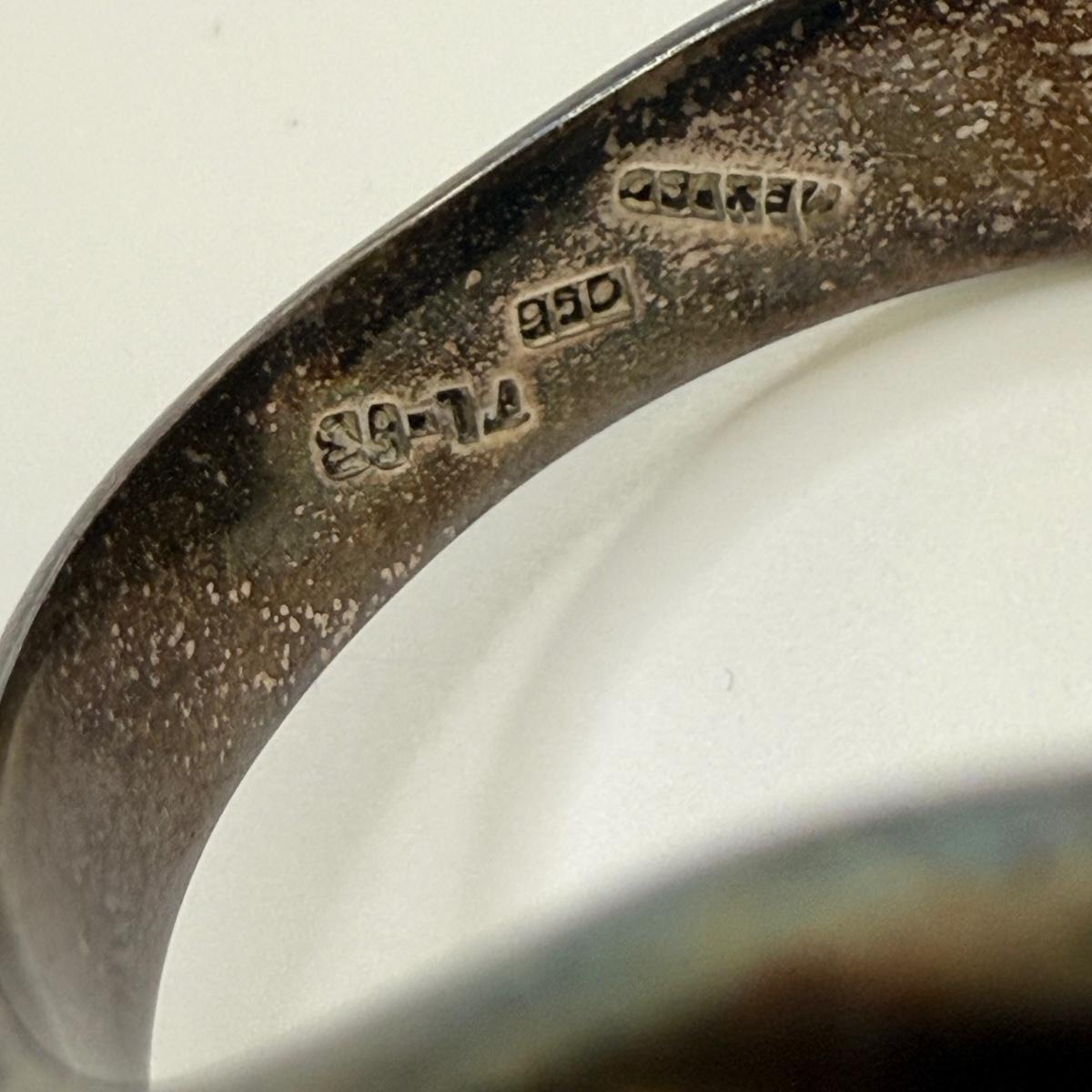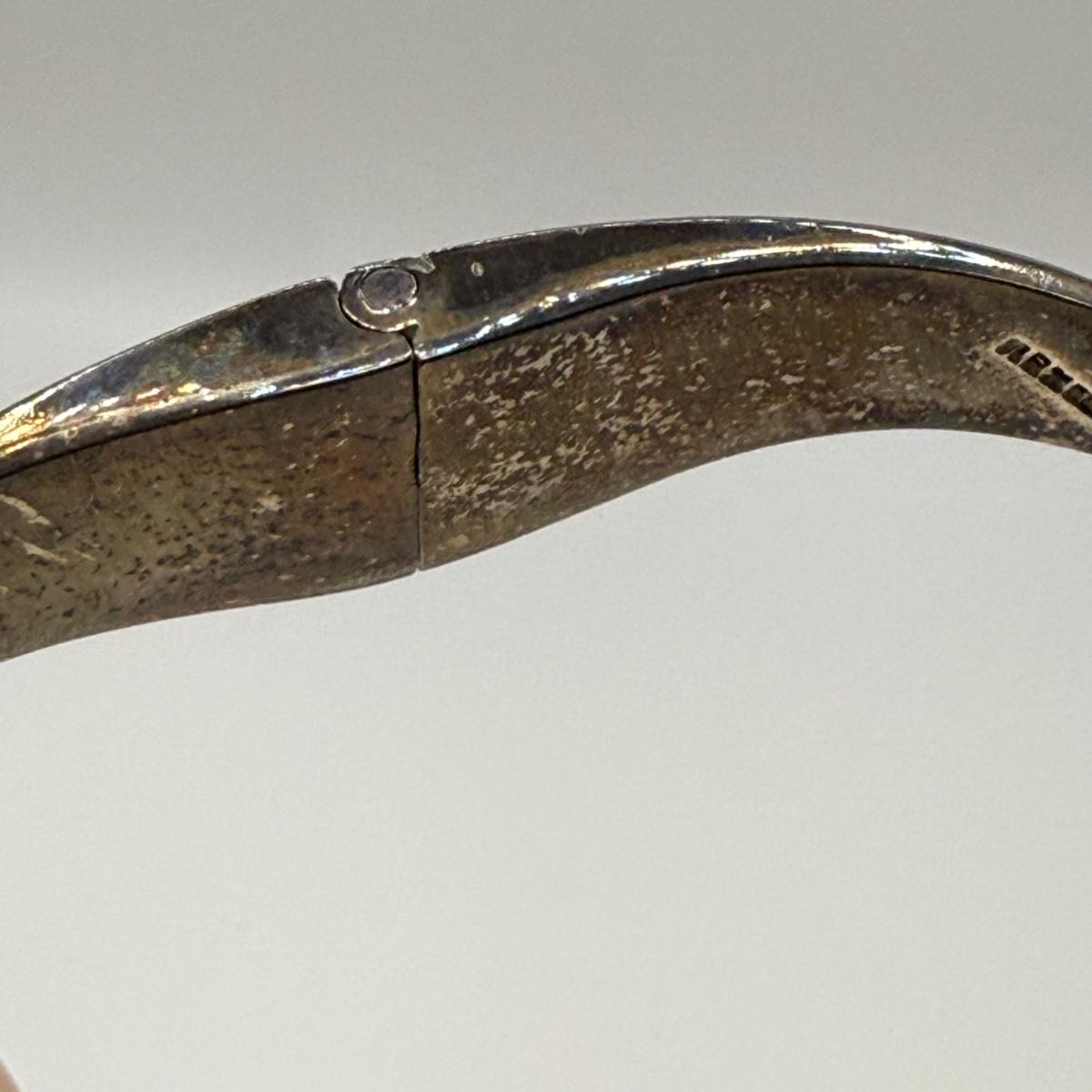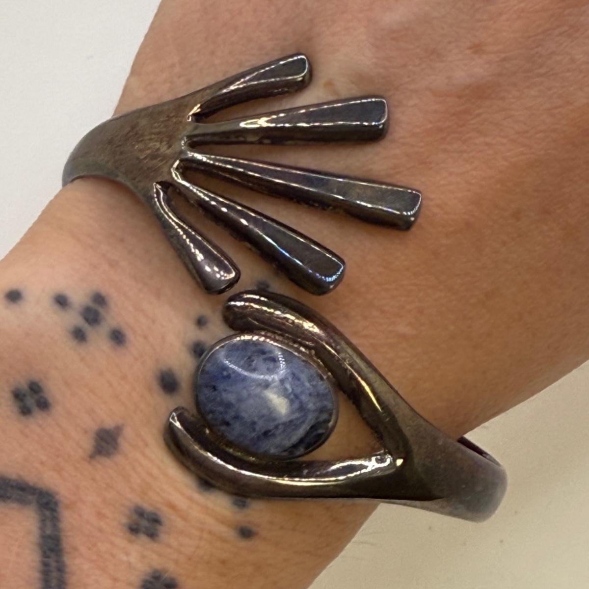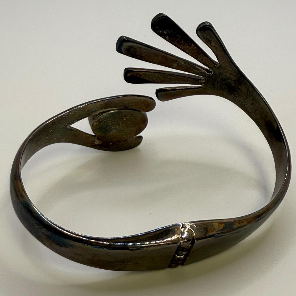 Unique cuff bracelet with lovely light blue stone. It has a spring hinge to open it slightly. The stamps inside appear to say ‘Mexico 950 TL-83’. It is tarnished.