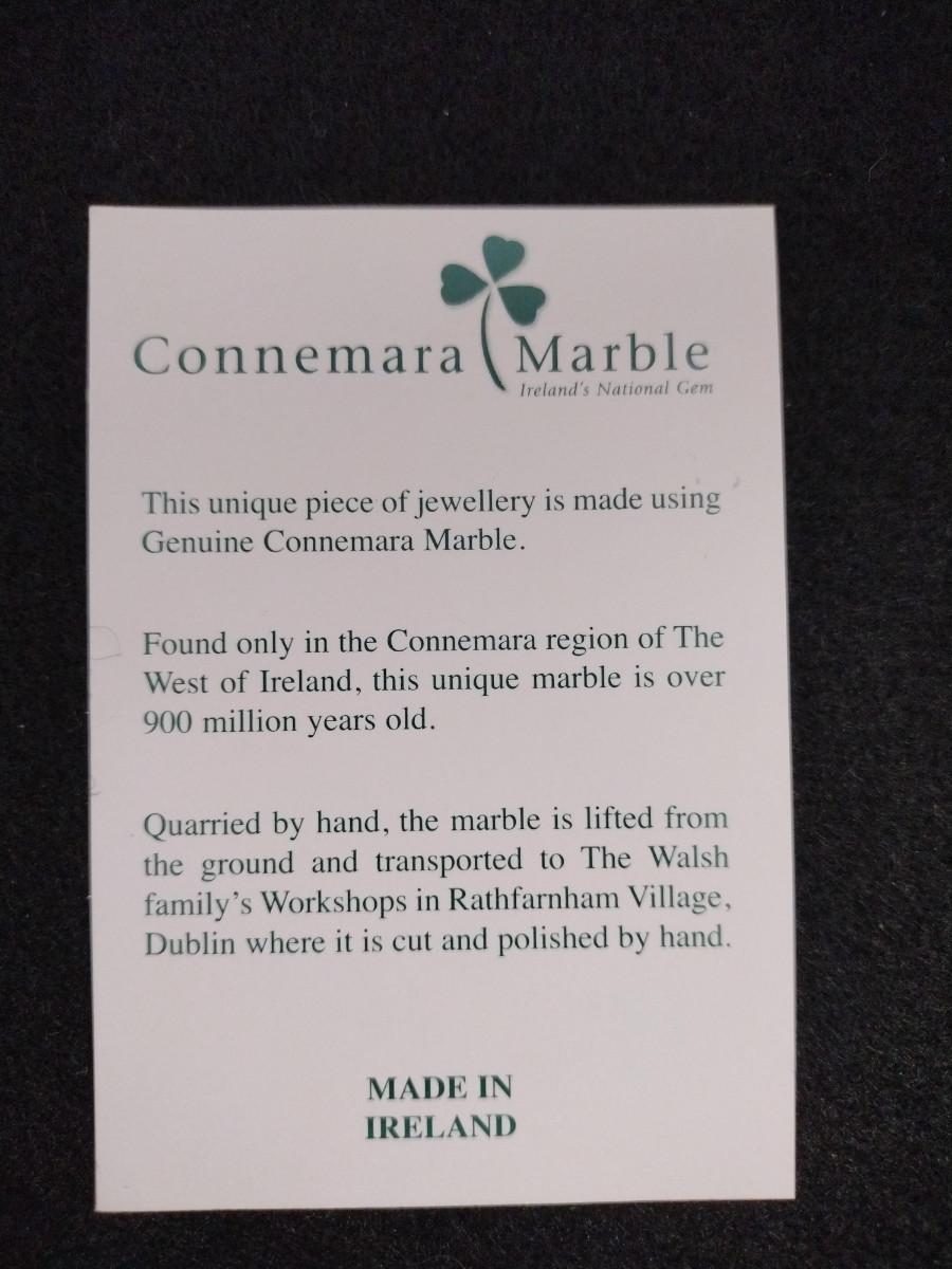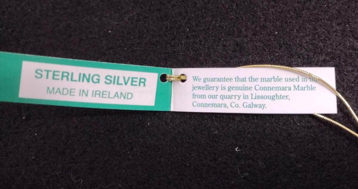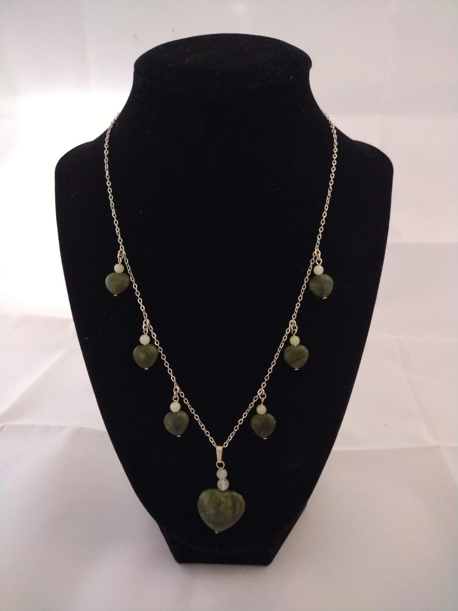Necklace is marked 925 Sterling, 18-20 inch adjustable necklace. Adorned with 8 Connemara marble hearts, made in Ireland