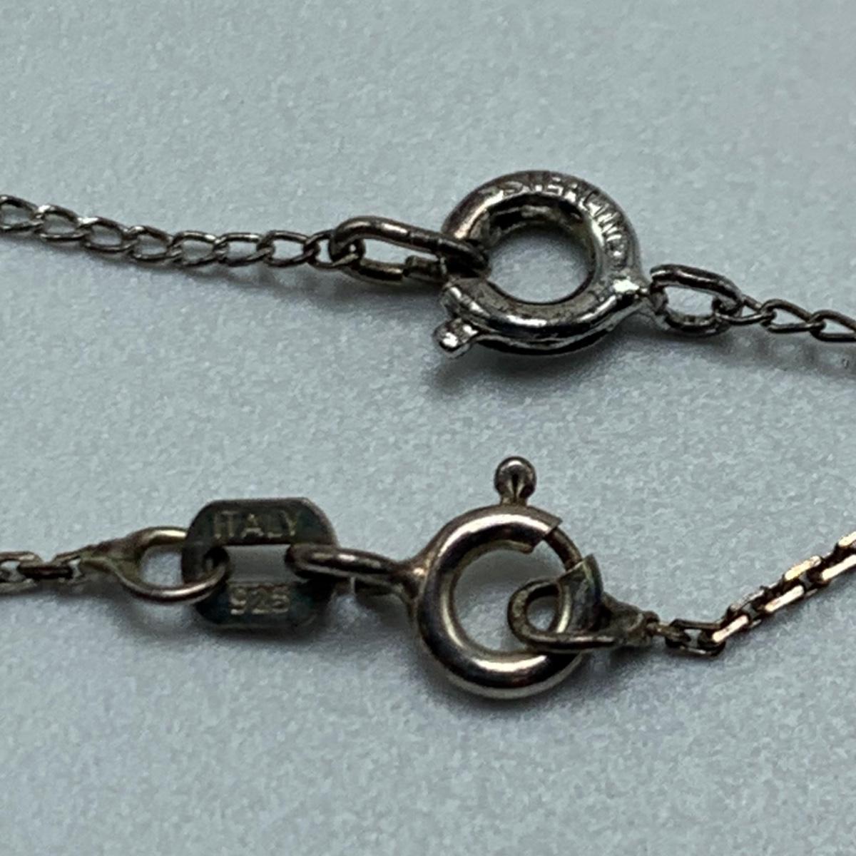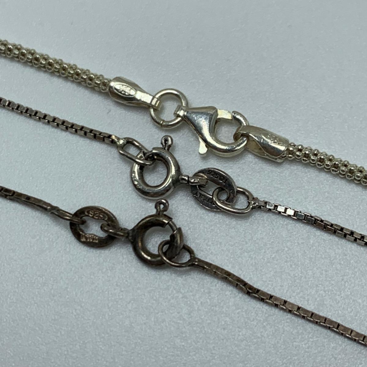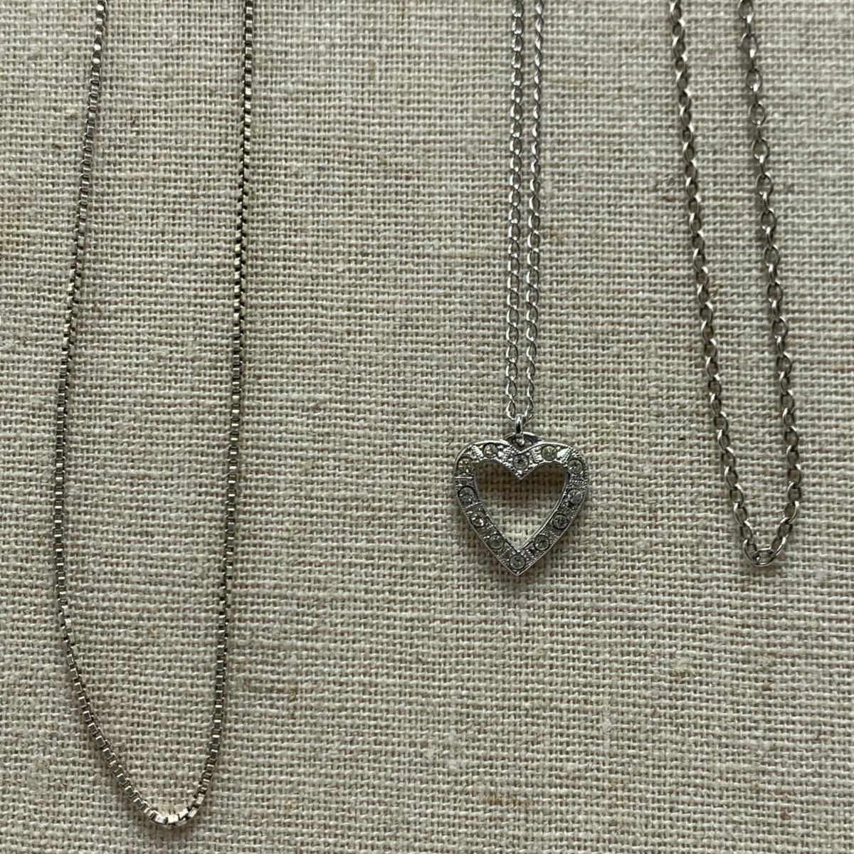 11 necklace chains and one heart shaped pendant. All 11 of the chains are marked 925 or Sterling, the pendant is not. The chains are various styles: chain link, rounded, squared, and more. The longest chain is 21“ long and the shortest is 16“ long. See images for all other markings as well. All sales are final. No returns or refunds. Please bid accordingly.