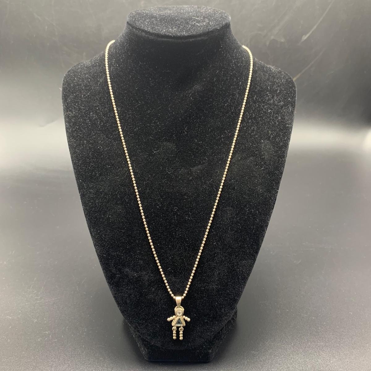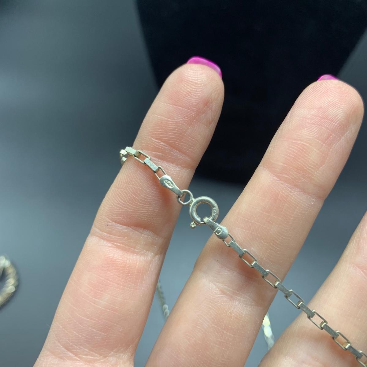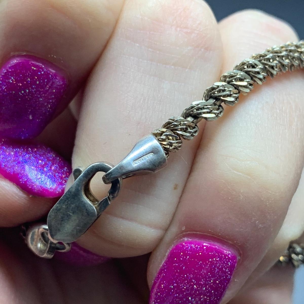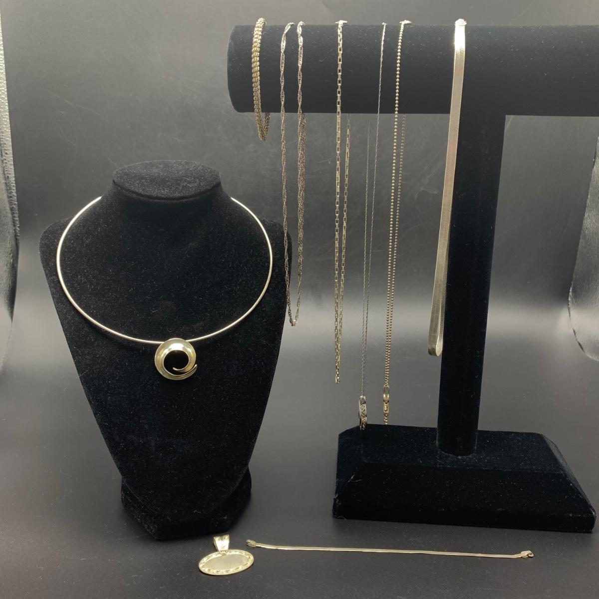 Five Sterling silver necklace chains, two bracelets, one sterling metal choker collar, and four necklace pendants. One bracelet needs the clasp replaced. The pendant on the choker is marked “M. Good 925”. The longest chain is a 30” chain. The shortest is 18”. Shipping available.