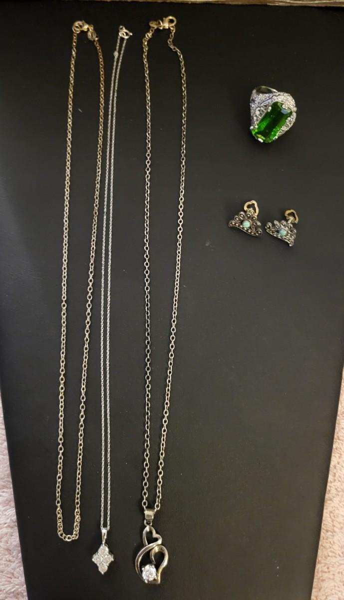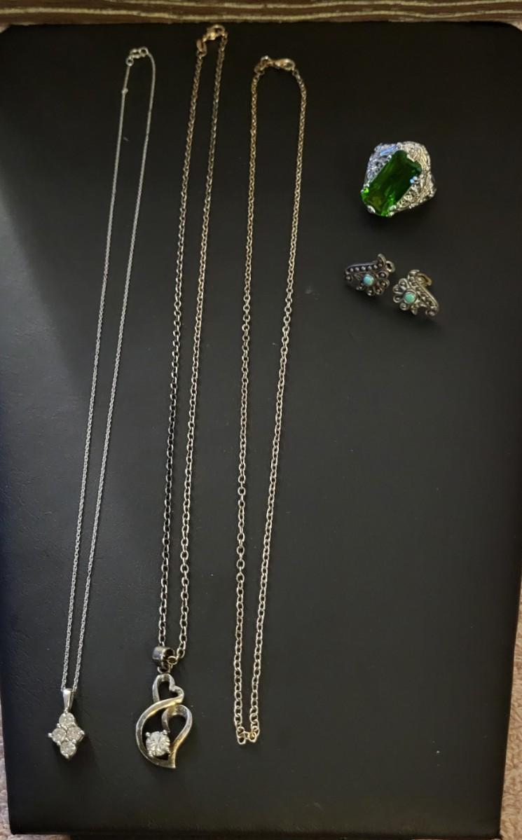STERLING SILVER NECKLACES, EARRINGS AND A SIZE 8 RING 18g