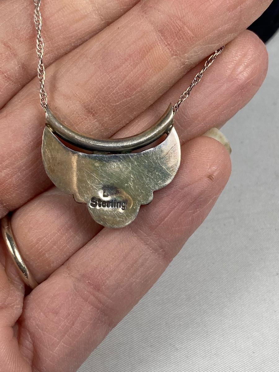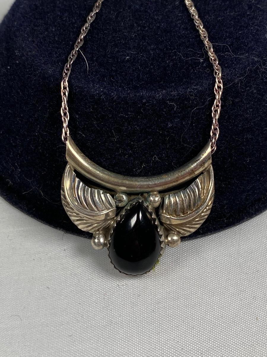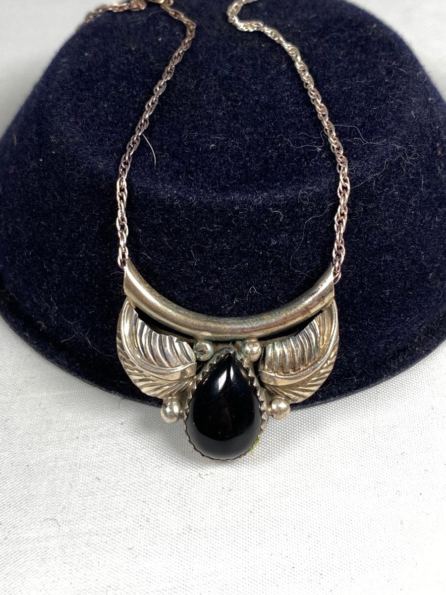 Southwestern sterling silver & onyx sliding pendant necklace. Stamped sterling on the back, there looks to be something else stamped above it but can't make it out. Chain is only about 8" length. Pendant is about 1" size. In good condition.