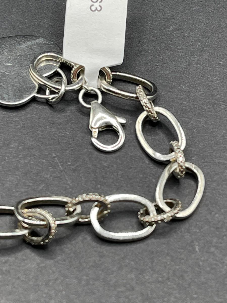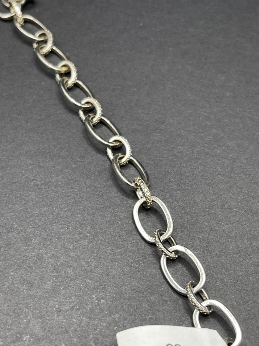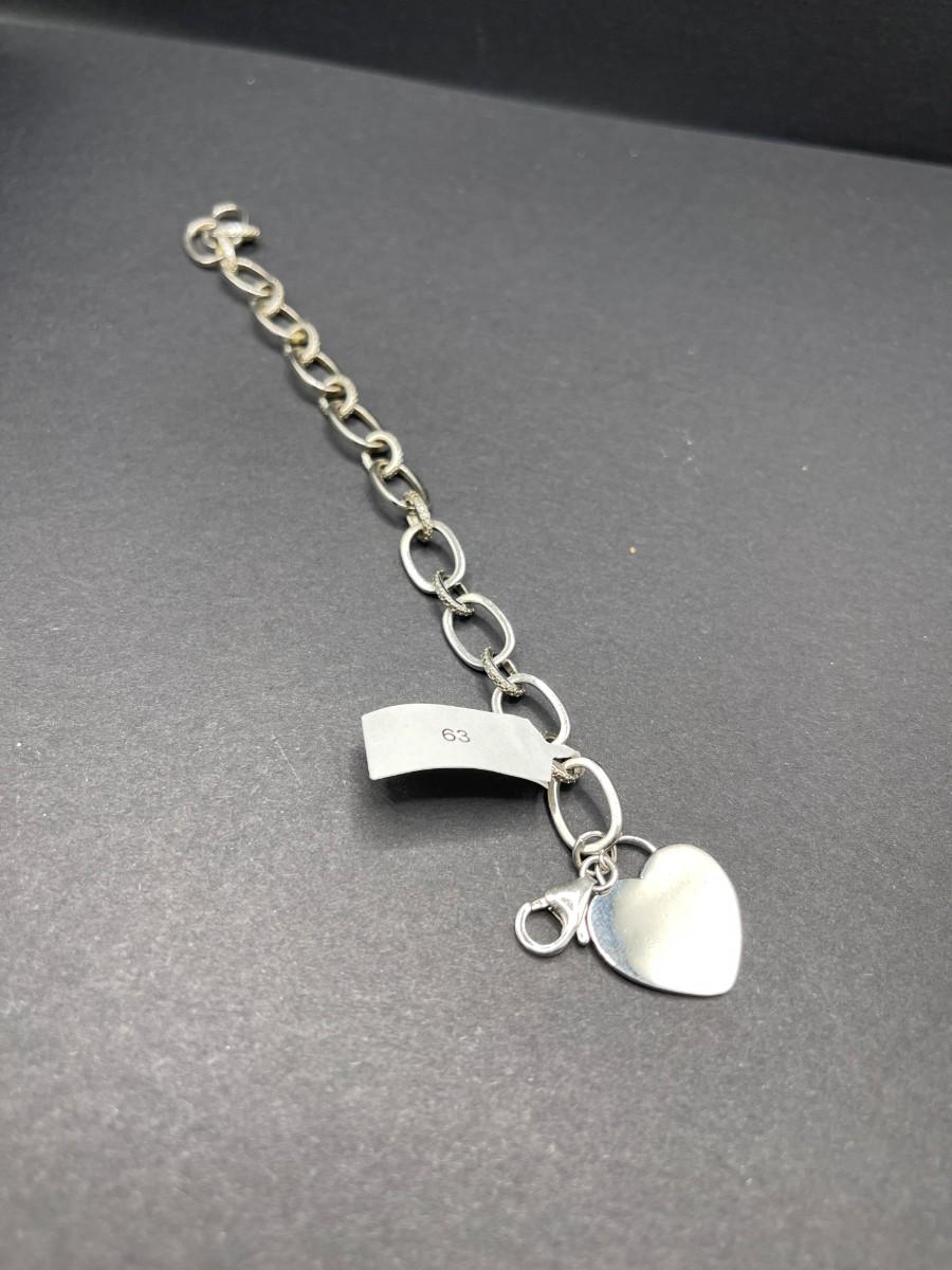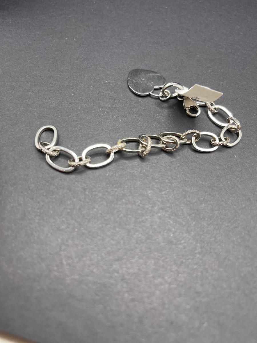 Sterling silver oval link bracelet with tiny diamonds and heart shaped charm. 7 1/2". .46 ozt.