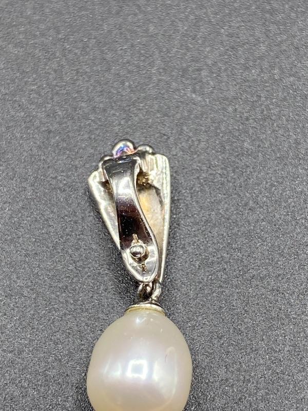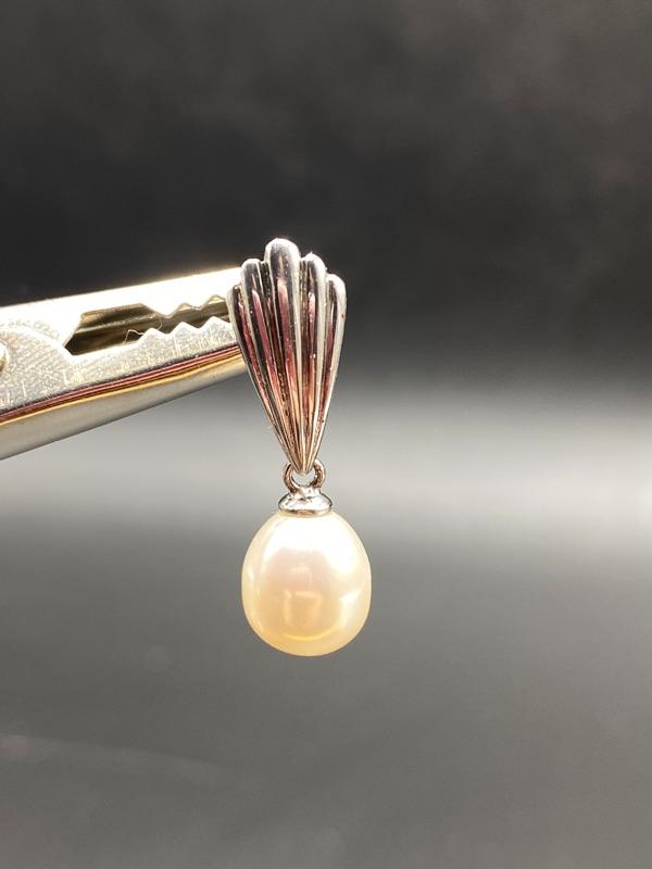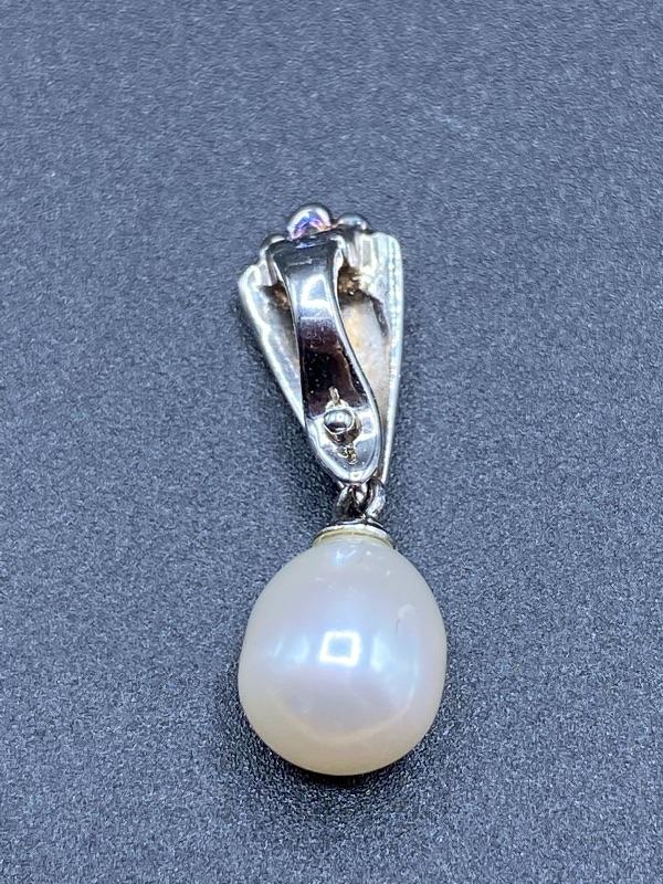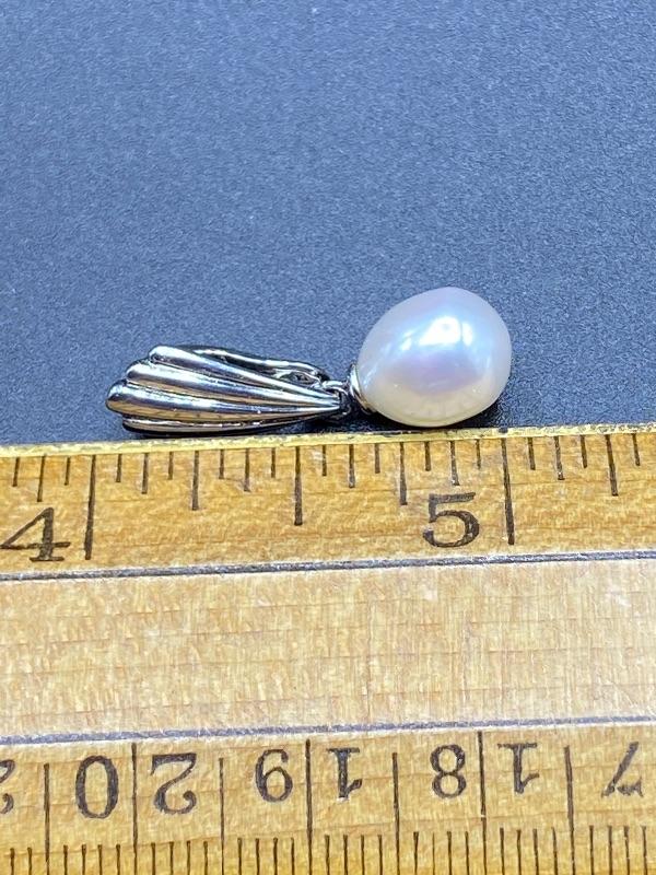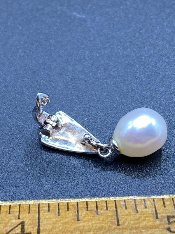 Simple but elegant pearl pendant charm. Sterling silver setting. Hinged for easy placement and removeable between necklaces. About 1" total length.