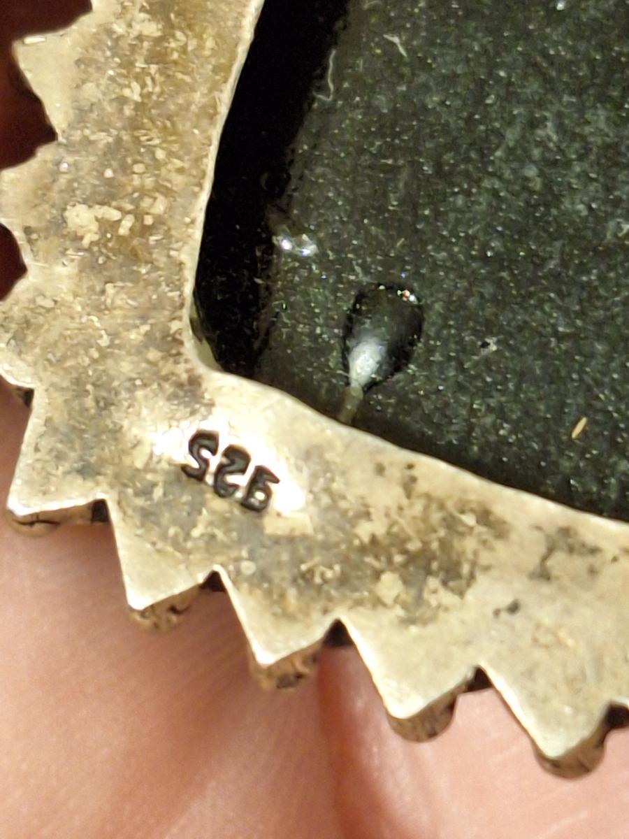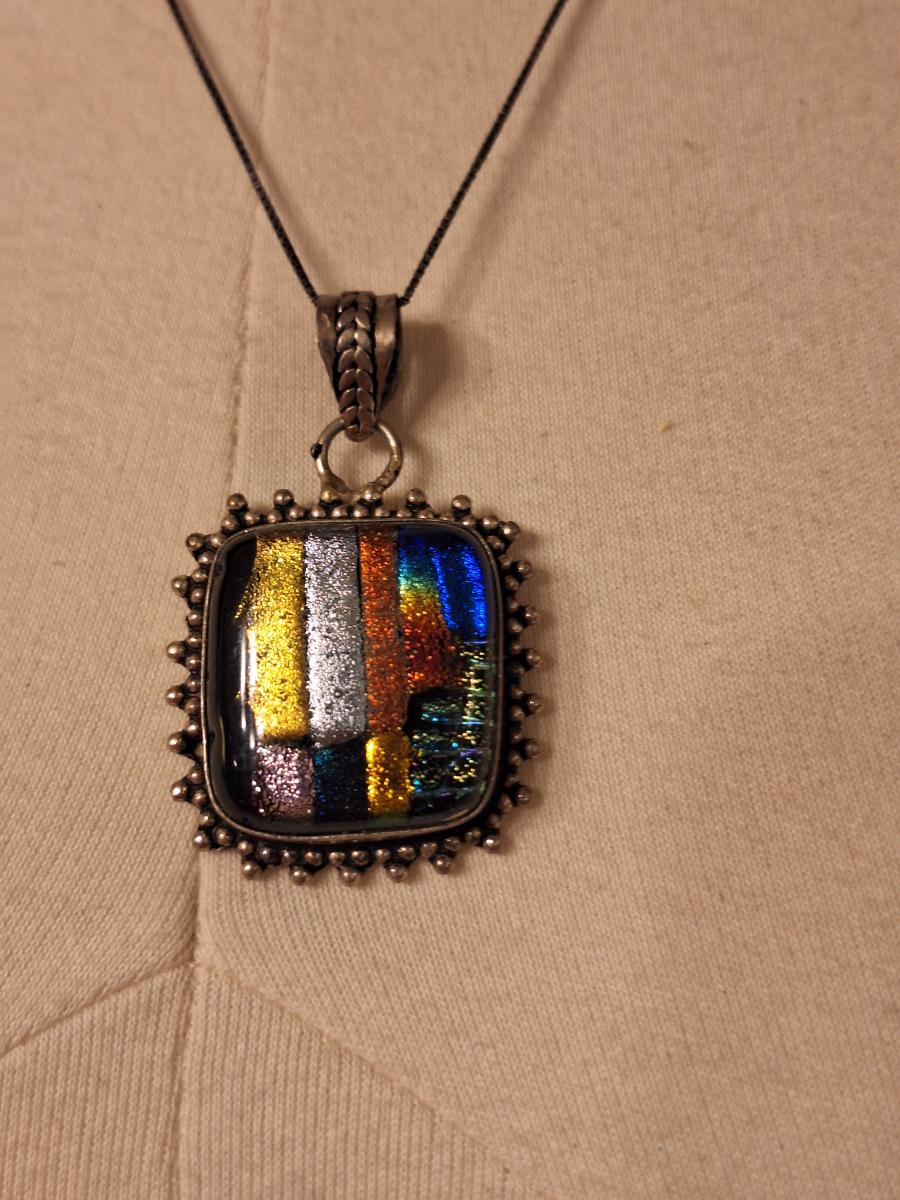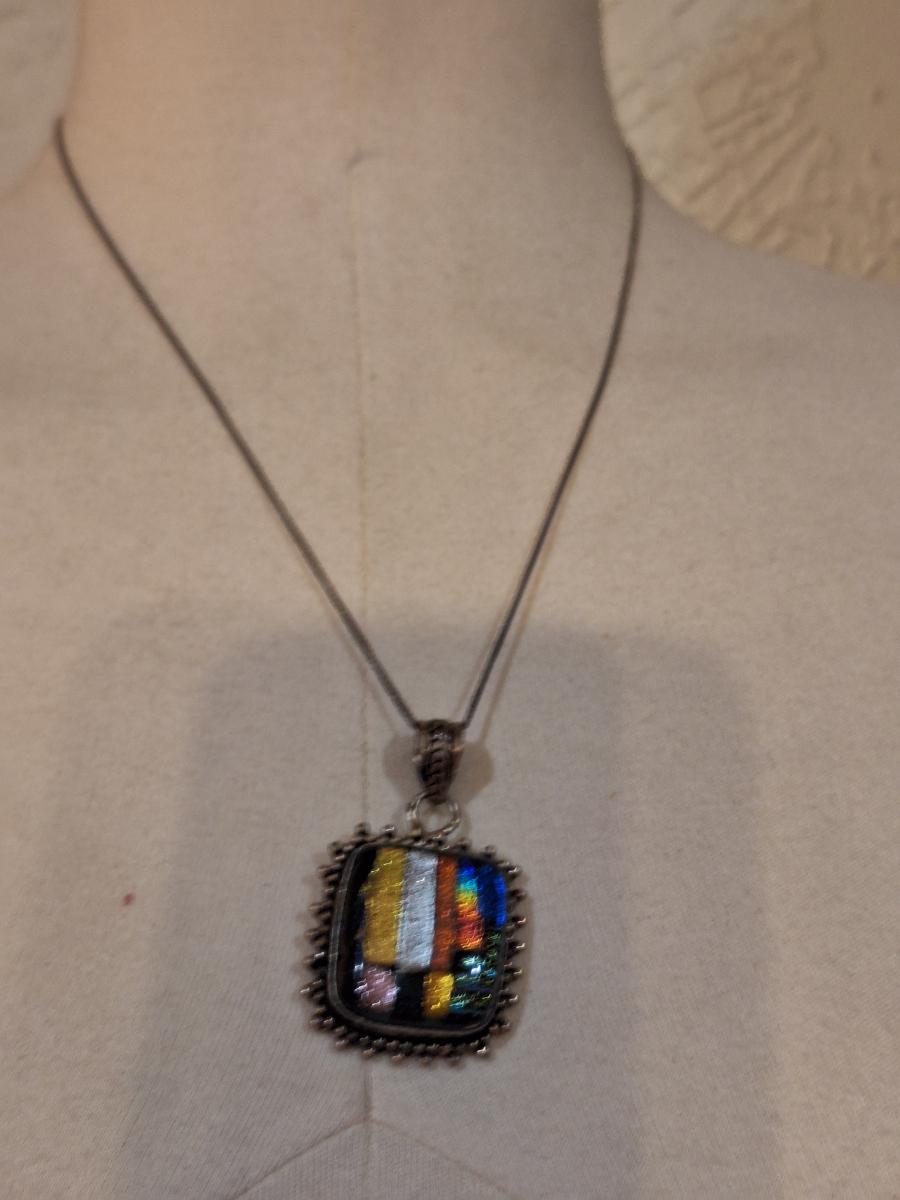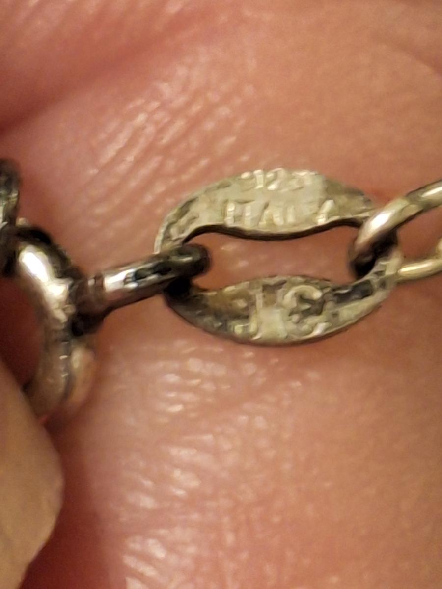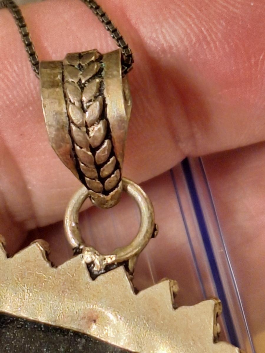 we are not sure what this is made of, please see all photos. The pendant and necklace are both marked sterling.