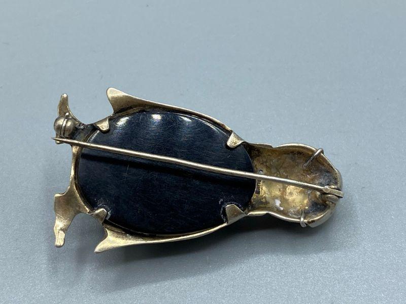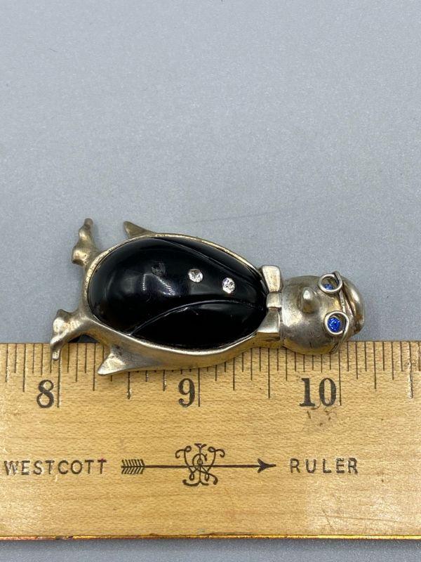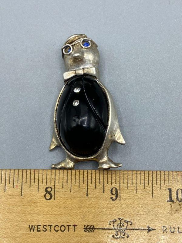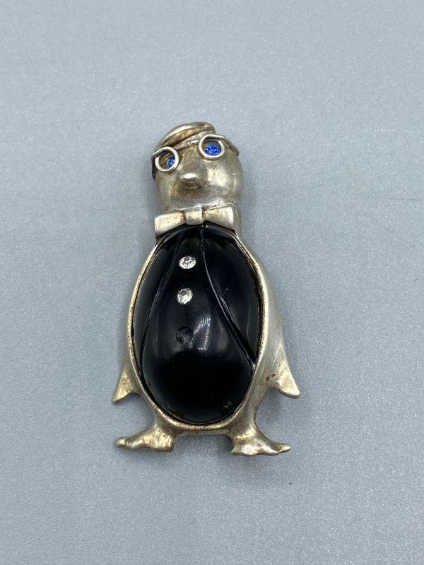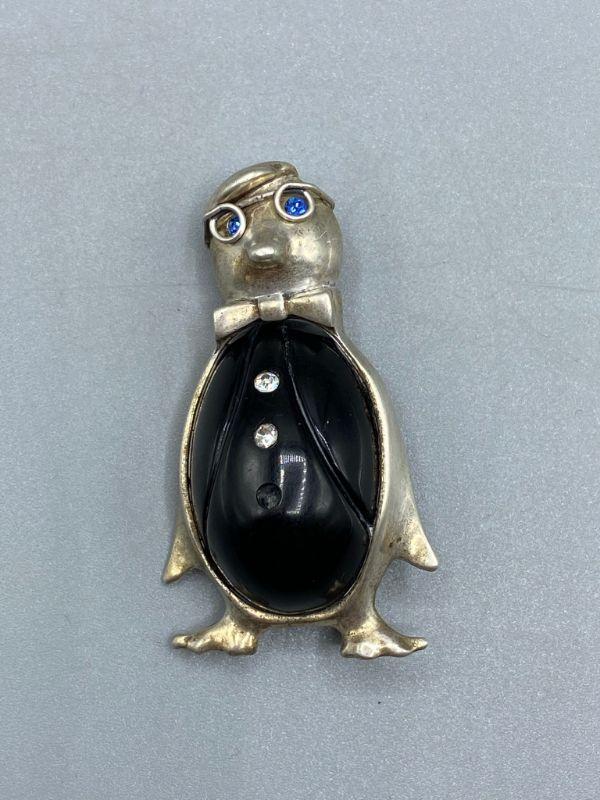 Cute vintage sterling silver penguin pin. Black body with rhinestone buttons, missing one but ok without, Blue rhinestone eyes. Stamped sterling on the back. Good size, measures about 1" wide and 2" tall.