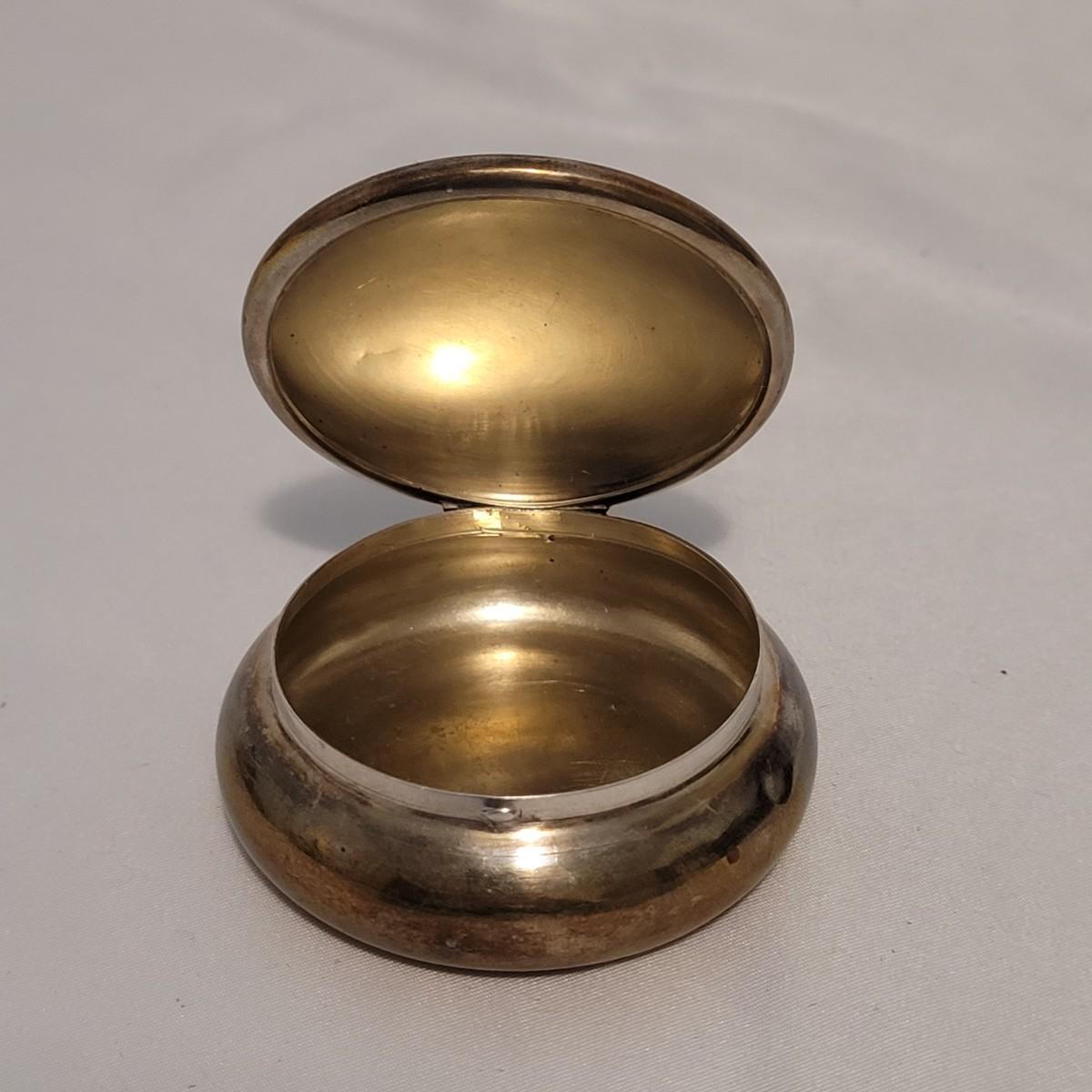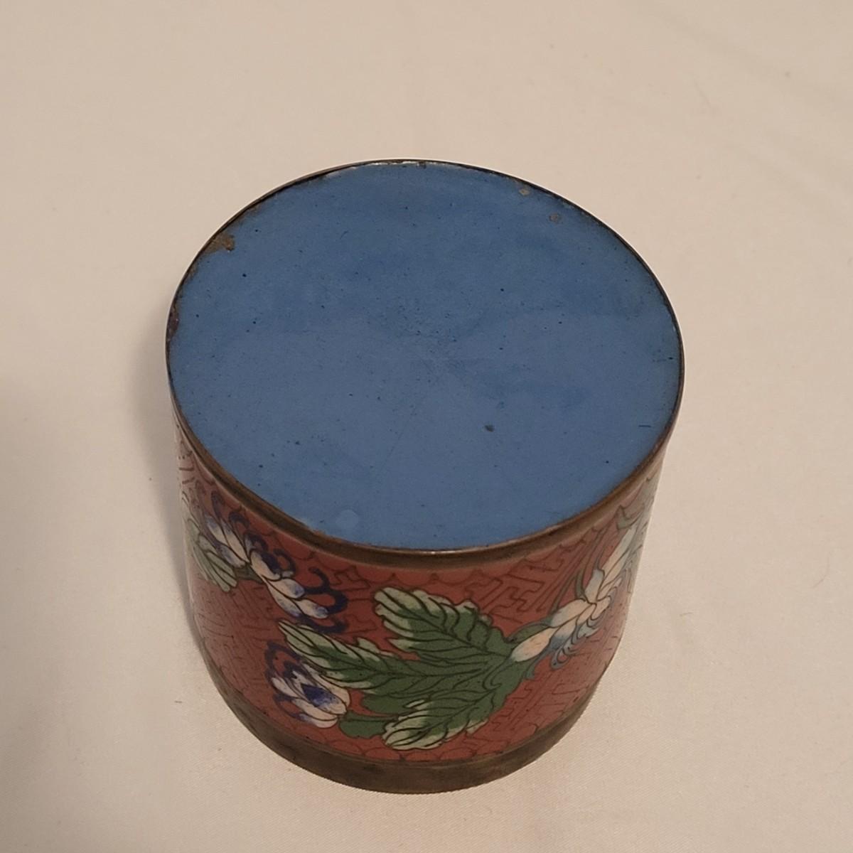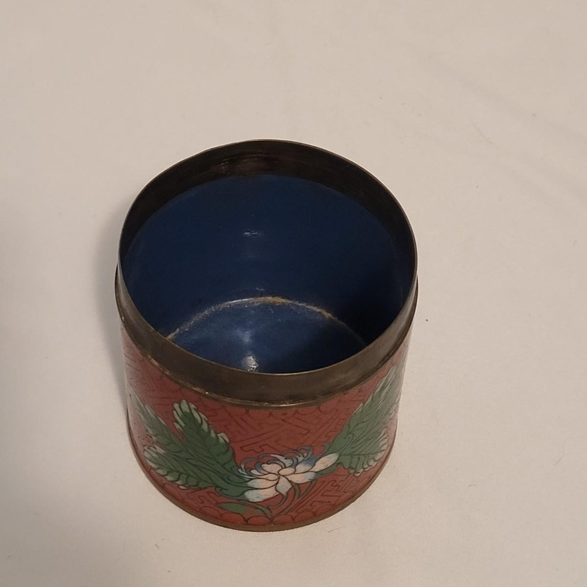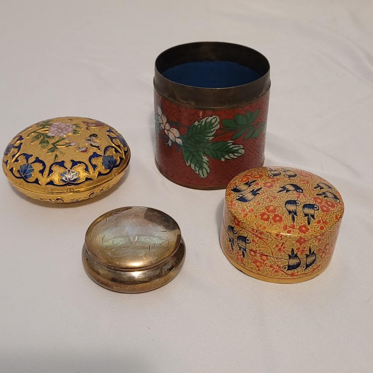 Lot of four different vintage containers. Sterling silver pill box and three trinket containers, one is wooden, and two are metal and appear to be cloisonne. The sterling container is stamped while the other three have no markings. The largest container measures 3" x 3" x 3"H and is missing its lid.
