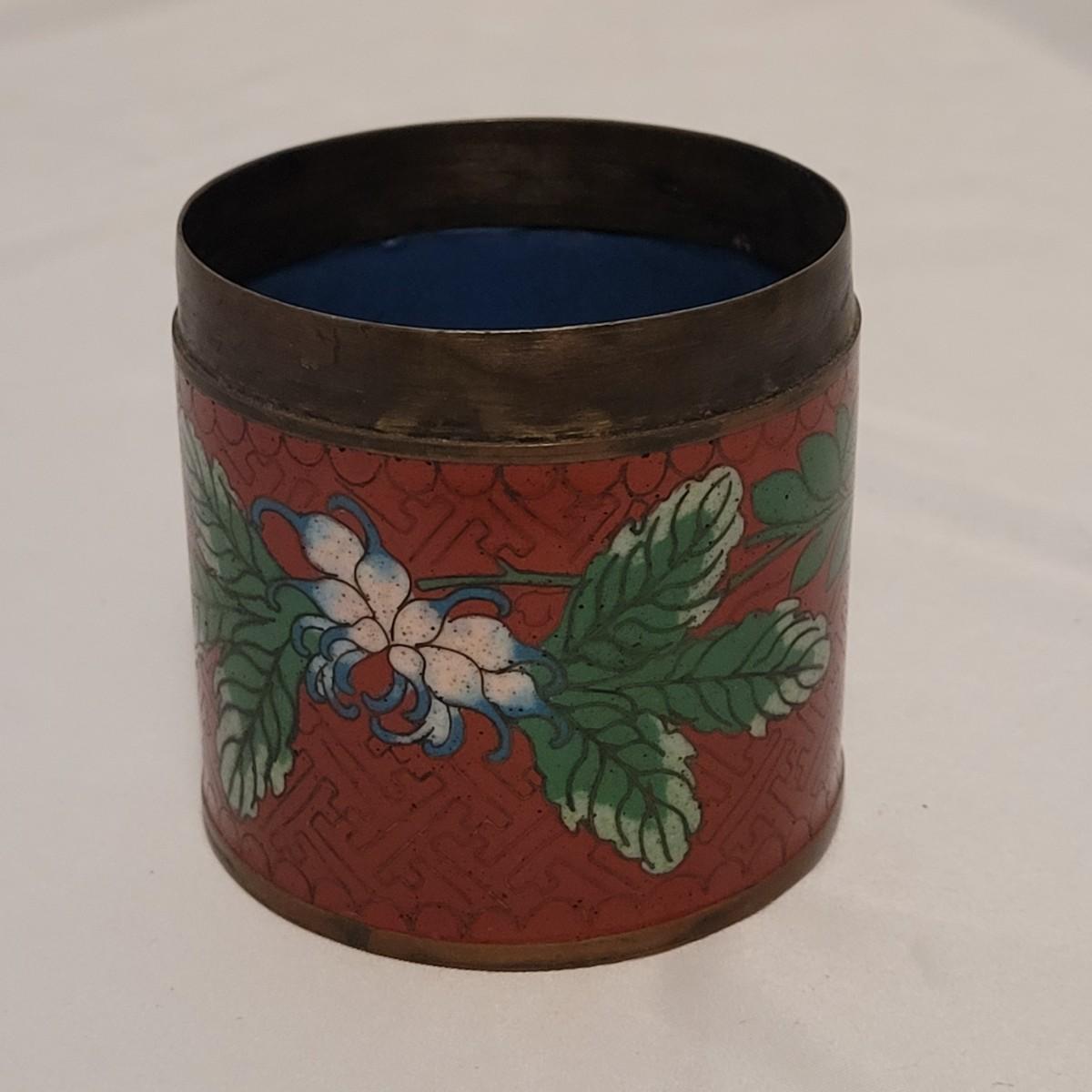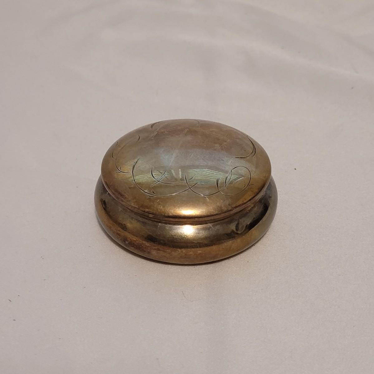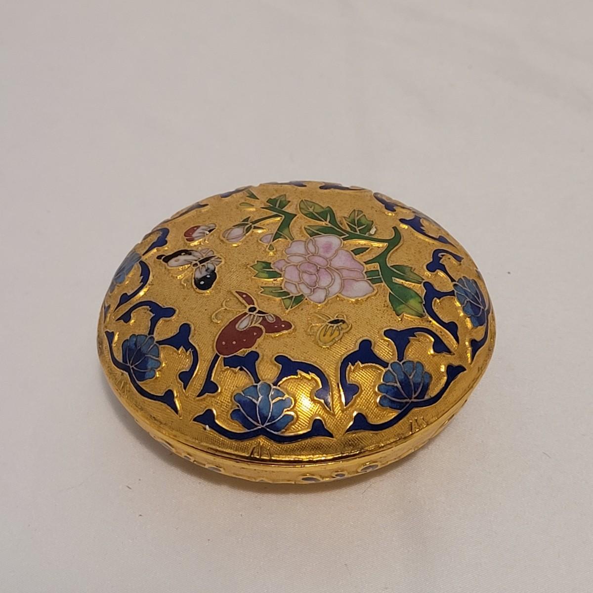 Lot of four different vintage containers. Sterling silver pill box and three trinket containers, one is wooden, and two are metal and appear to be cloisonne. The sterling container is stamped while the other three have no markings. The largest container measures 3" x 3" x 3"H and is missing its lid.