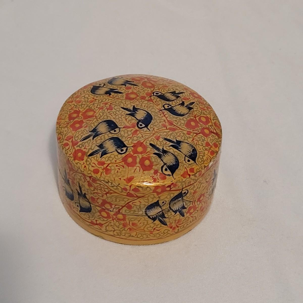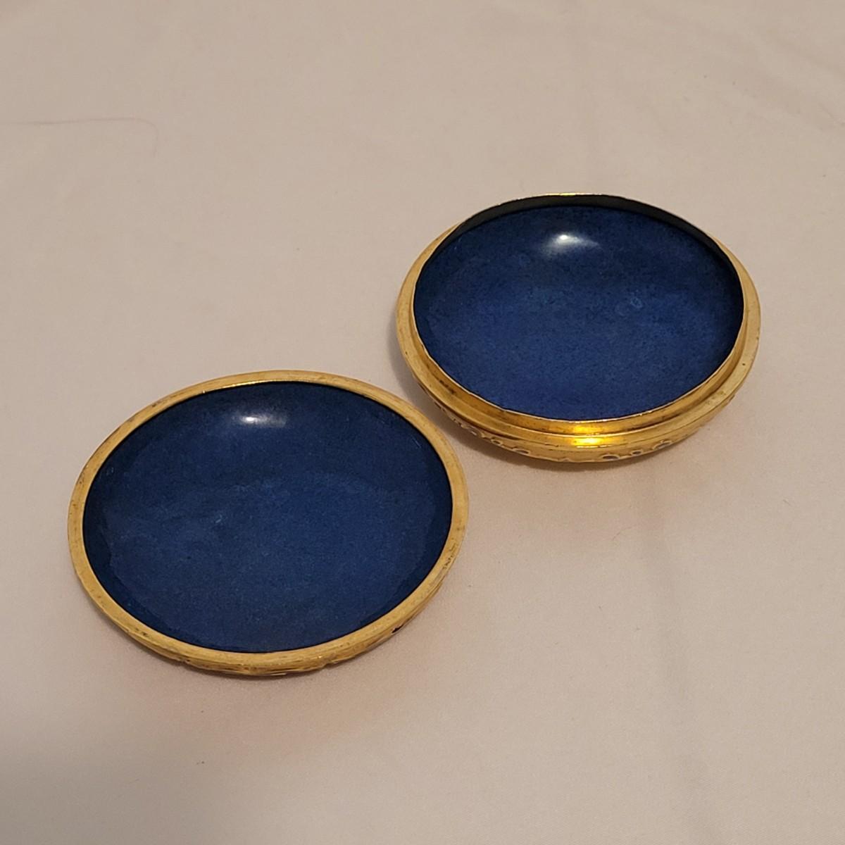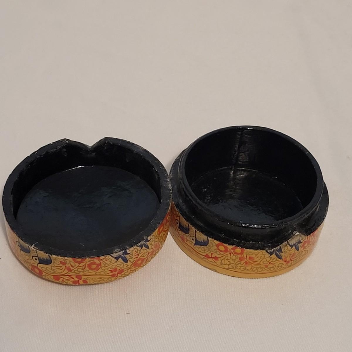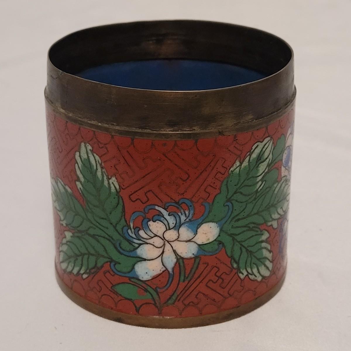 Lot of four different vintage containers. Sterling silver pill box and three trinket containers, one is wooden, and two are metal and appear to be cloisonne. The sterling container is stamped while the other three have no markings. The largest container measures 3" x 3" x 3"H and is missing its lid.